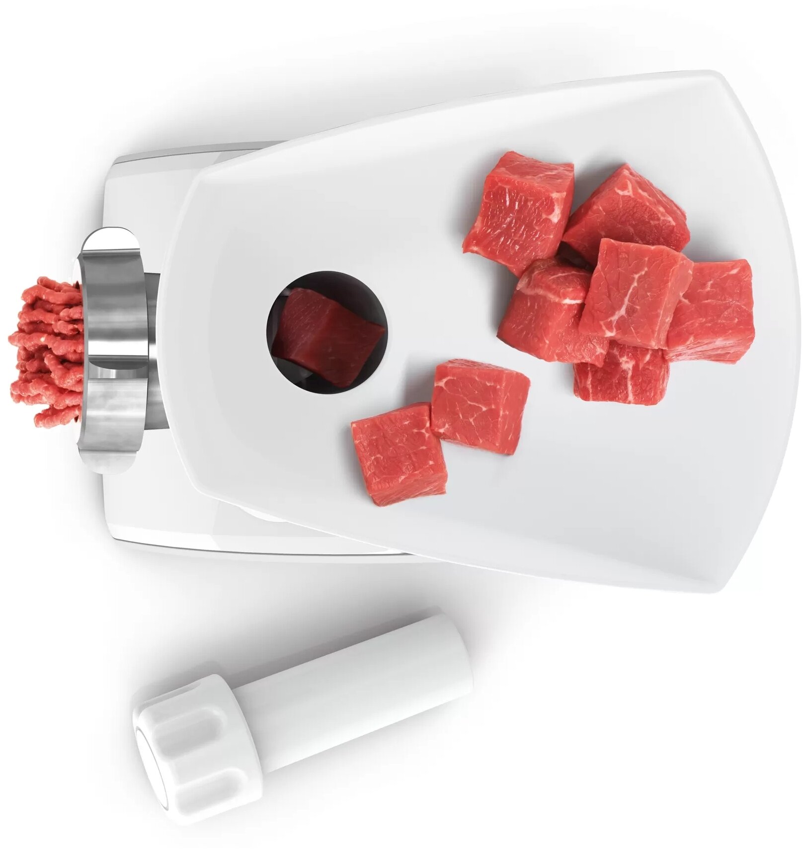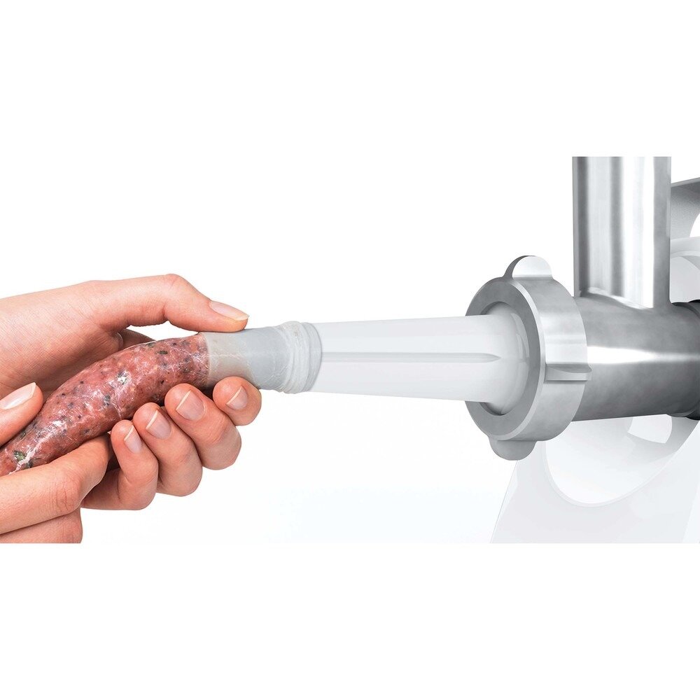 защита от перегрузки, отсек для сетевого шнура, отсек для хранения насадок, прорезиненные ножки, Защита от перегрузки (автоматический предохранитель), насадки для приготовления колбас, толкатель