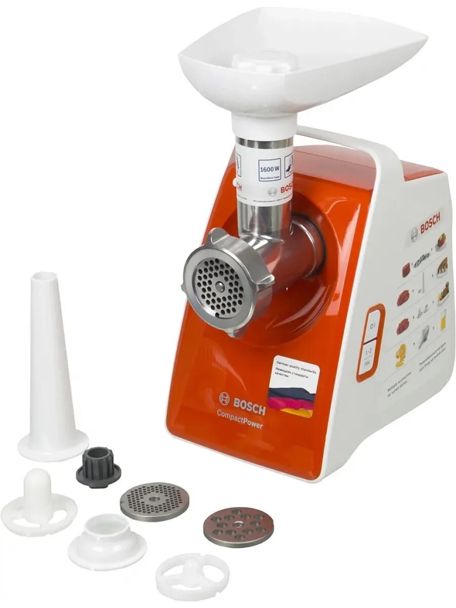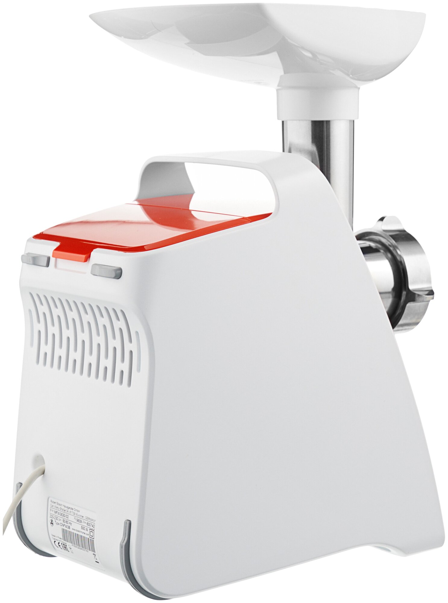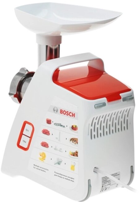 защита от перегрузки, мытье в посудомоечной машине, отсек для сетевого шнура, отсек для хранения насадок, прорезиненные ножки, Защита от перегрузки (автоматический предохранитель), Съемный резак, защита двигателя от перегрузки, защита двигателя от перегрузки, система реверса, отсек для хранения насадок, прорезиненные ножки, насадки для приготовления колбас, система реверса, толкатель
