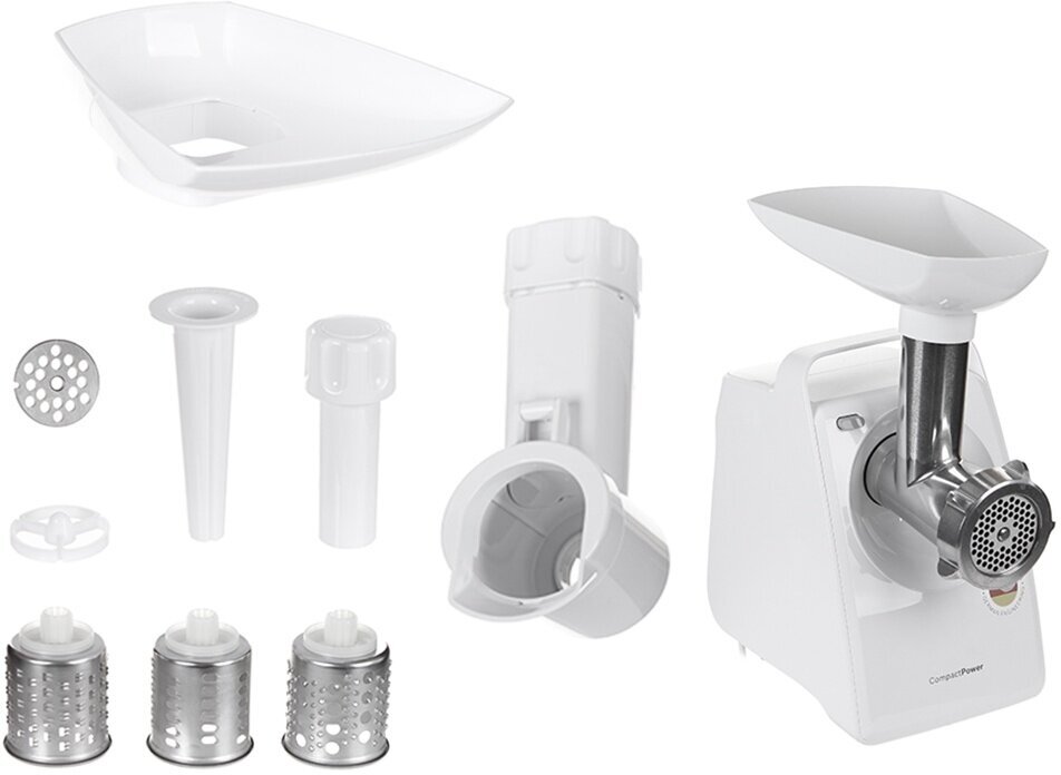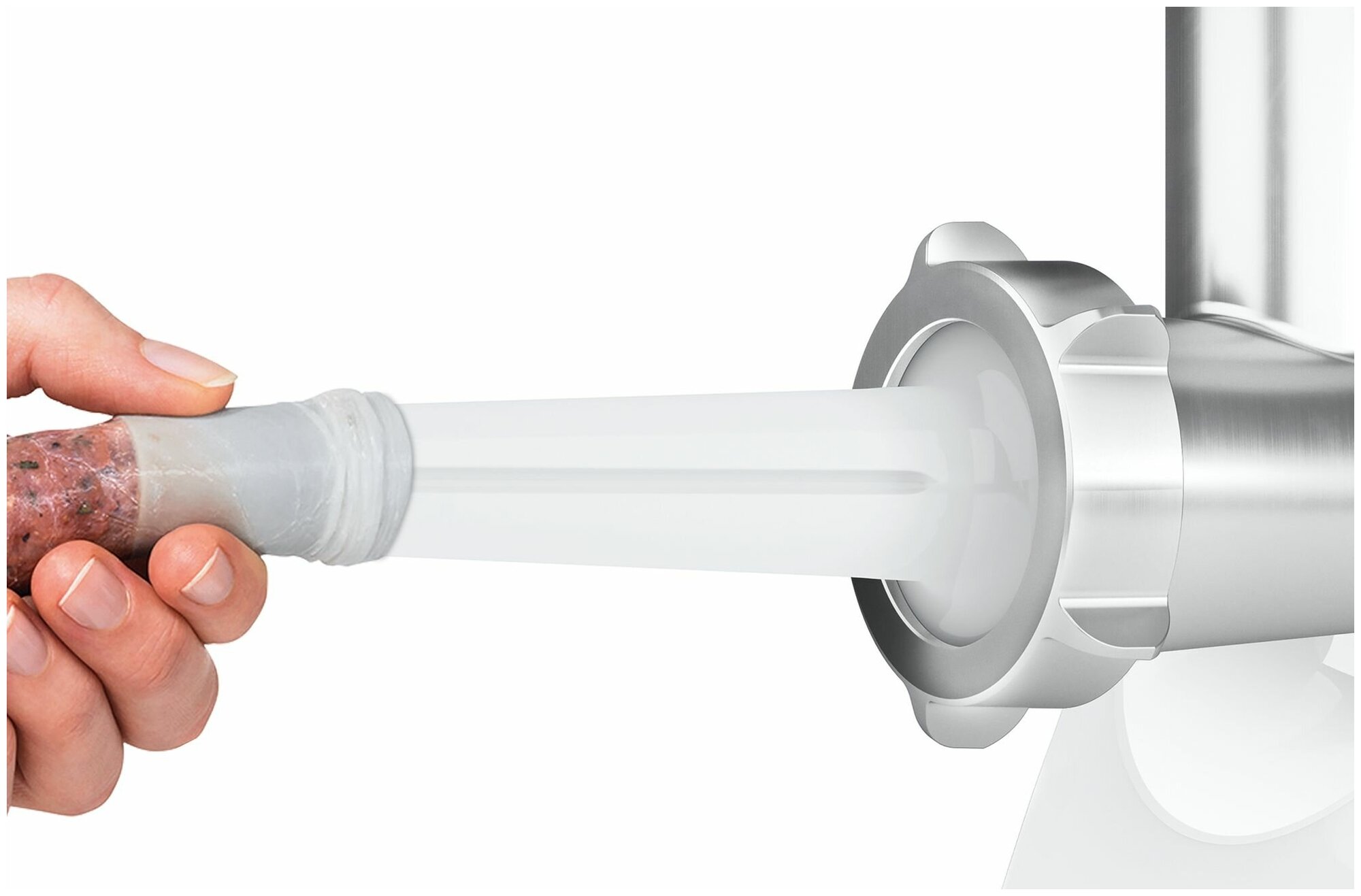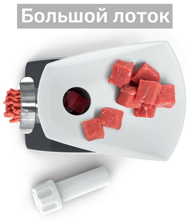 защита от перегрузки, отсек для сетевого шнура, отсек для хранения насадок, прорезиненные ножки, Автоотключение, Защита от перегрузки (автоматический предохранитель), насадки для приготовления колбас, толкатель