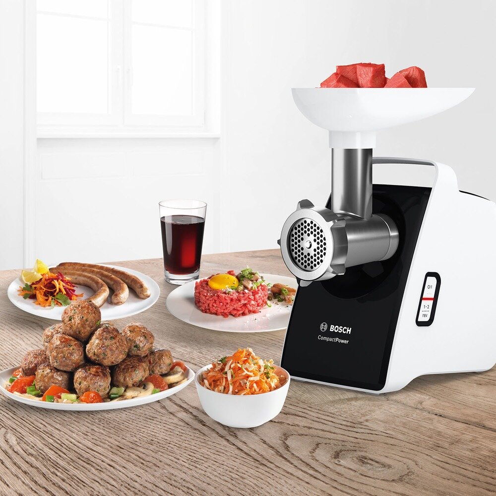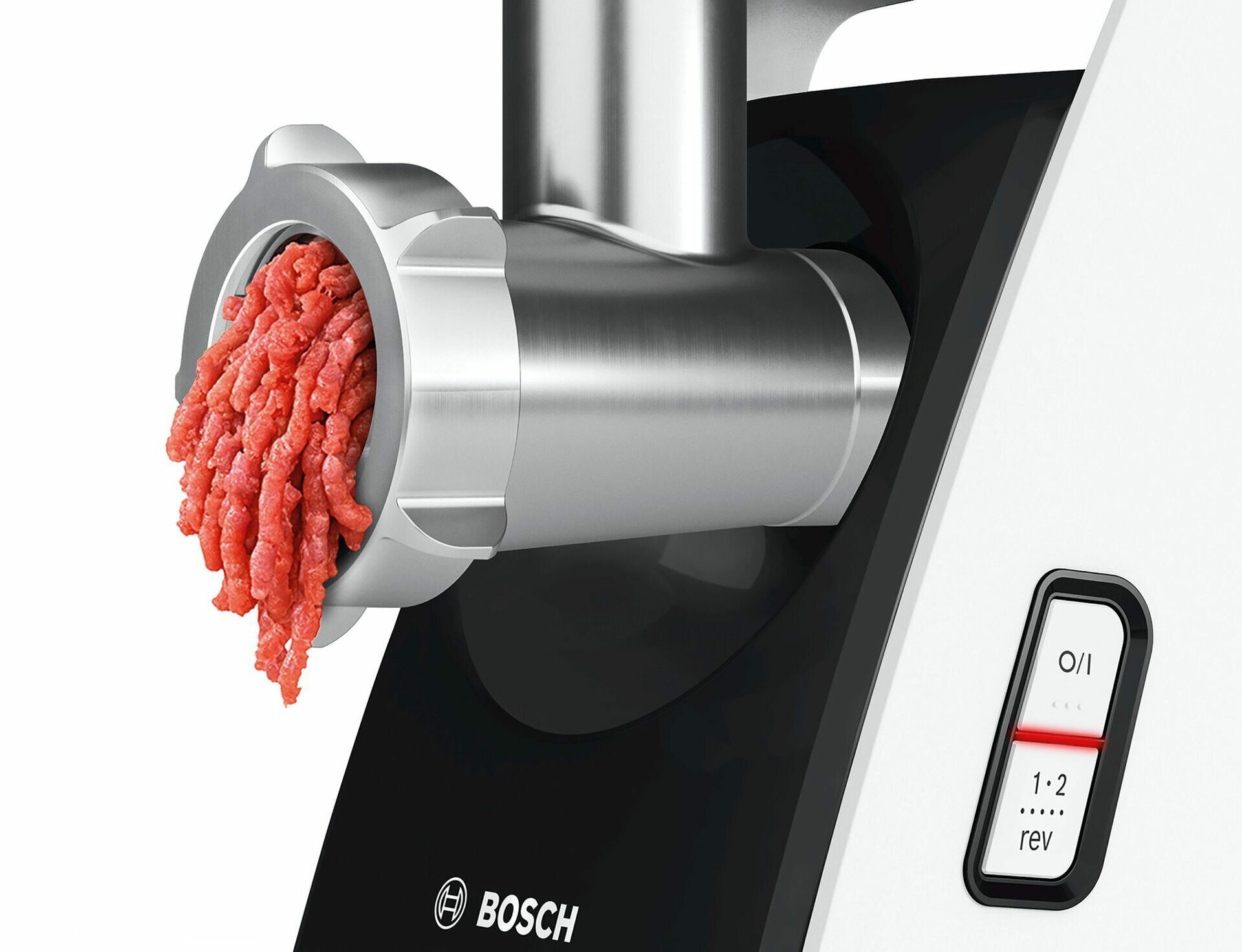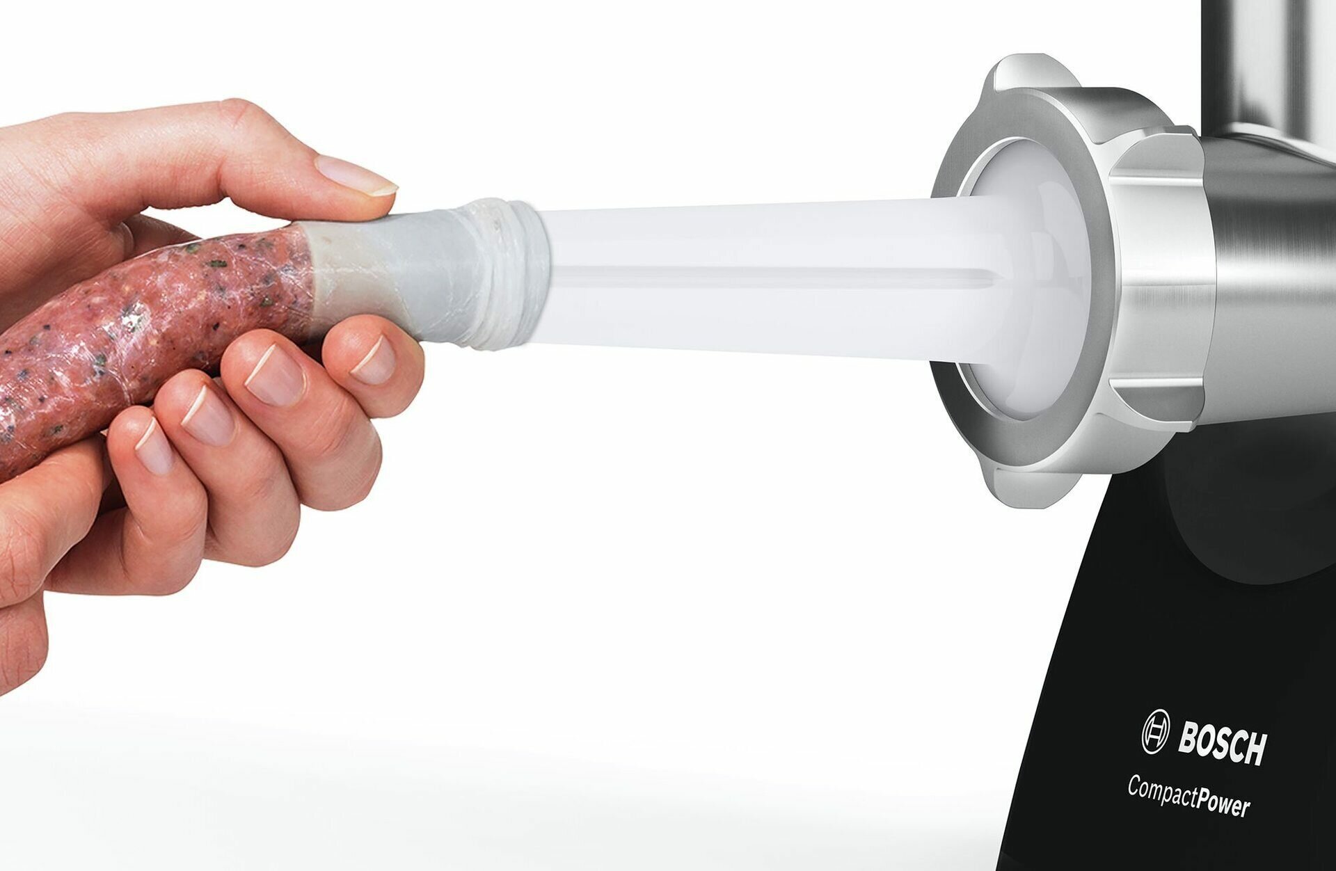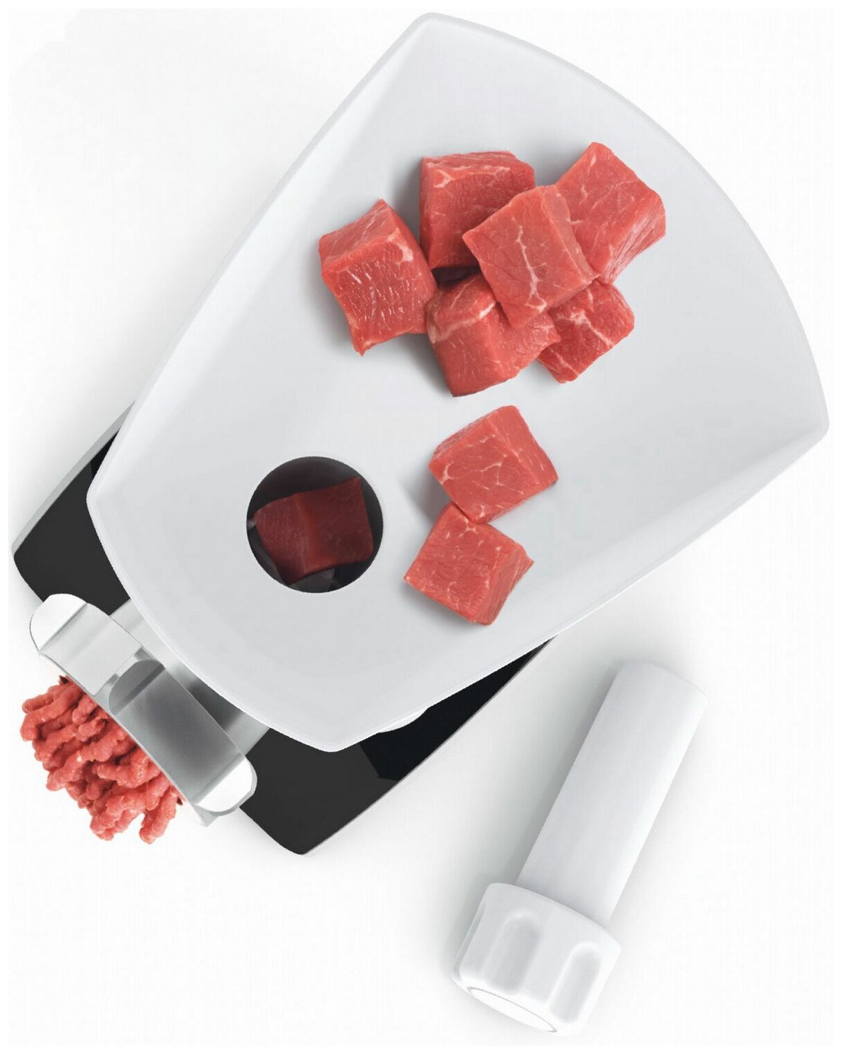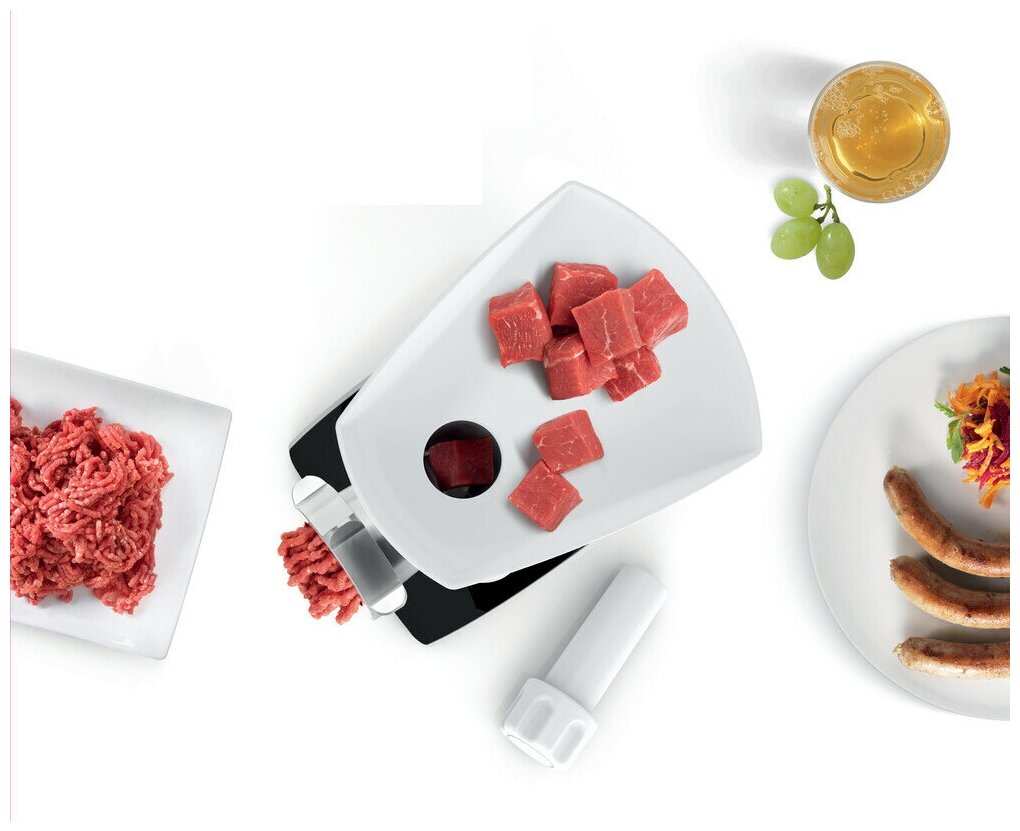 защита от перегрузки, мытье в посудомоечной машине, отсек для сетевого шнура, отсек для хранения насадок, прорезиненные ножки, насадки для приготовления колбас, система реверса