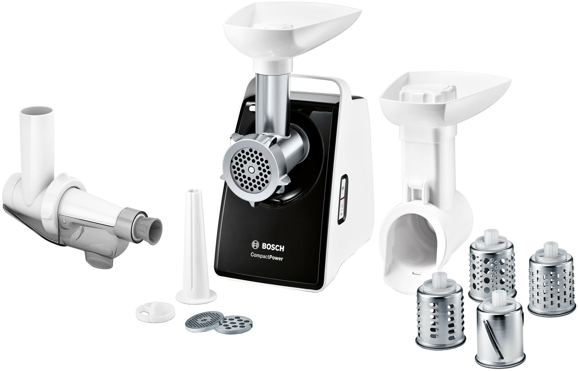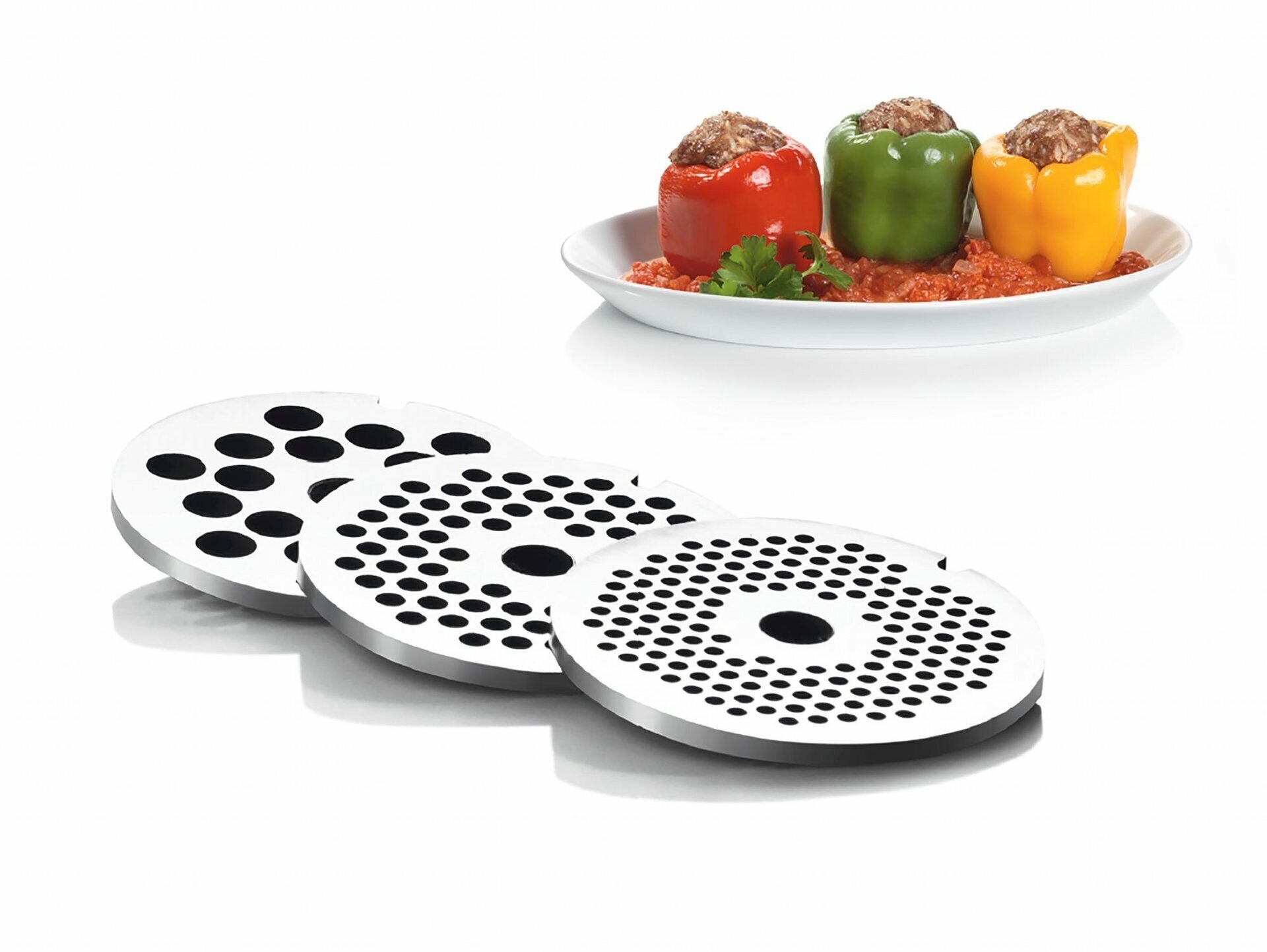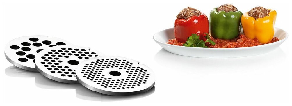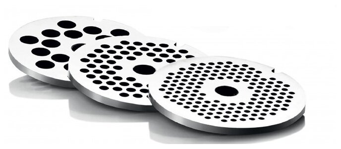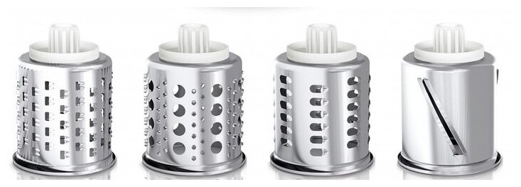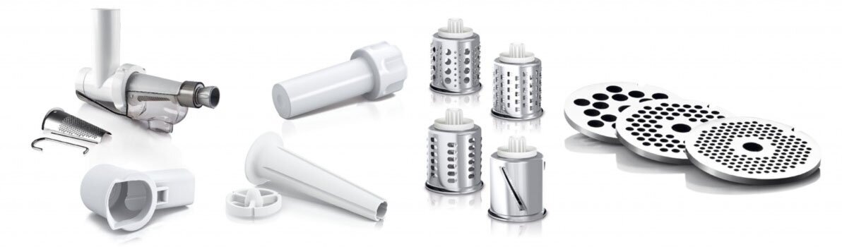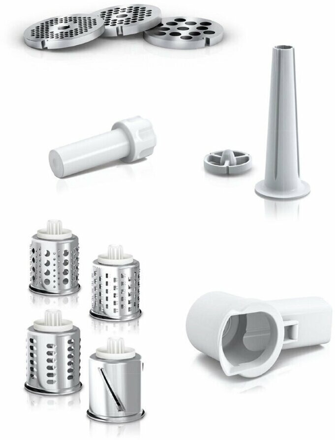 диск для фарша, насадка для приготовления колбас, насадка для шинковки, насадка-терка, соковыжималка, барабан для нарезки, для колбасок, для набивки сосисок и колбас, для шинковки овощей, крупная терка, мелкая терка, насадка для приготовления томатного сока, пресс для отжима сока