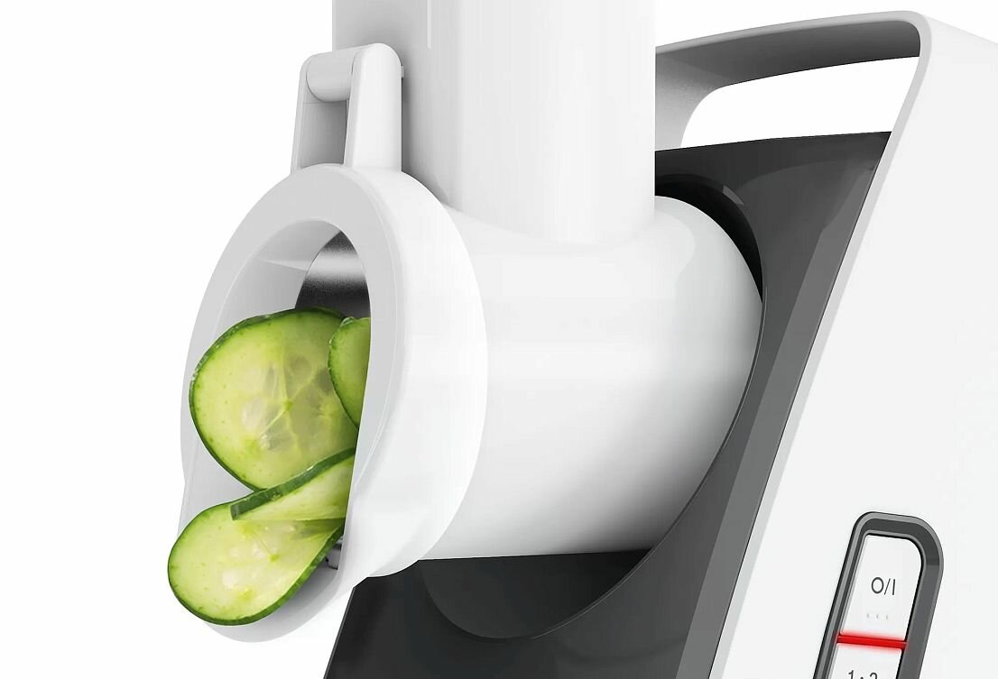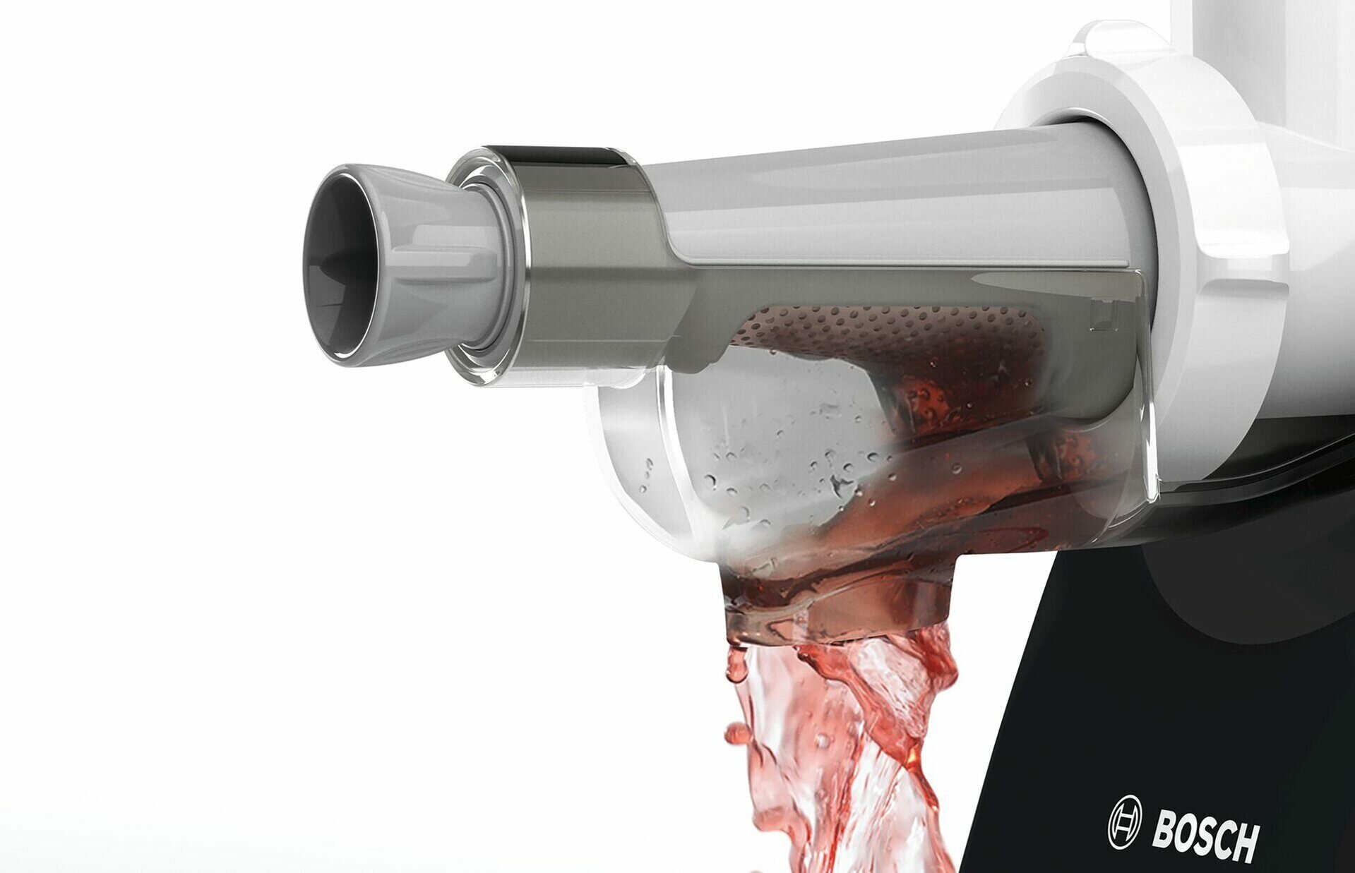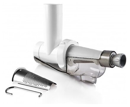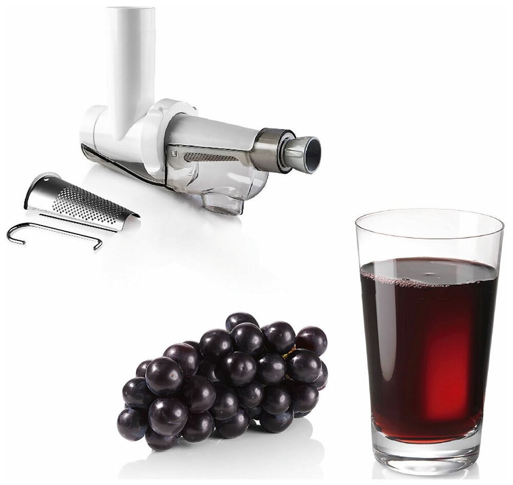 нож с двусторонней заточкой; большой загрузочный лоток с толкателем; пресс для отжима сока; материал лотка: пластик; количество насадок для приготовления колбас: 1; количество насадок-терок: 3; количество насадок для шинковки: 1