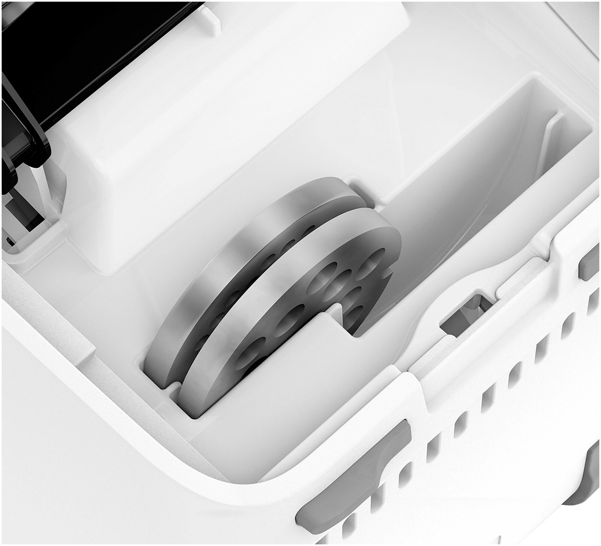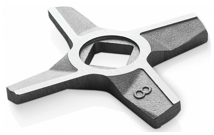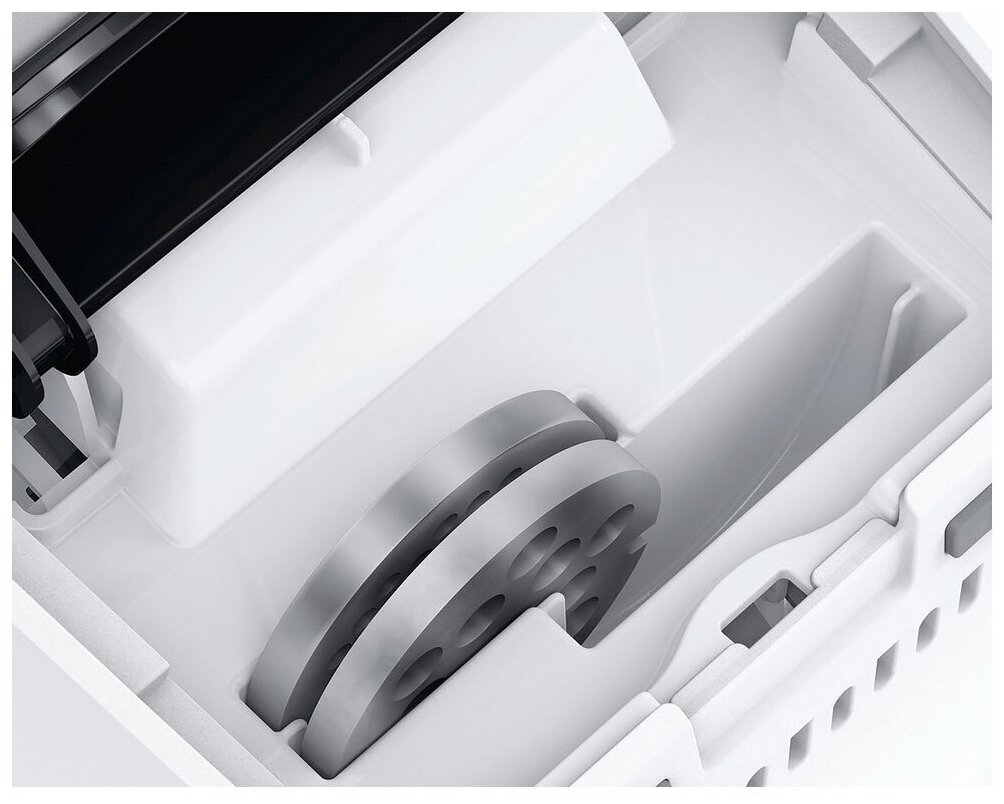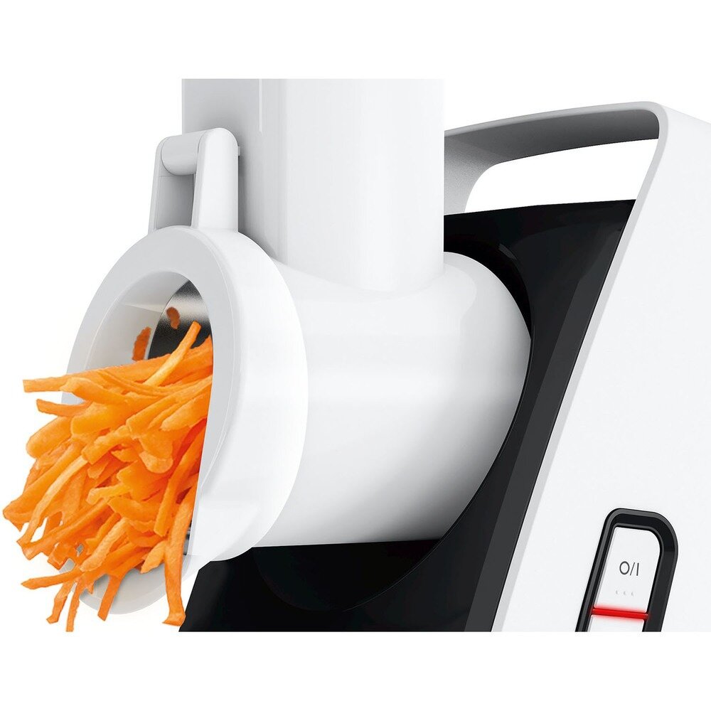 нож с двусторонней заточкой; большой загрузочный лоток с толкателем; пресс для отжима сока; материал лотка: пластик; количество насадок для приготовления колбас: 1; количество насадок-терок: 3; количество насадок для шинковки: 1