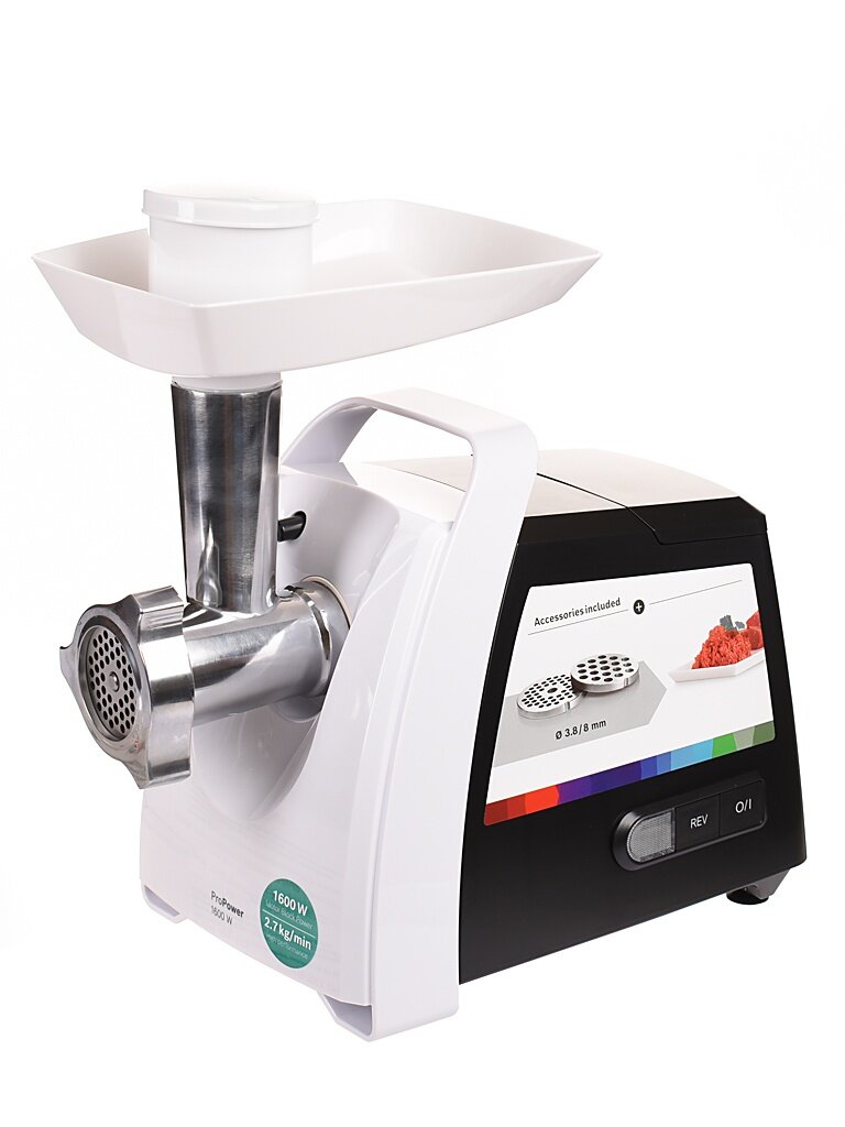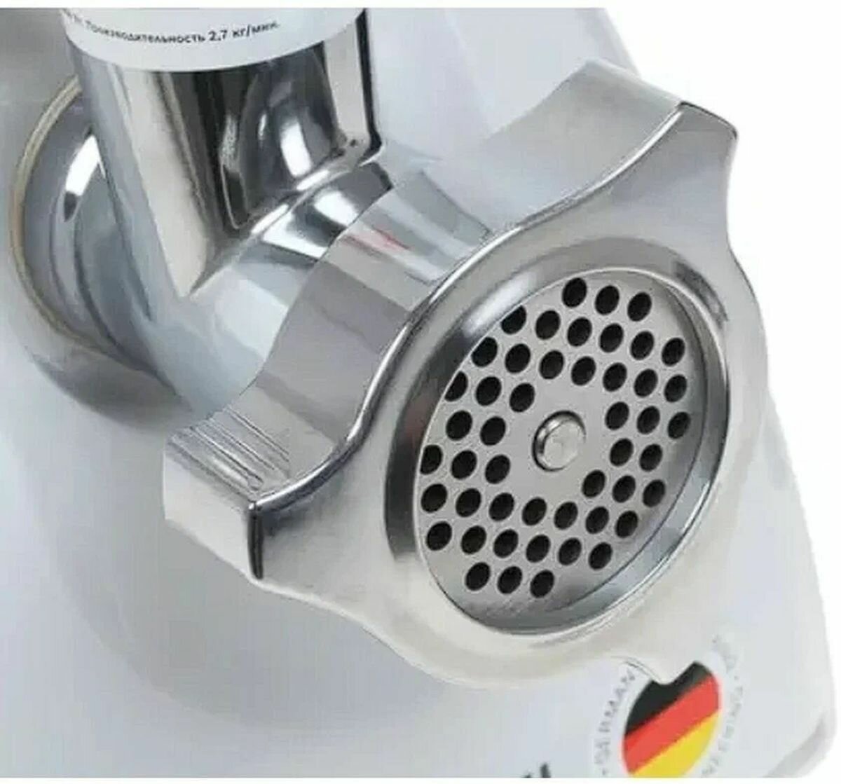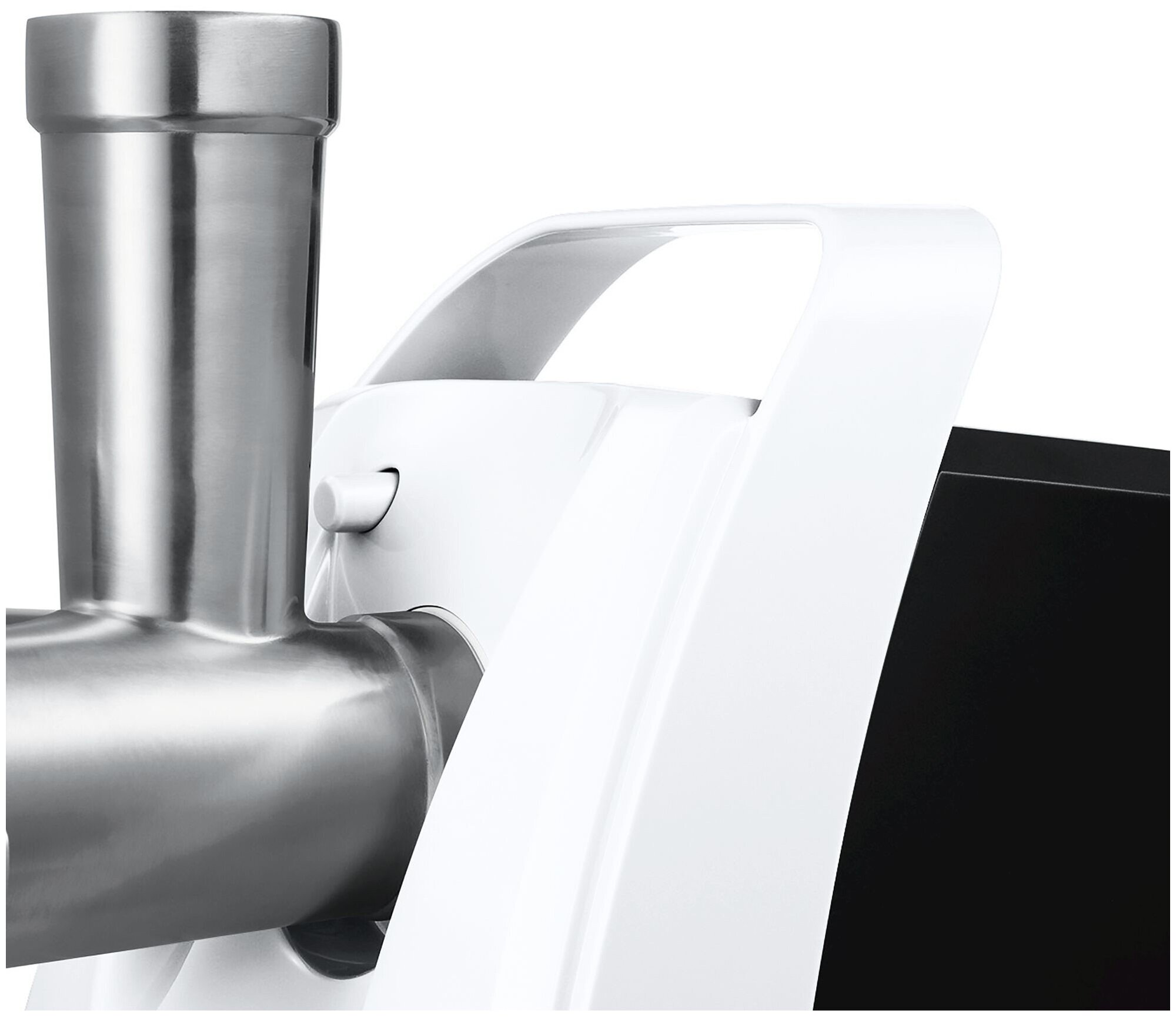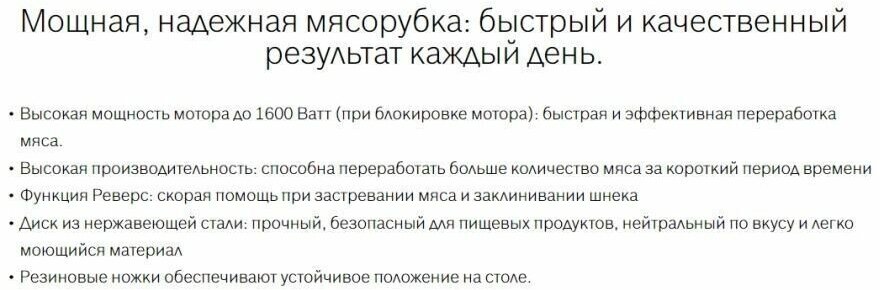 защита от перегрузки, отсек для сетевого шнура, отсек для хранения насадок, прорезиненные ножки, Защита от перегрузки (автоматический предохранитель), Кнопка для быстрого снятия насадок, Прорезиненная ручка, Режим Турбо, автоотключение, защита двигателя от перегрузки, насадки для колбасы и кеббе, отключение при перегреве, система блокировки, толкатель, функция реверса