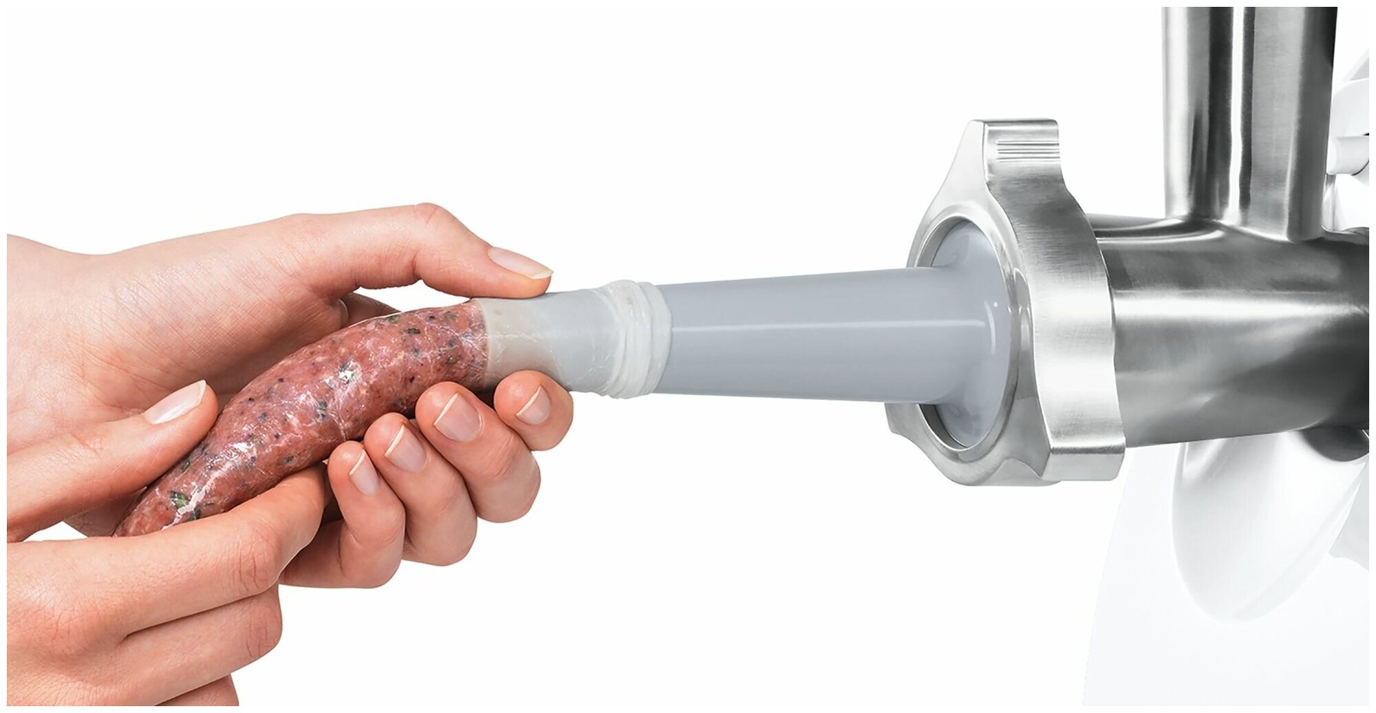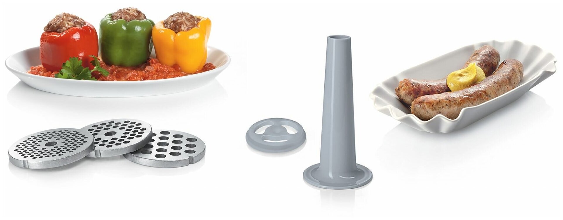отсек для хранения насадок, прорезиненные ножки, насадки для приготовления колбас