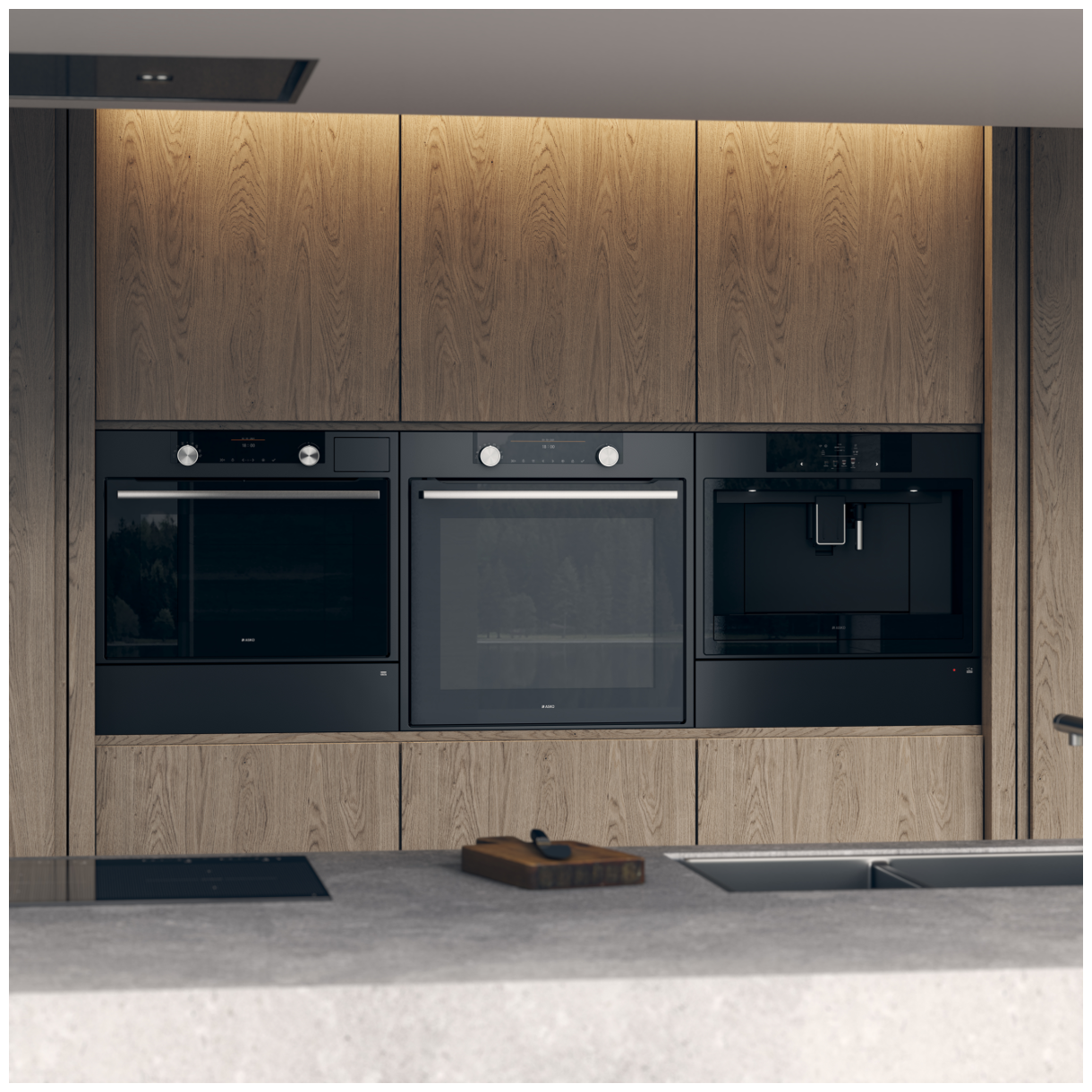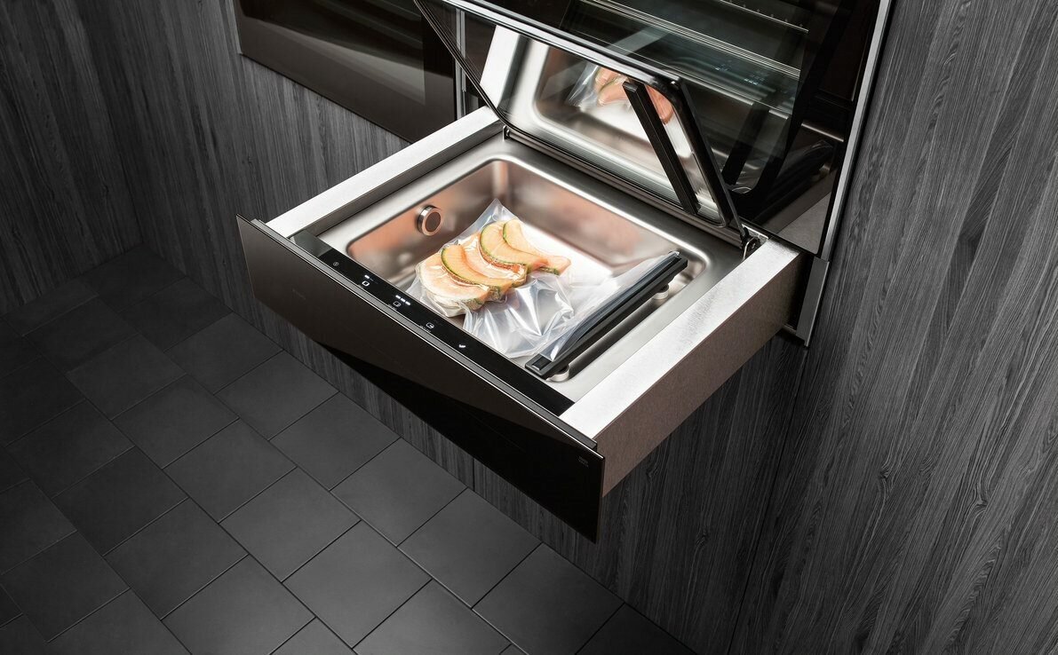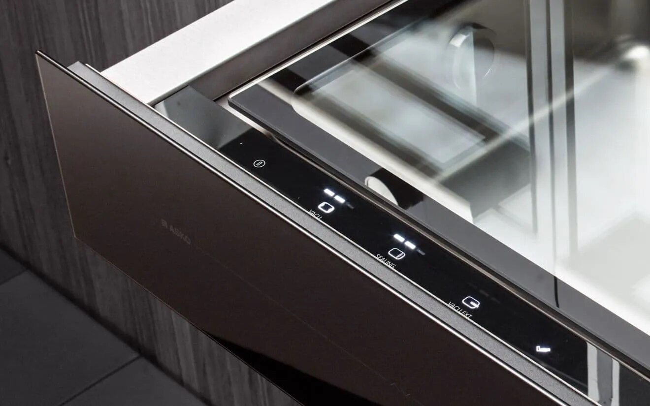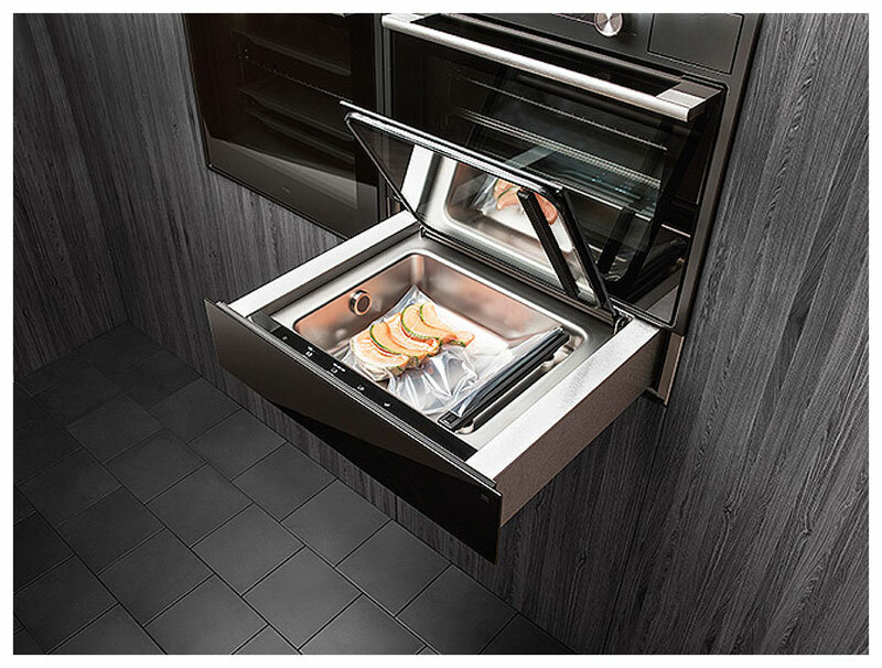 встраиваемый; ящик на телескопических направляющих; нажимной механизм открывания; три уровня запайки для пакетов различной толщины