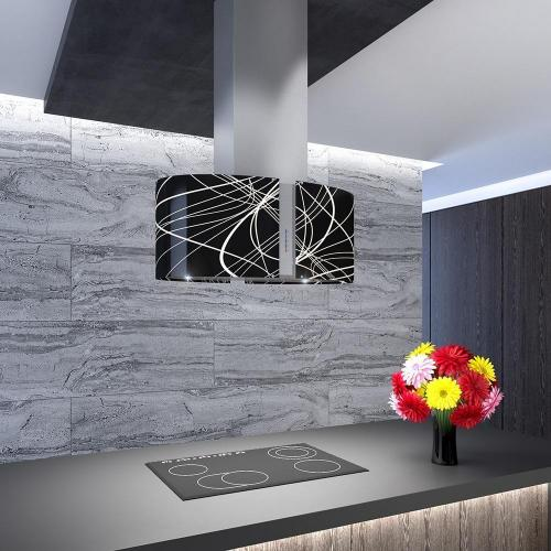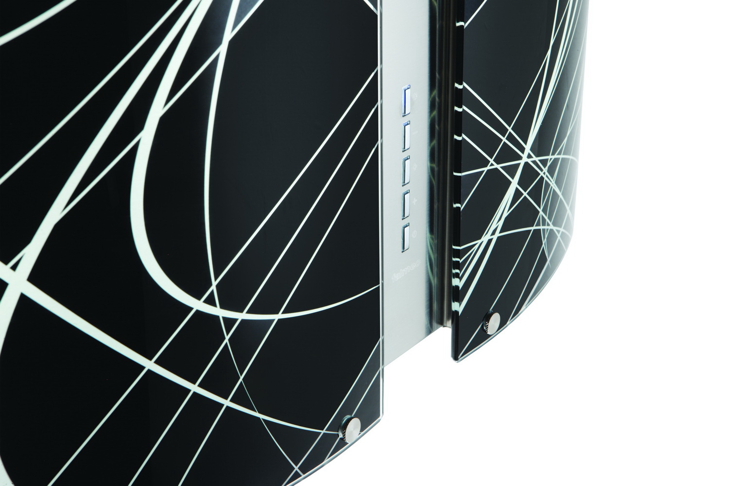 Сталь AISI 304 с эффектом щетки Отделка матовым закаленным стеклом Декоративная подсветка с возможностью регулировки яркости Галогеновые лампы “easy open” Датчик освещения Периметральное втягивание с шумопоглощающей панелью