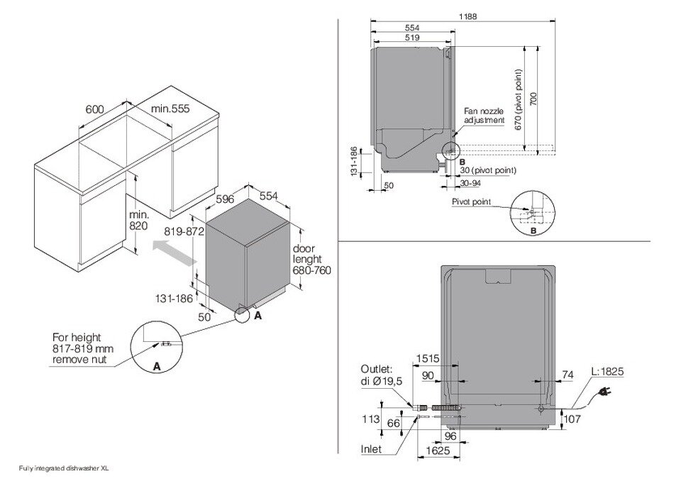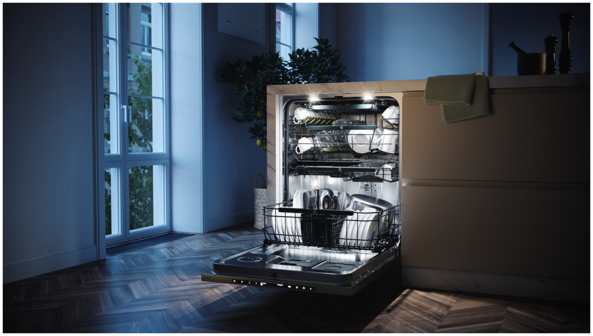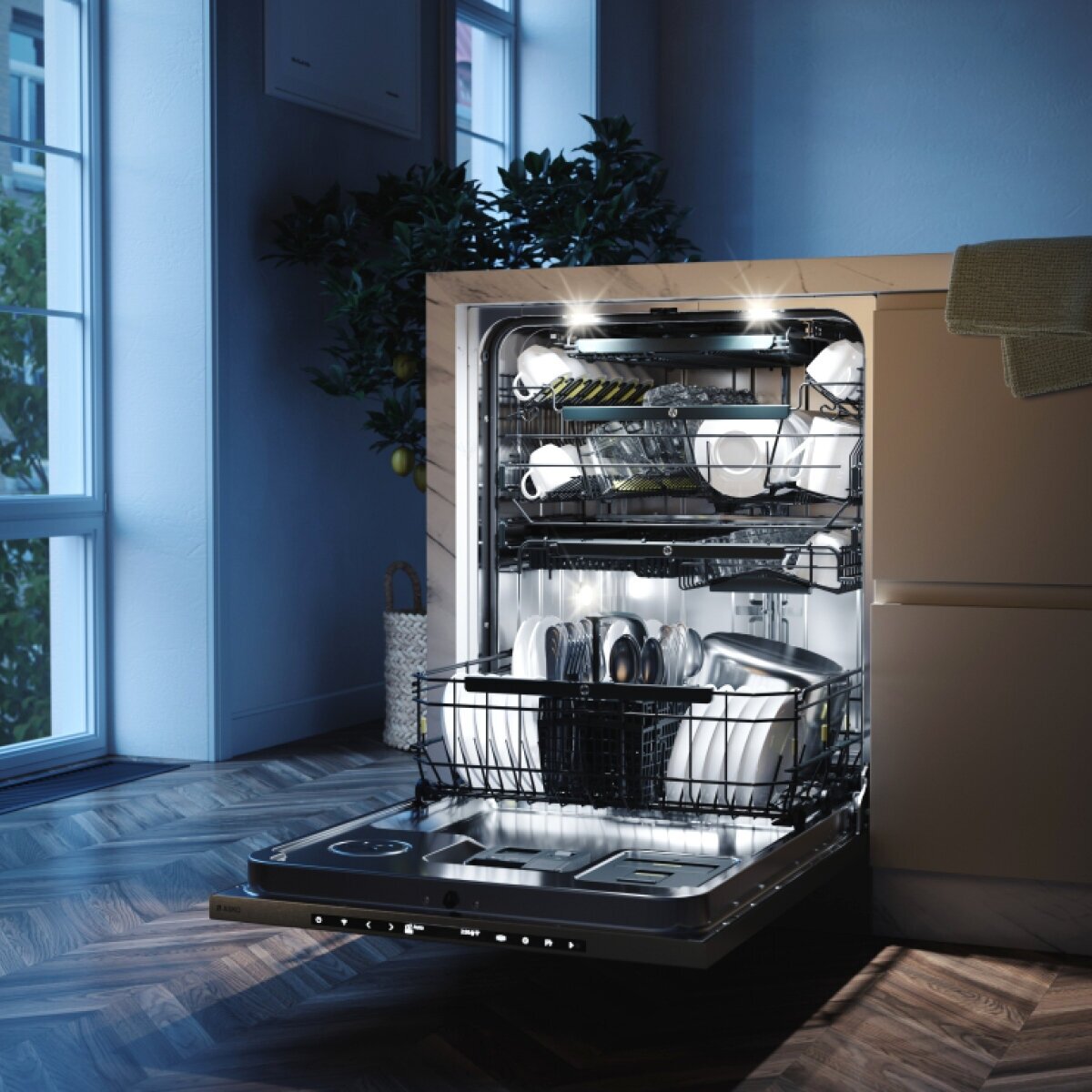 усиленная мойка в корзине для столовых приборов Cutlery Spray, регулировка баланса двери спереди, подключение слива на уровне пола, точки герметизации снаружи контейнера, герметичное основание, мгновенное обнаружение протечек в моторном отсеке Aqua Detect, встроенный антисифон