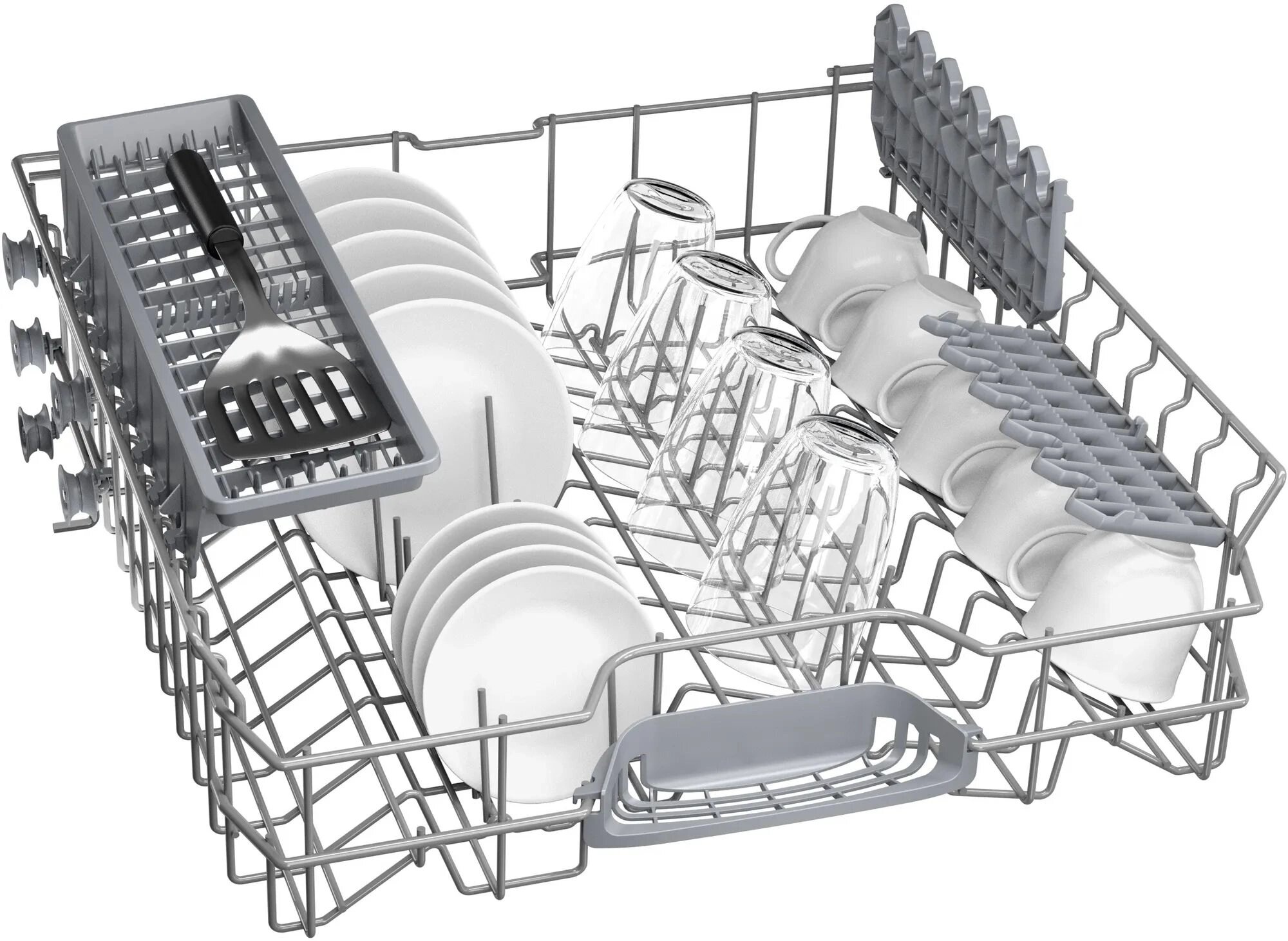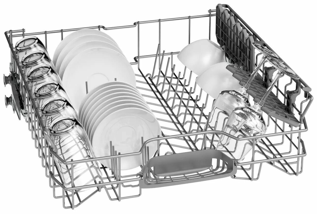 внутренняя поверхность из нержавеющей стали, дисплей, использование средств 3 в 1, регулируемая по высоте корзина для посуды, сенсор чистоты воды, Полка для чашек, Половинная загрузка, Регулировка высоты корзин