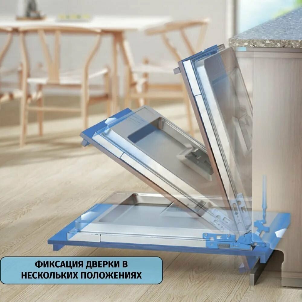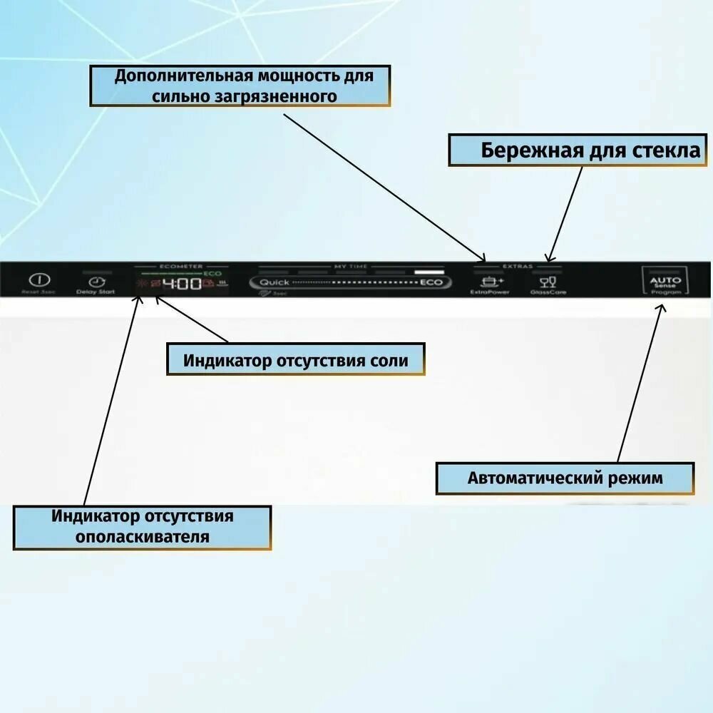 автоматическое открывание дверцы по завершении цикла, внутренняя поверхность из нержавеющей стали, дисплей, использование средств 3 в 1, регулируемая по высоте корзина для посуды, сенсор чистоты воды, таймер отсрочки, Автоматическое открывание двери, Внутреннее освещение, Датчик прозрачности воды, Двойное вращающееся коромысло, Звуковой сигнал, Мытье в верхнем коробе, Отключение звукового сигнала, Отсрочка запуска, Поддон для столовых приборов, Полка для чашек, Половинная загрузка, Регулировка высоты корзин, Самоочищающийся фильтр, Таймер