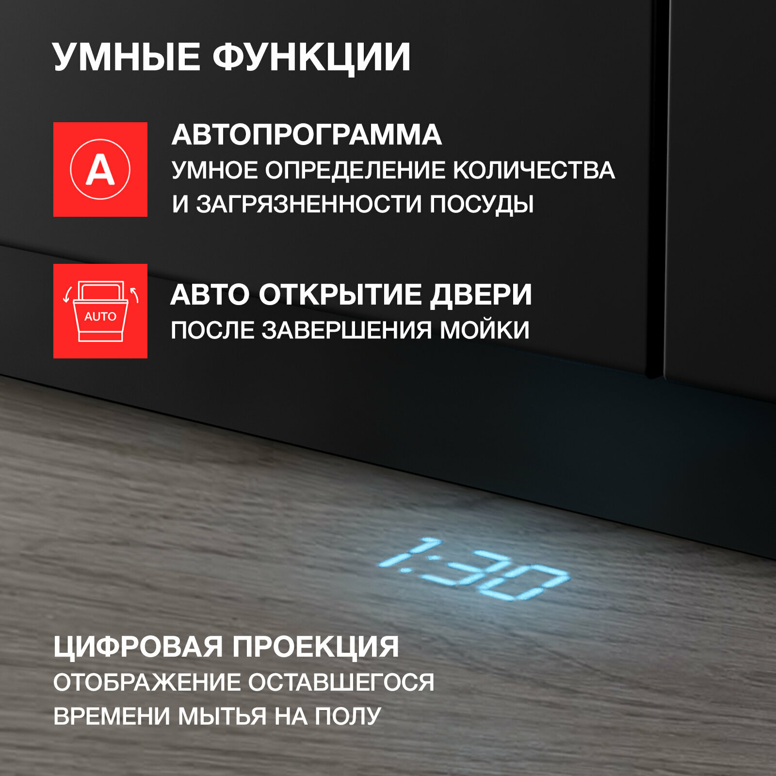 наличия ополаскивателя, наличия соли, Луч на полу (окончание цикла работы), наличия соли и ополаскивателя, ополаскивателя, соли, Луч на полу (окончание цикла работы)