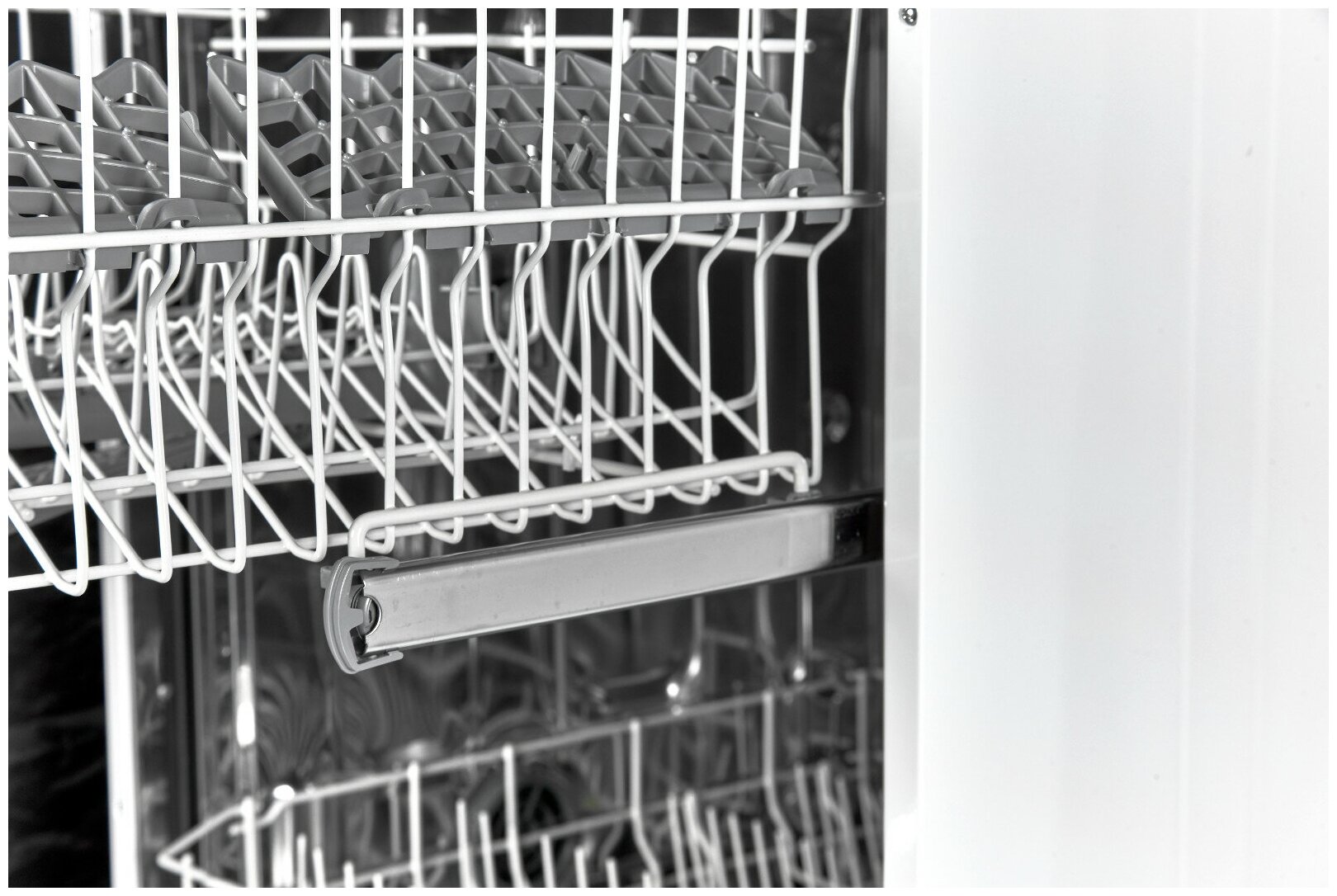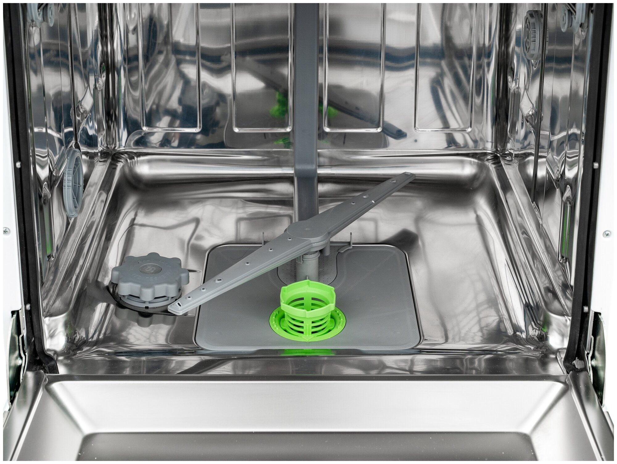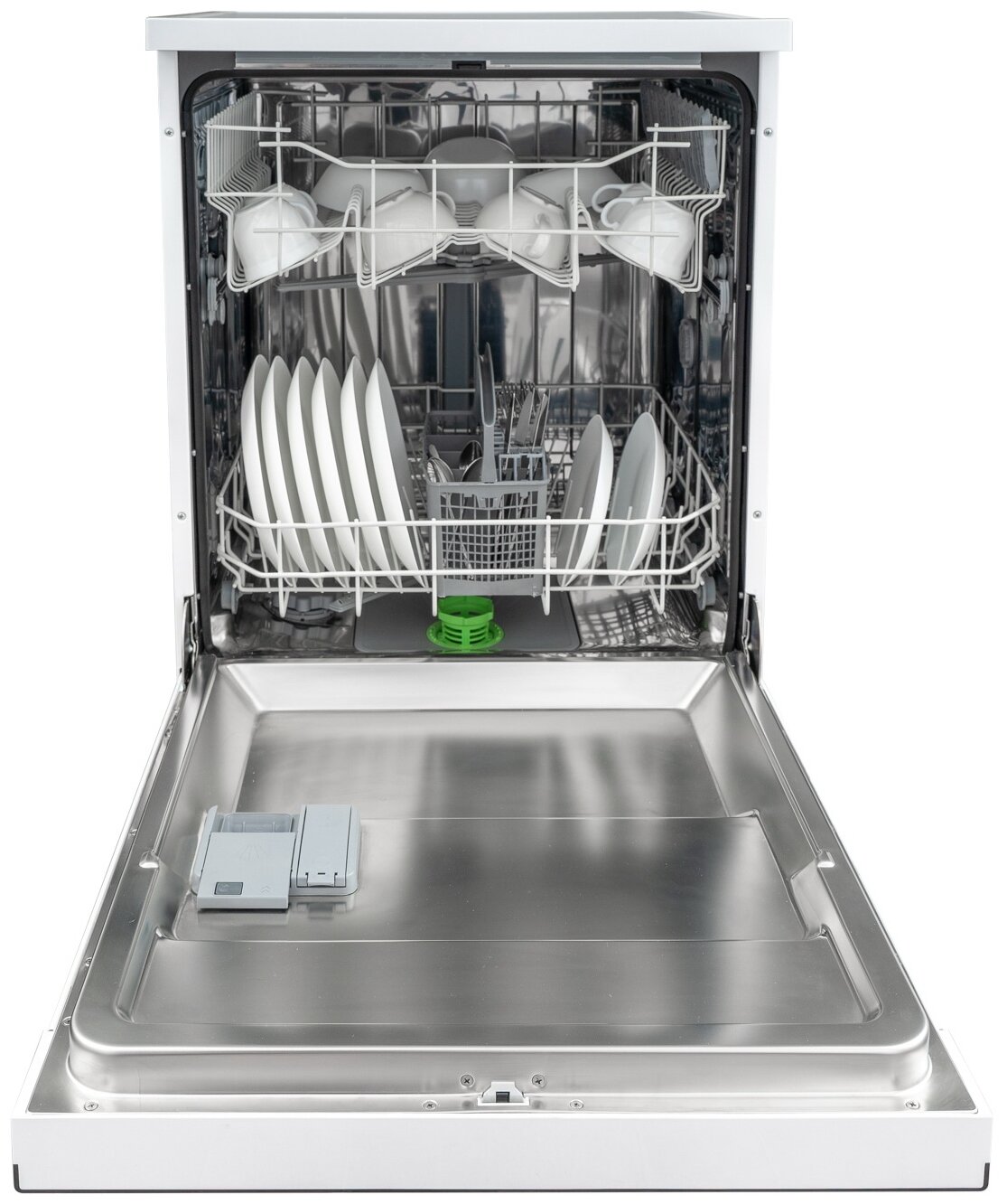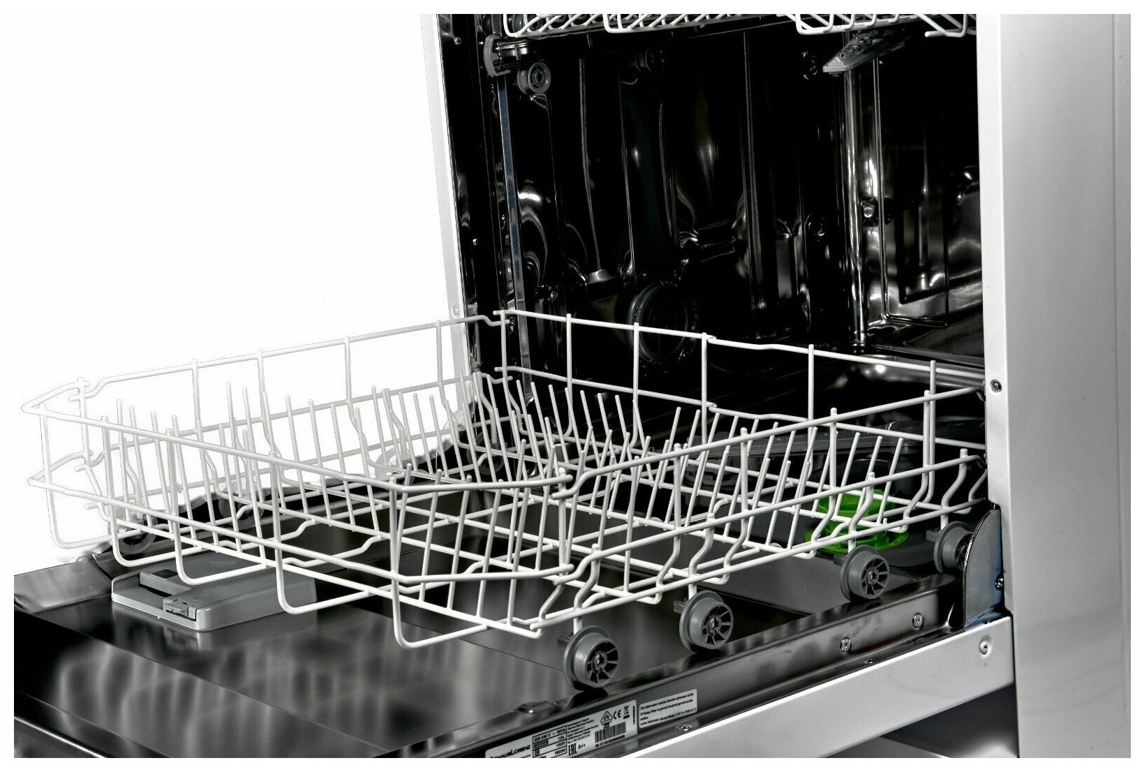 Относительно небольшой размер, внутри можно поместить много посуды одновременно, отмывает практически идеально, если нет намертво налипшей грязи, есть экономичный режим работы