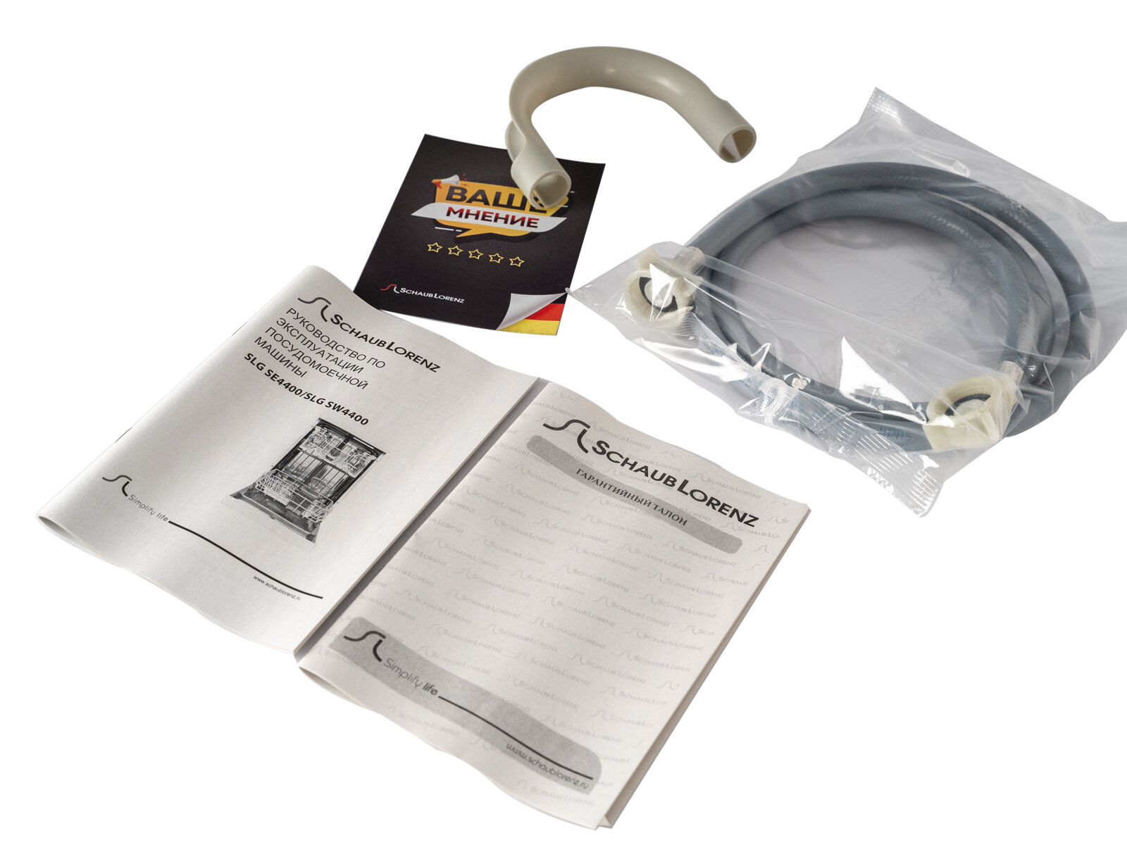 держатель для бокалов, корзина для столовых приборов, Воронка для засыпки соли, Гарантийный талон, Лоток для столовых приборов, Пластиковый держатель для сливного шланга, Посудомоечная машина SCHAUB LORENZ SLG SW4400, Посудомойка, документация, Руководство по эксплуатации, Сливной шланг, инструкция - 1 штука