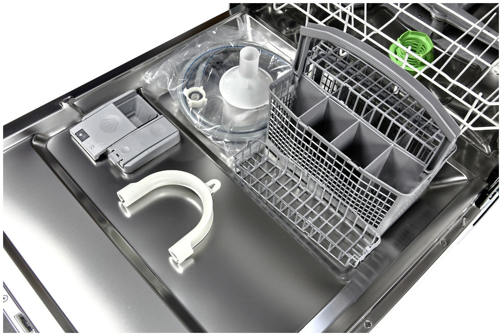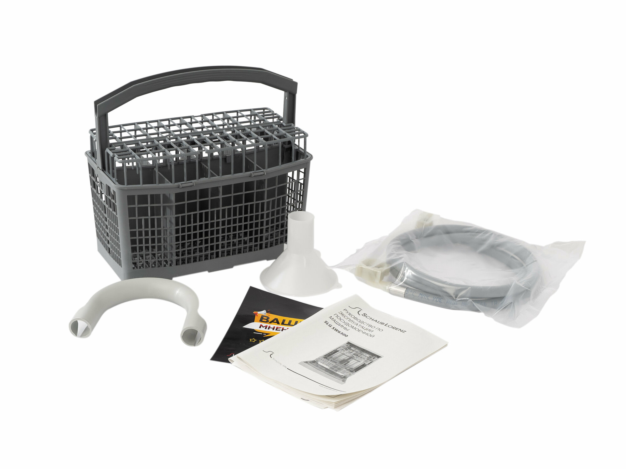 держатель для бокалов, Воронка для засыпки соли, Гарантийный талон, Лоток для столовых приборов, Пластиковый держатель для сливного шланга, Посудомоечная машина SCHAUB LORENZ SLG SW6300, Посудомойка, документация, Руководство по эксплуатации, Сливной шланг, инструкция - 1 штука