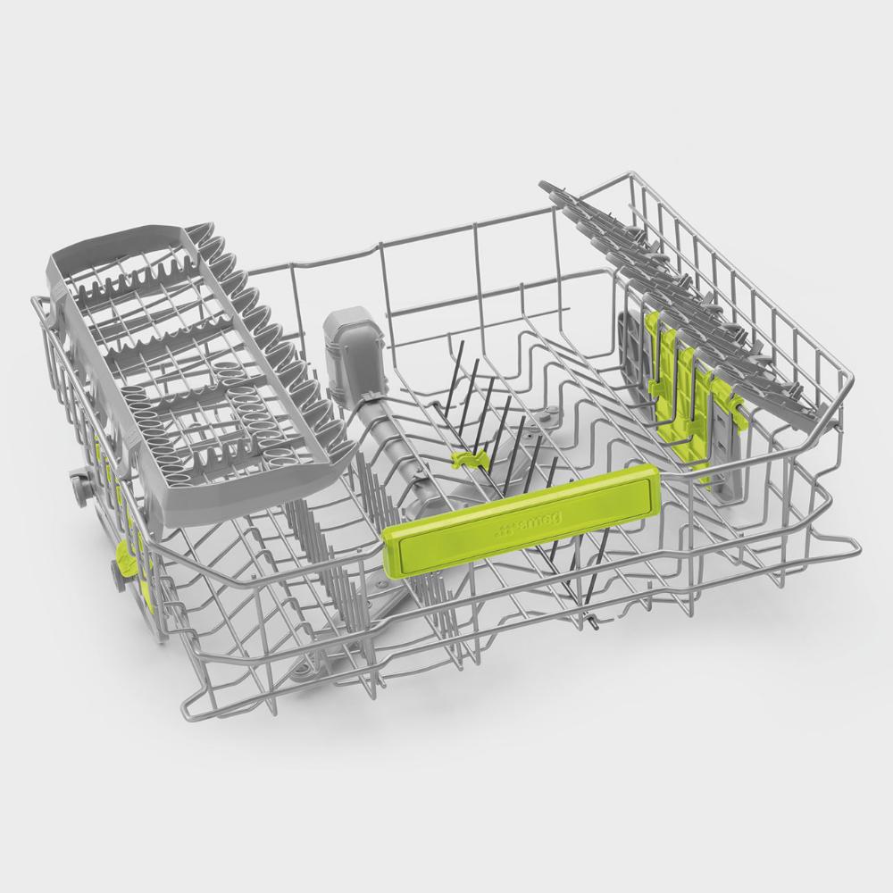 2 корзины Верхняя корзина: с 1 складным держателем, регулировка по высоте на 3 горизонтальных уровнях Нижняя корзина: с 2 складными полками Третий верхний разбрызгиватель