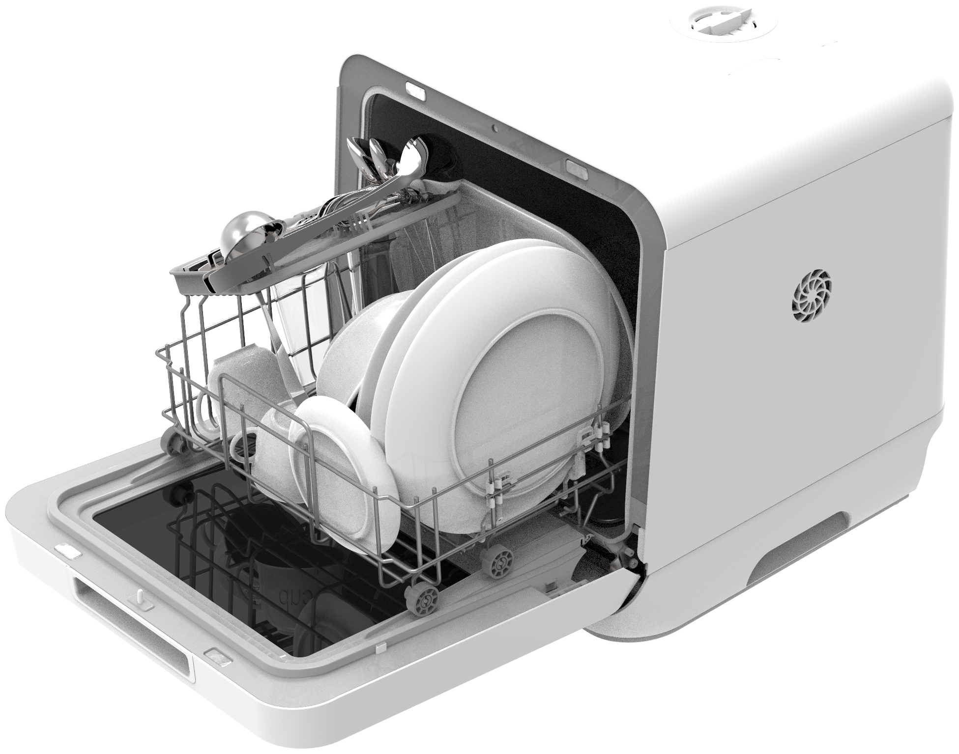 В одной корзине умещается два комплекта, и благодаря двум разбрызгивателям все предметы очищаются и ополаскиваются максимально качественно и тщательно. Настольная посудомойка прекрасно справится как с не очень грязными тарелками, так и с сильно загрязнёнными приборами.
