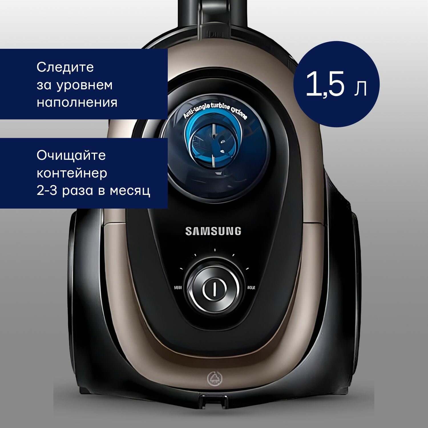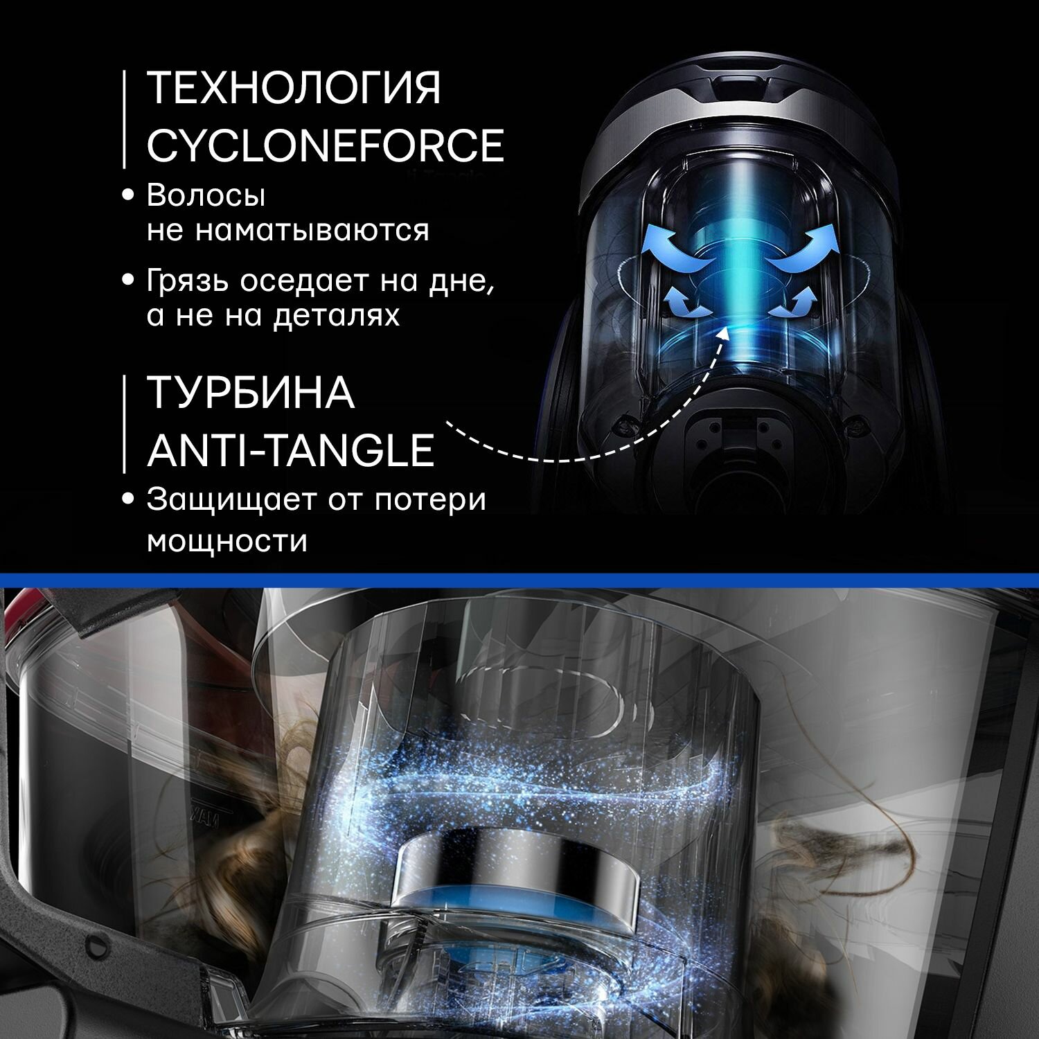 турбина Anti-Tangle (предотвращает наматывание волос, шерсти и пыли на фильтр); поворотная ручка Easy Grip