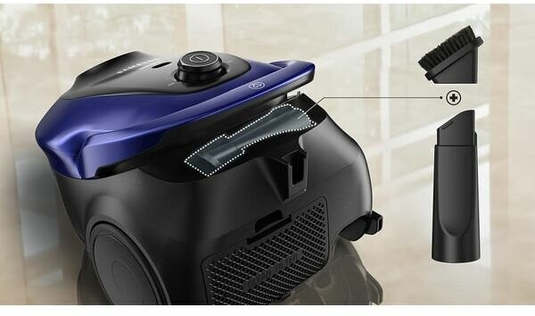 вертикальная парковка, индикатор заполнения пылесборника, место для хранения насадок, ножной переключатель вкл./выкл., регулятор мощности на корпусе, Автоматическая смотка шнура, Горизонтальная парковка, автосматывание сетевого шнура, ножной переключатель вкл./выкл. на корпусе