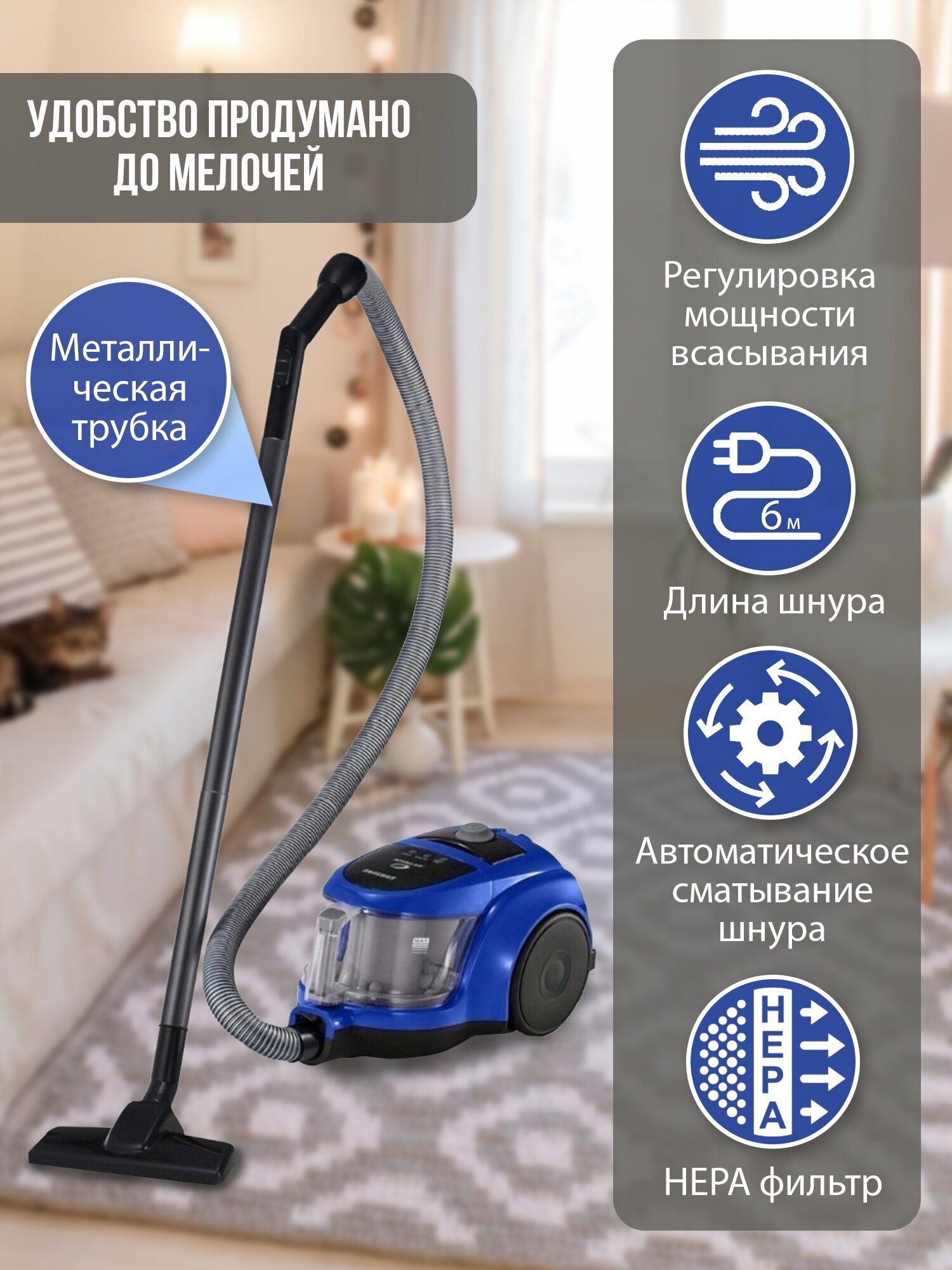 вертикальная парковка, индикатор заполнения пылесборника, мягкий бампер, ножной переключатель вкл./выкл., регулятор мощности на корпусе