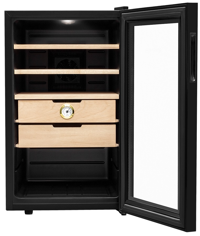 Термоэлектрическое динамическое охлаждение Рамка двери: черный пластик Двойное стекло с УФ-фильтром Утопленная ручка Автоматическая разморозка Память настроек Электронный термостат и гигрометр Габариты в упаковке: 82.3х52х60 см Вес в упаковке: 22.8 кг