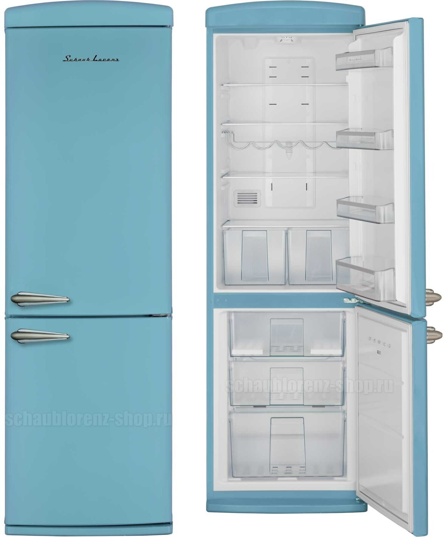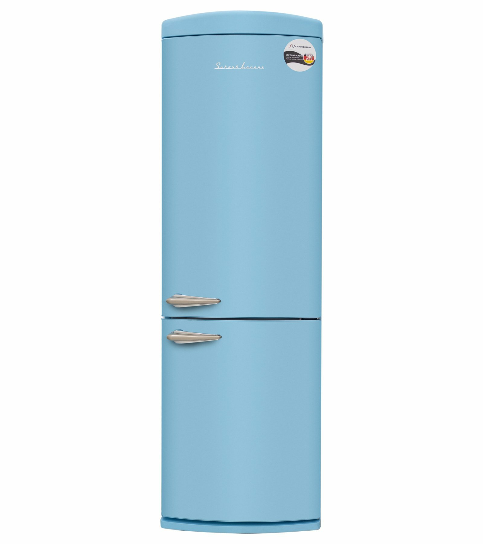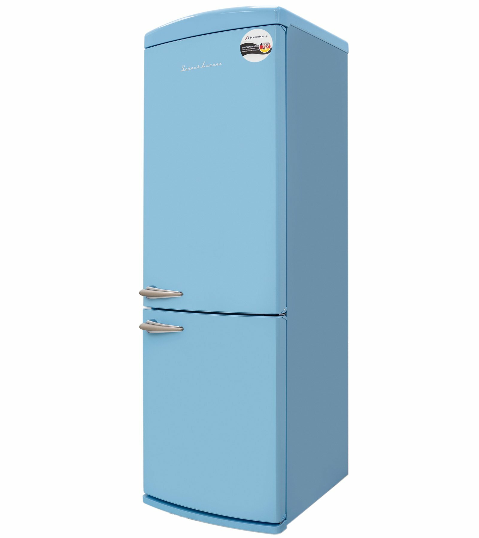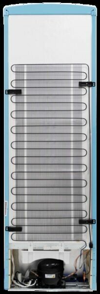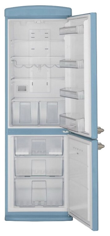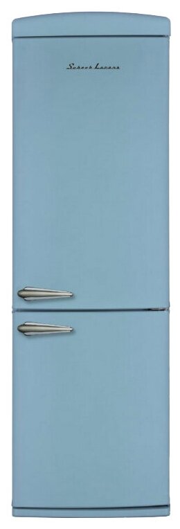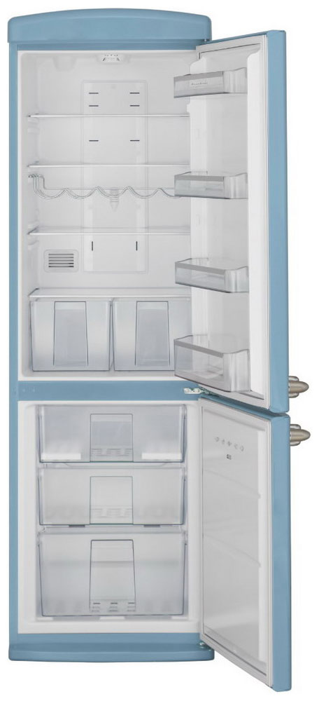 антибактериальное покрытие, перевешиваемые двери, Вправо, Изящная ручка в ретро стиле, Приятный голубой цвет, Разработан и произведен в Европе, Светодиодная подсветка, Хромированный логотип в ретро стиле, Элегантный ретро дизайн корпуса, регулируемые по высоте ножки