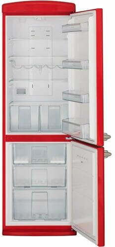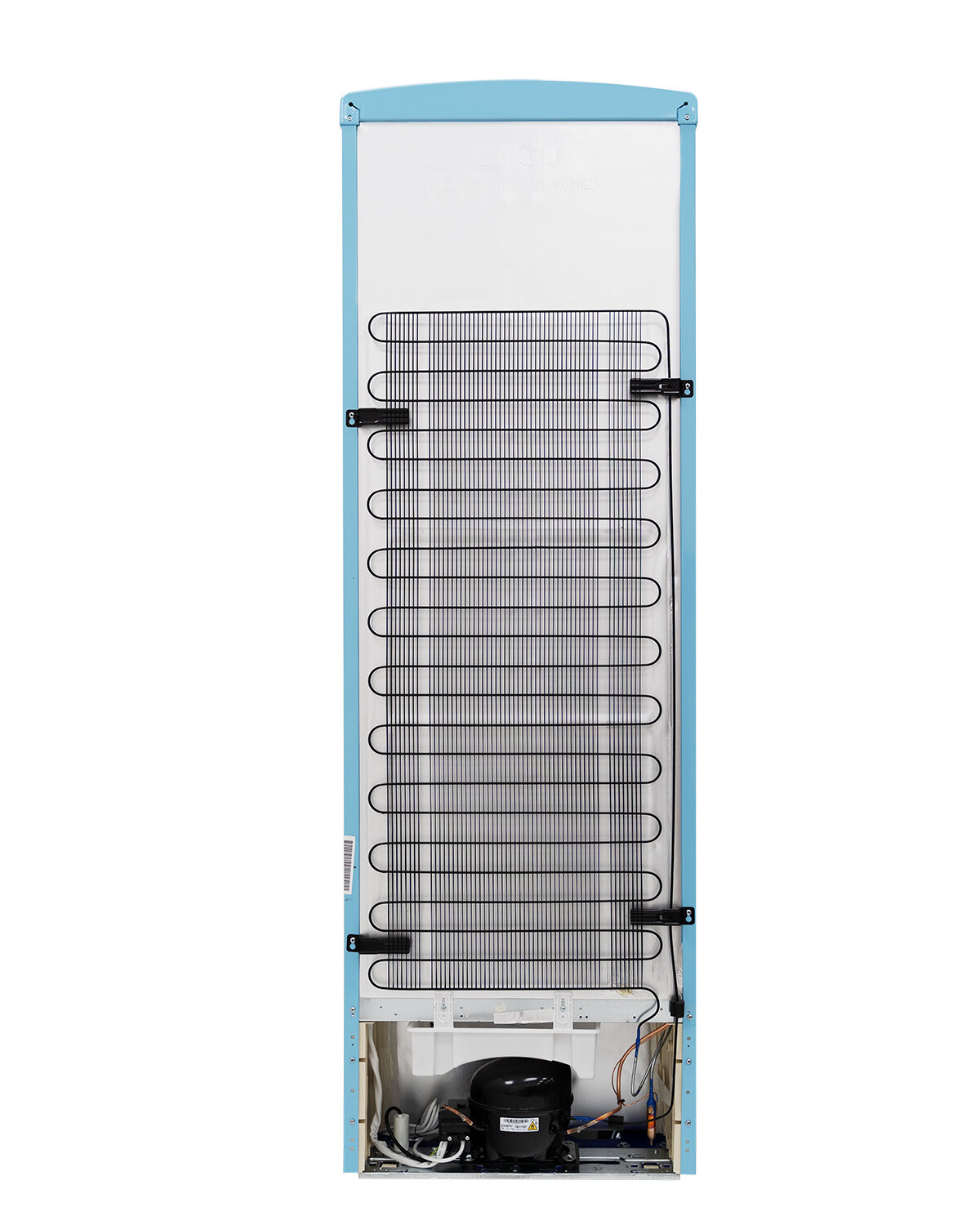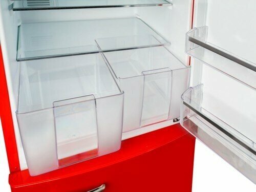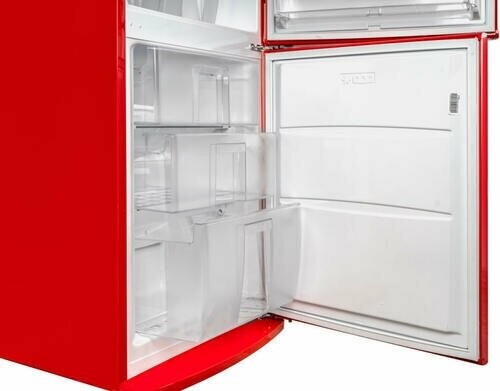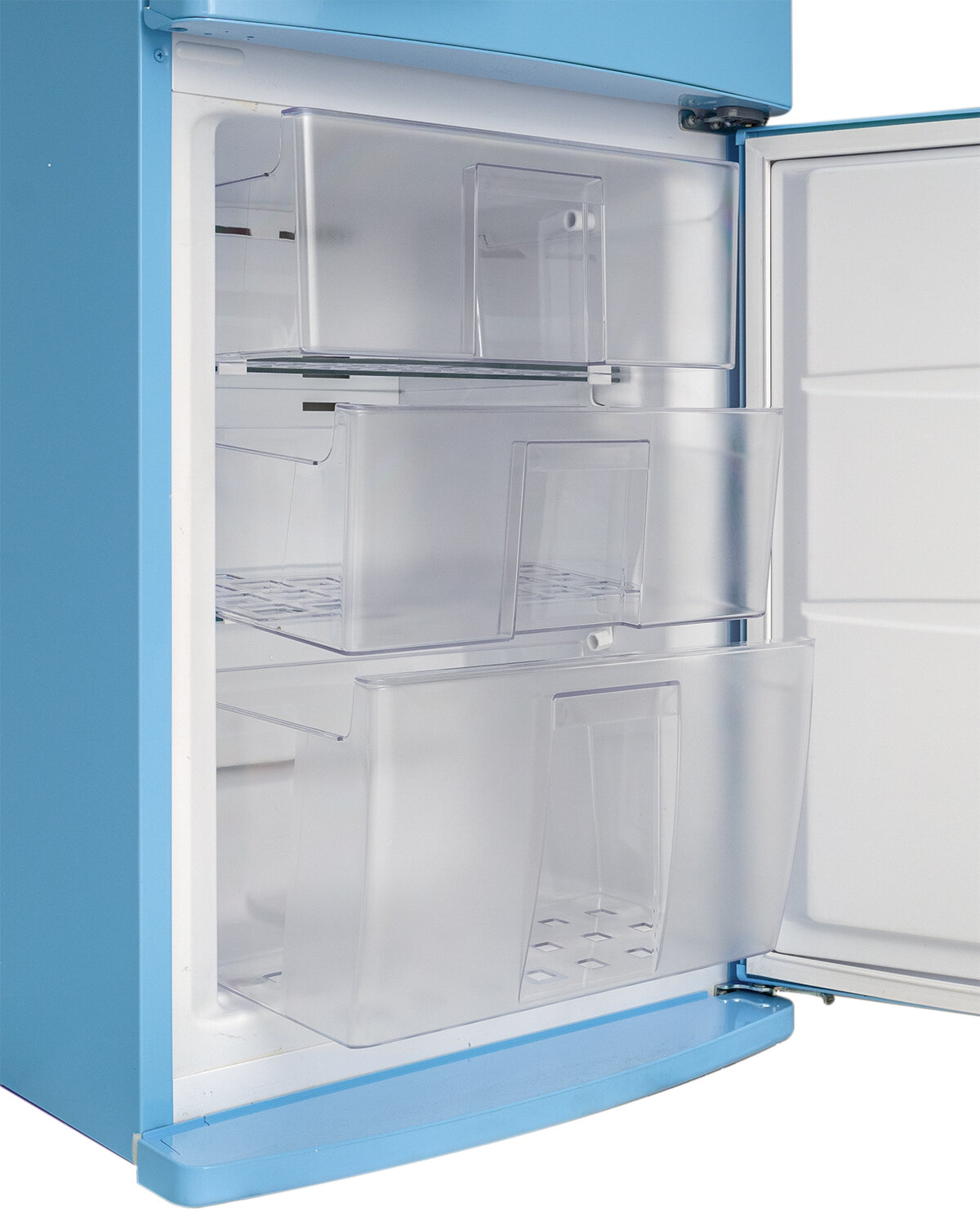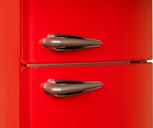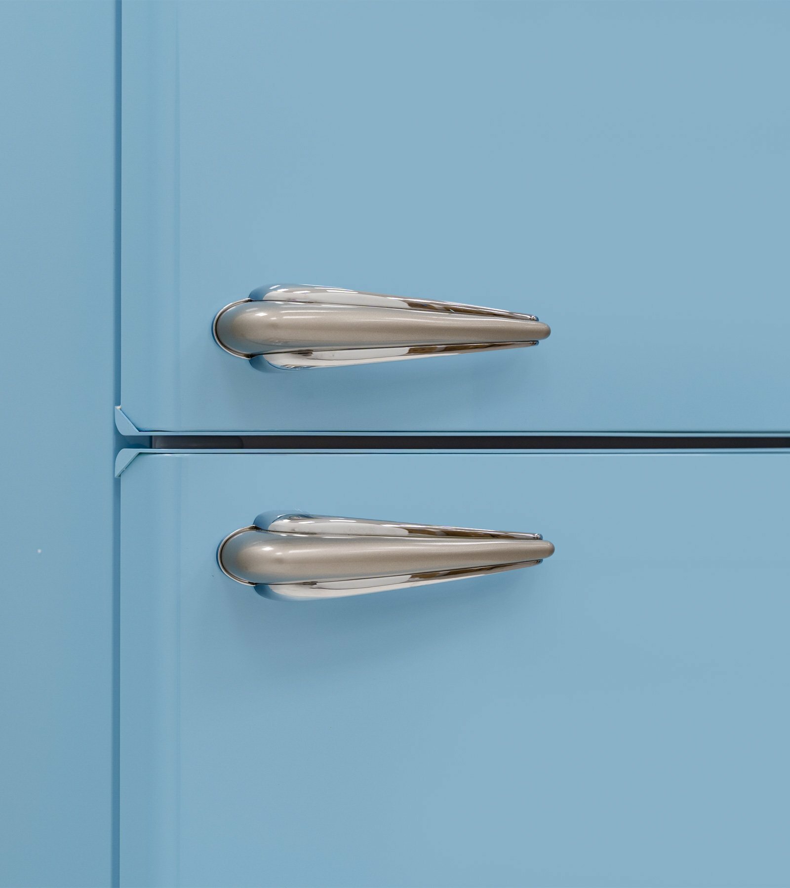 антибактериальное покрытие, перевешиваемые двери, Вправо, Изящная ручка в ретро стиле, Приятный голубой цвет, Разработан и произведен в Европе, Светодиодная подсветка, Хромированный логотип в ретро стиле, Элегантный ретро дизайн корпуса, регулируемые по высоте ножки