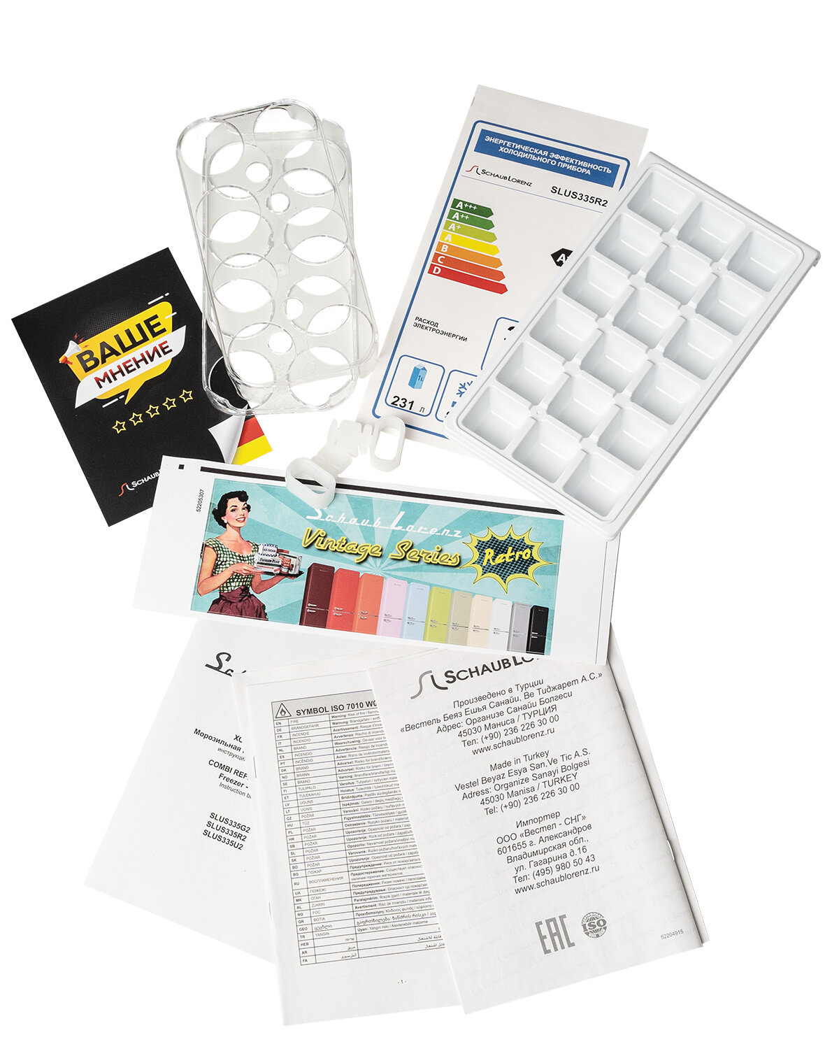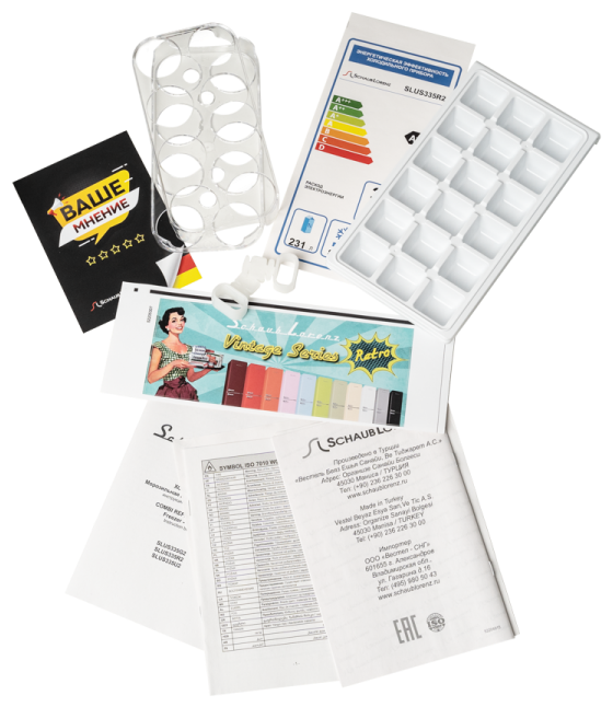 держатель для бутылок, лоток для яиц, лоток для льда, инструкция, гарантийный талон