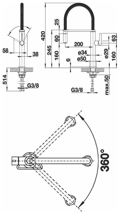 выдвижной, гибкий, поворотный, Длинный, С режимом "душ", высота 299 мм, длина 220 мм, с высоким изливом