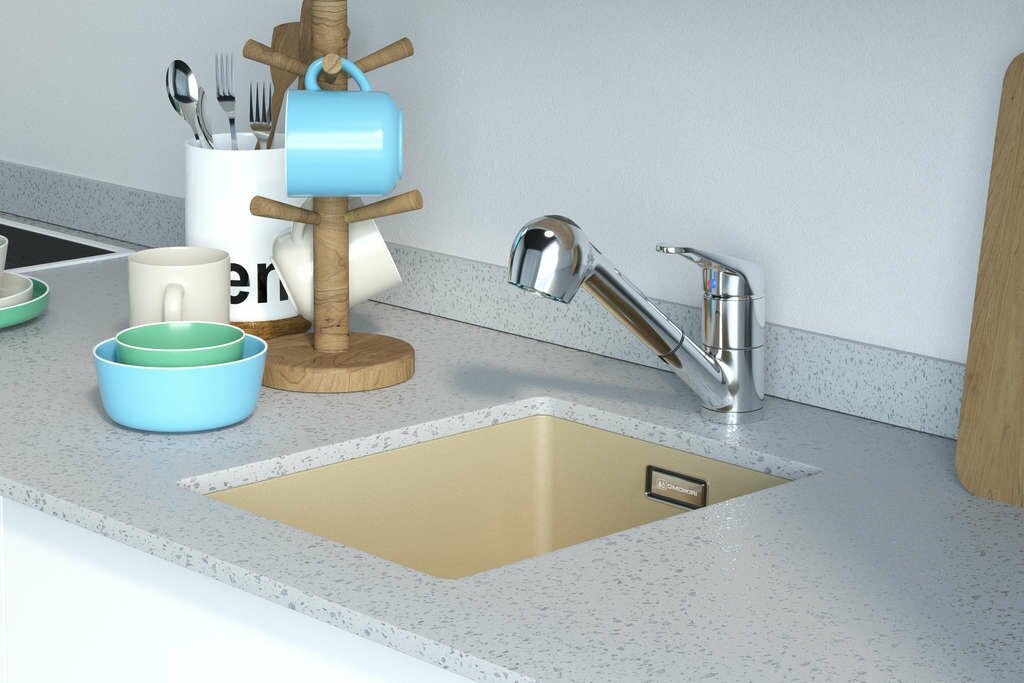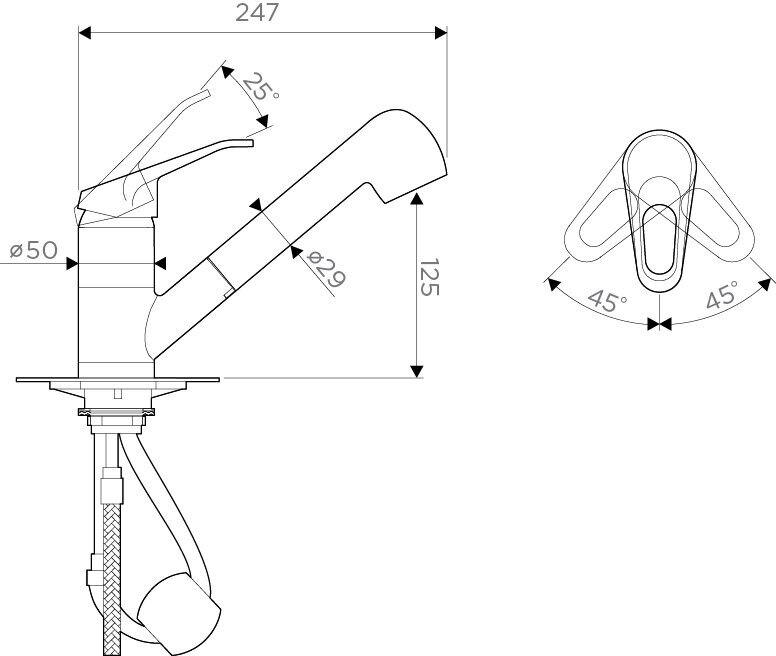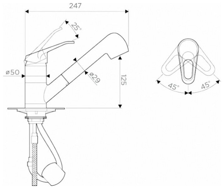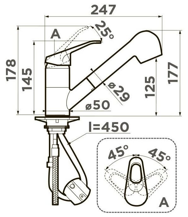 Вытяжной шланг длиной 450 мм позволит удобно отмыть любую труднодоступную поверхность или наполнить большую емкость водой. Отлично подойдет для дачи, где зачастую требуется более функциональный смеситель для помощи в хозяйстве.