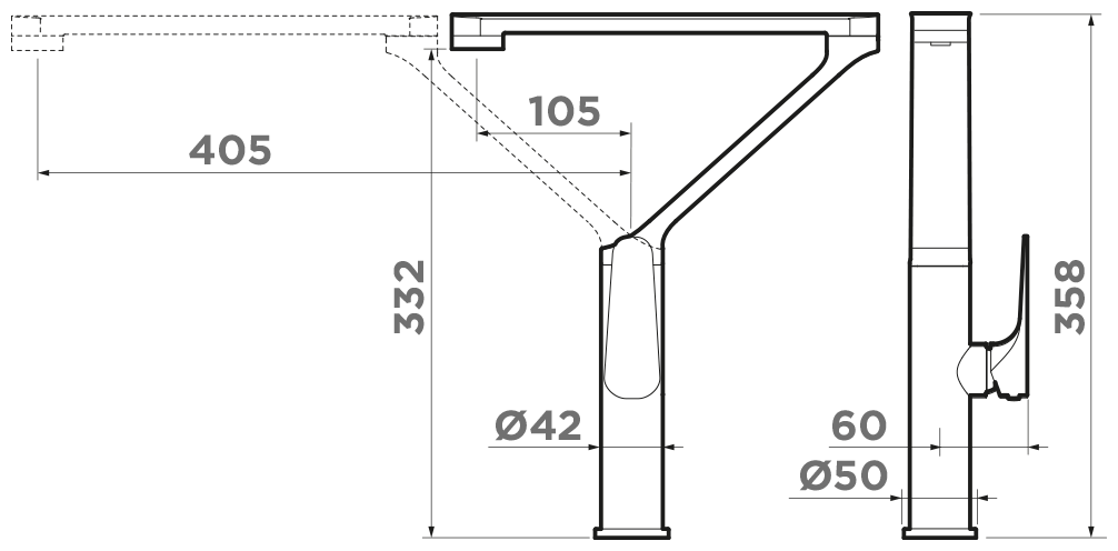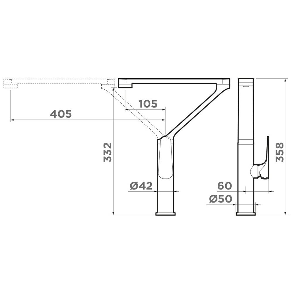 длина излива регулируется от 10,5 до 40,5 см