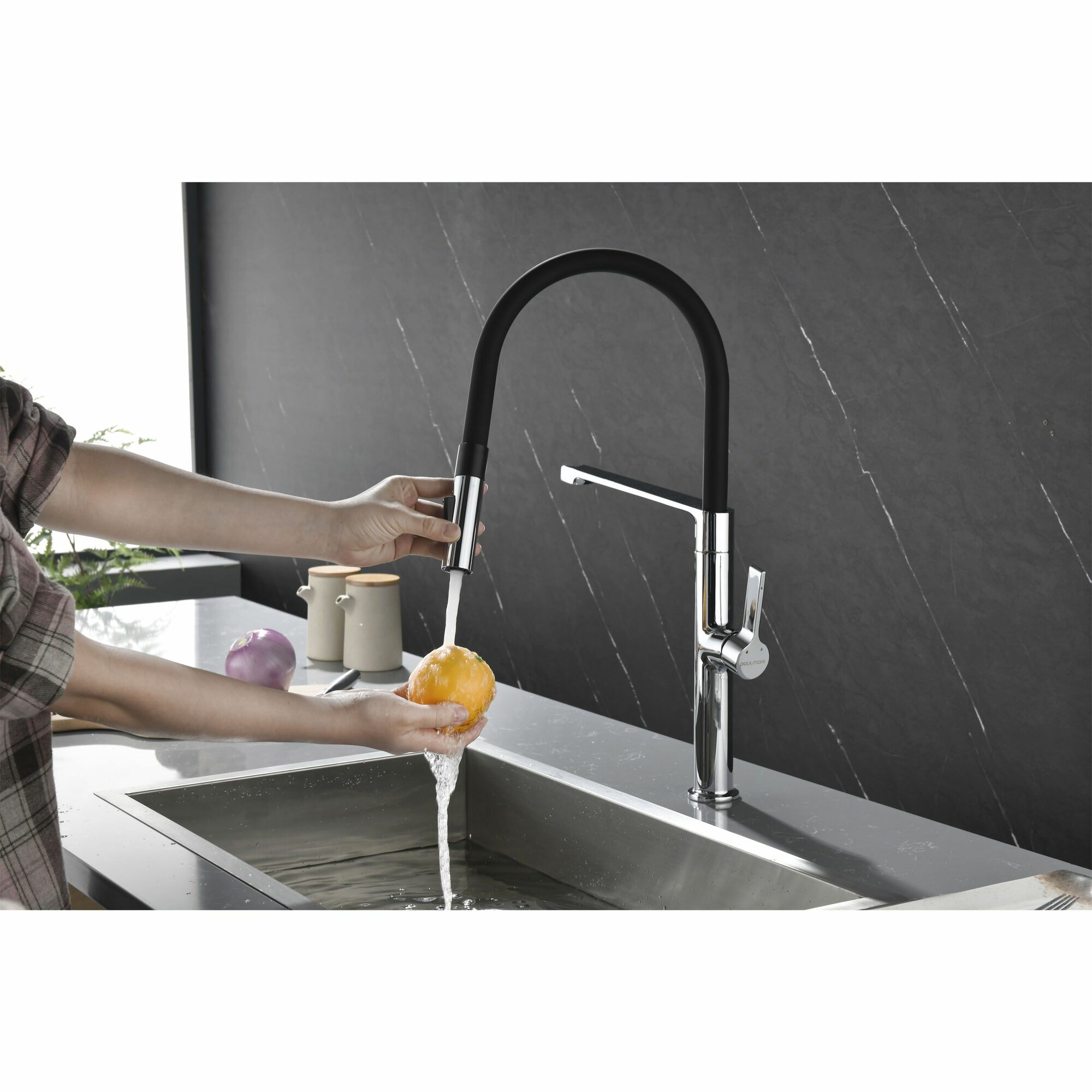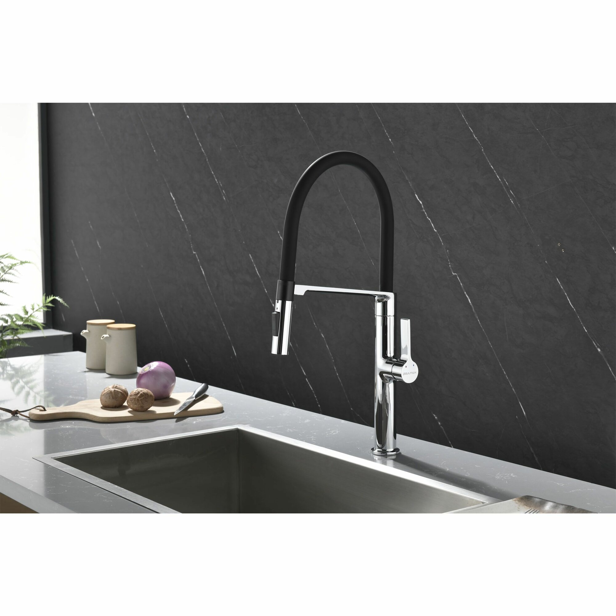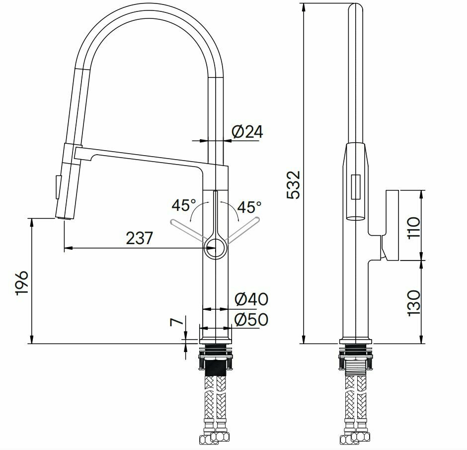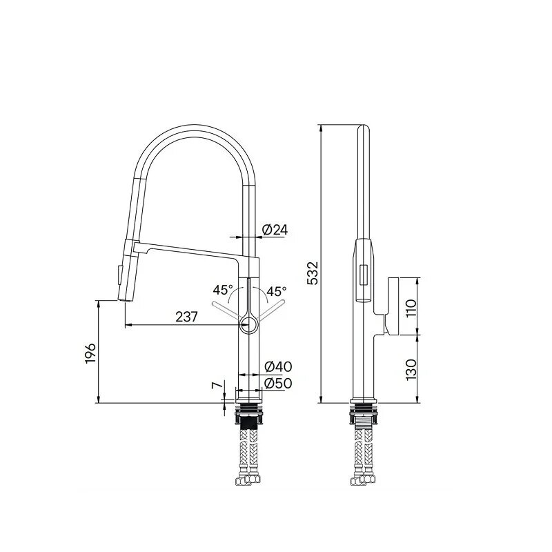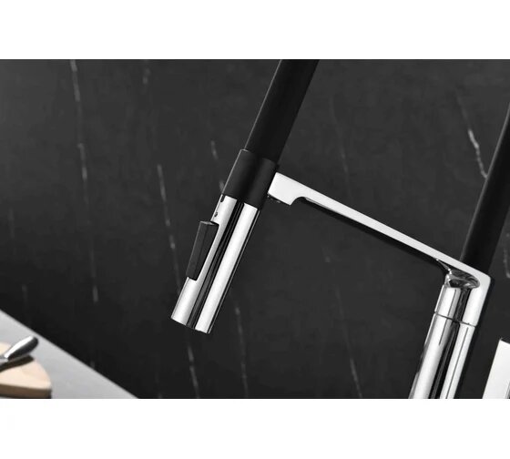 Вытяжной шланг Конструкция смесителя с вытяжным шлангом значительно облегчает процесс мойки посуды или продуктов любого размера и формы. Поворотный излив 180° Увеличивает функциональность. Универсальный дизайн. Прекрасно впишется в любой интерьерный стиль.