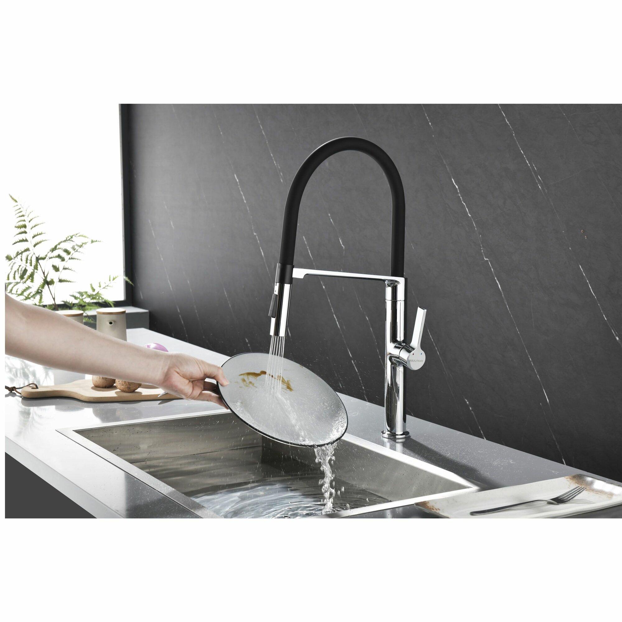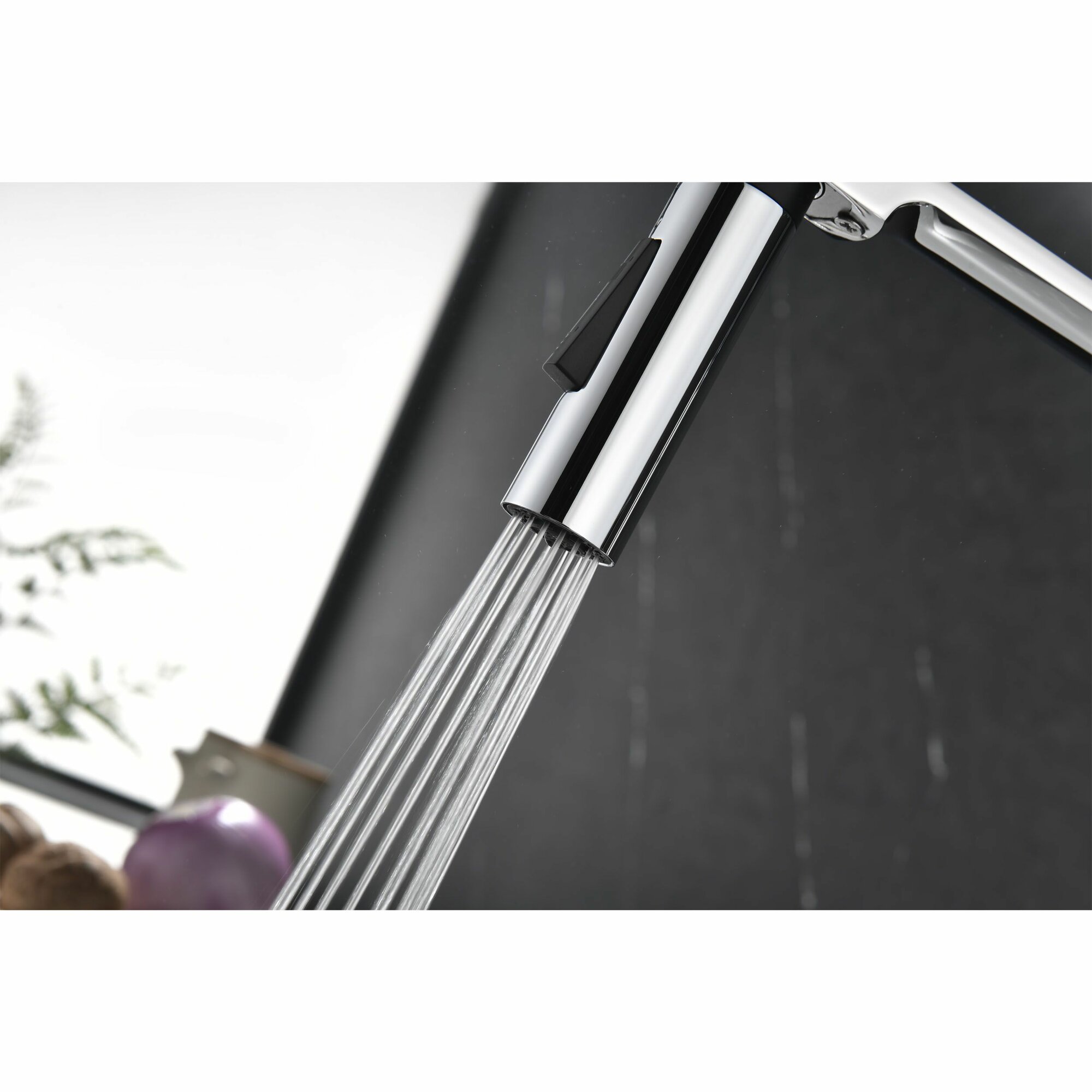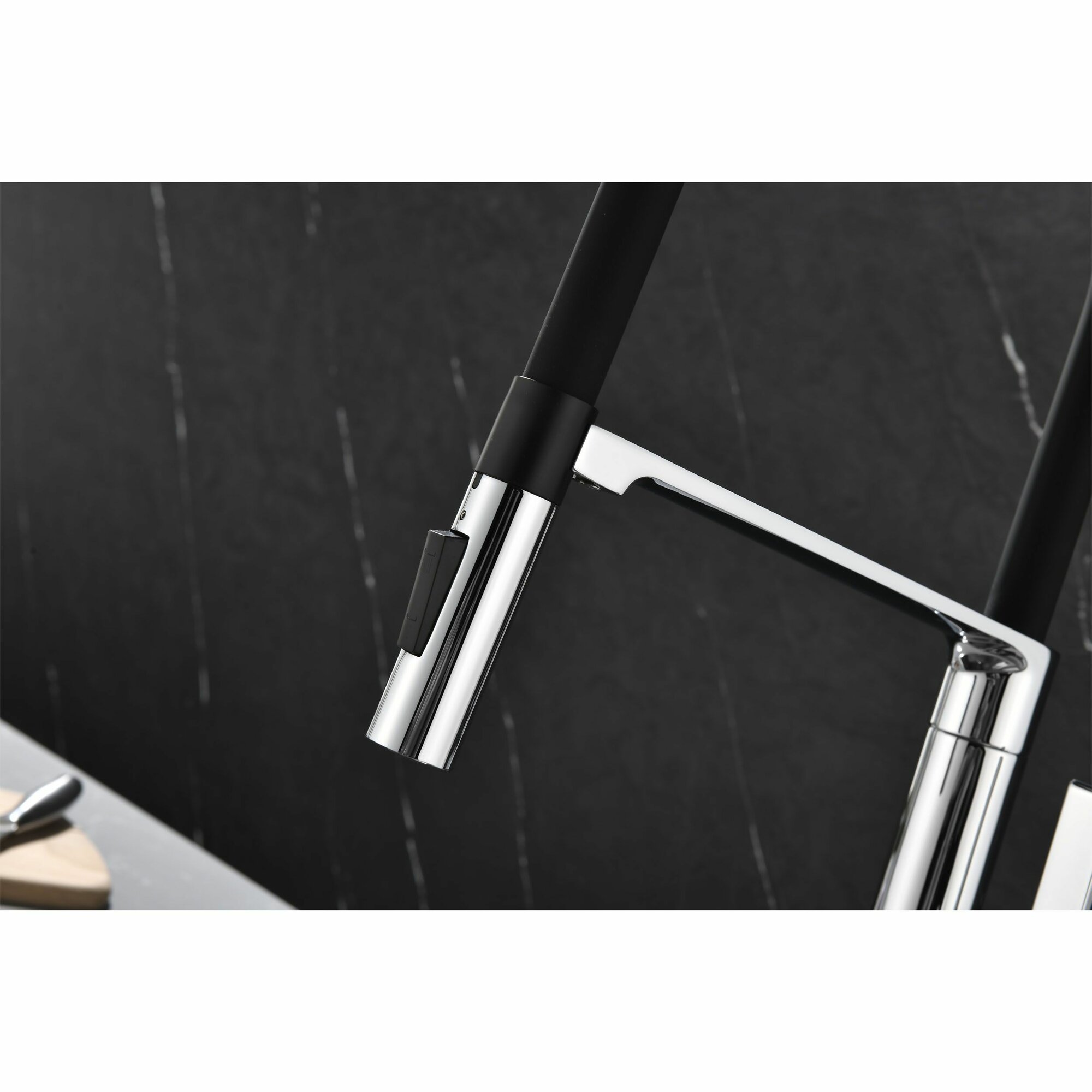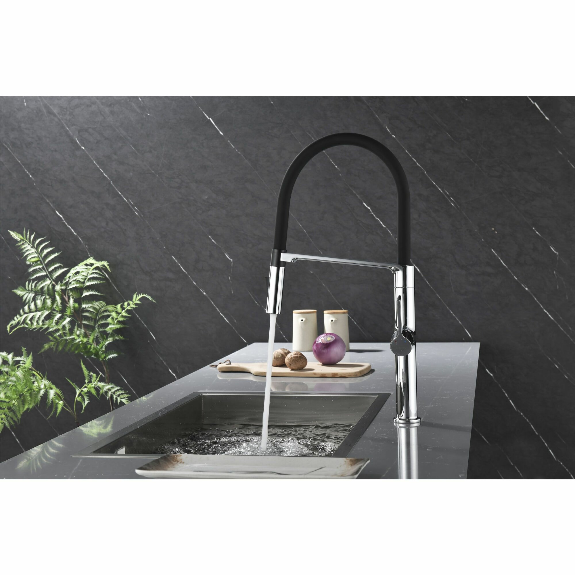Вытяжной шланг Конструкция смесителя с вытяжным шлангом значительно облегчает процесс мойки посуды или продуктов любого размера и формы. Поворотный излив 180° Увеличивает функциональность. Универсальный дизайн. Прекрасно впишется в любой интерьерный стиль.