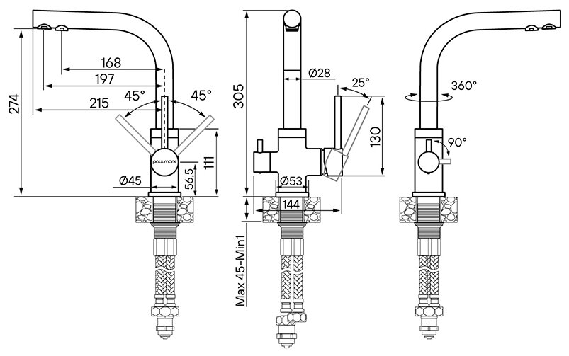 поворотный, Дополнительный излив для питьевой воды, Совмещенный излив для питьевой воды