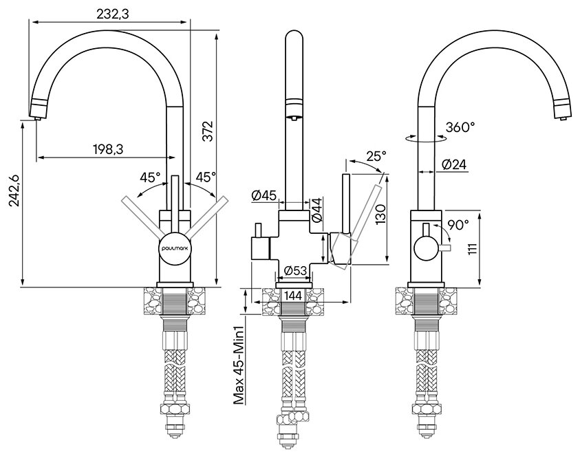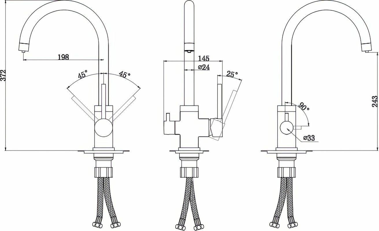 гибкая подводка 40 см из нержавеющей стали гайки G1/2", усиленный комплект крепления, выход для подключения системы фильтрации воды, переходник цанга 1/2" для подключения фильтра