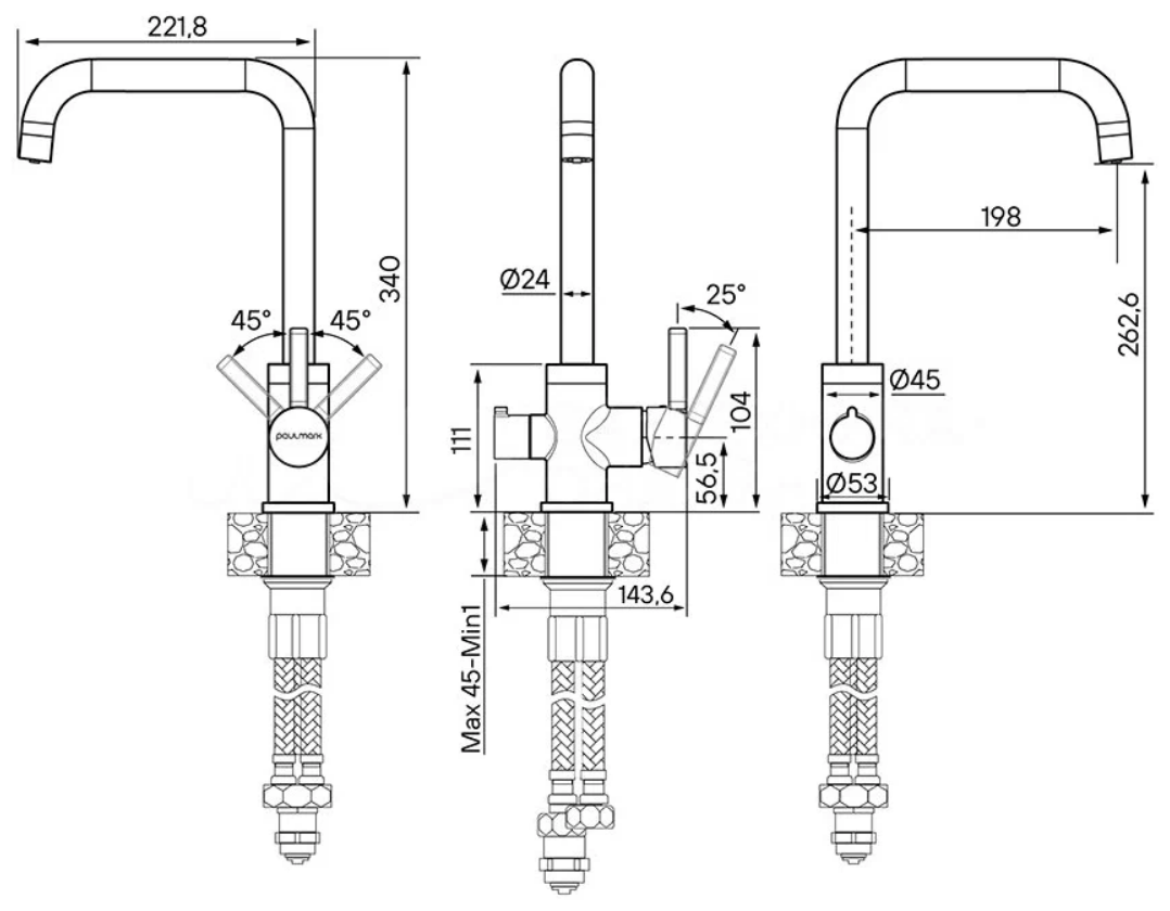аэратор, встроенный фильтр, поворотный излив, Гибкая подводка, Поворотный