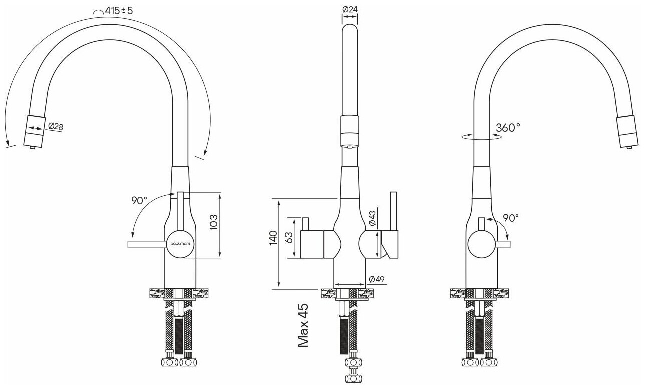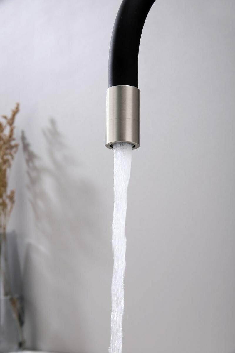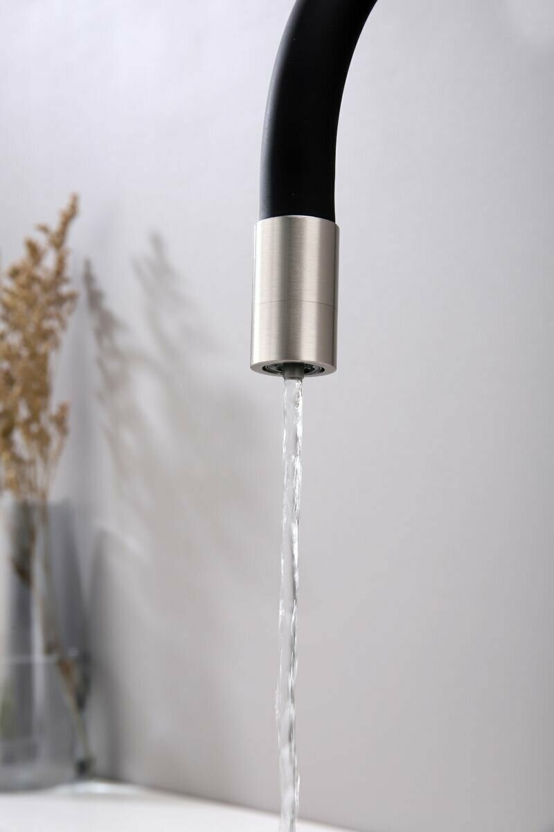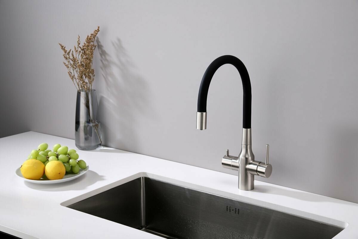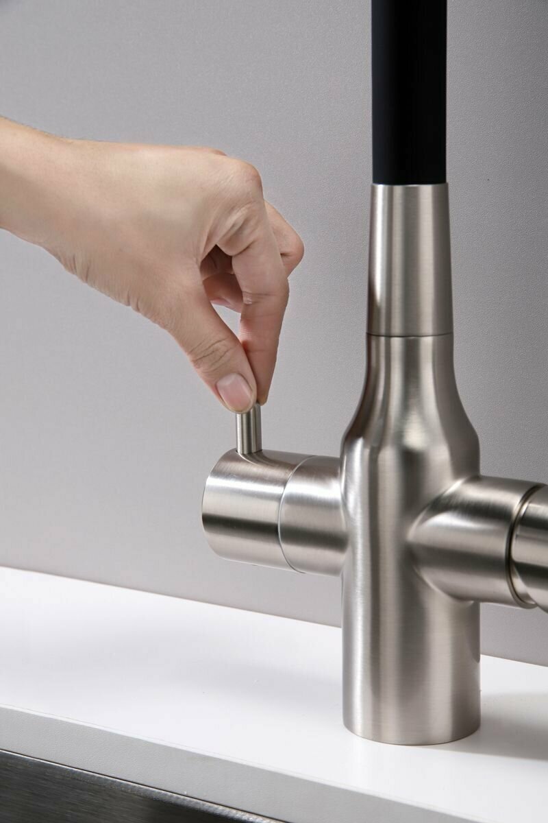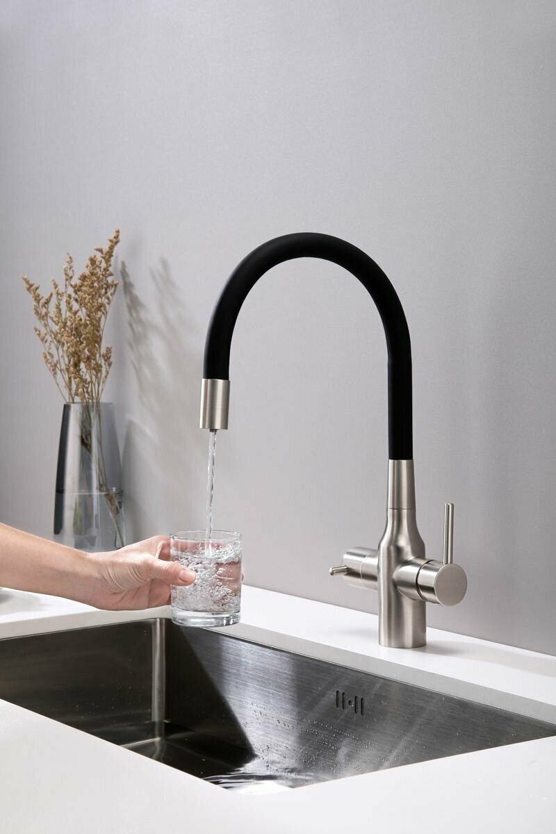 Гибкий излив с фиксацией. Обеспечивает оптимальный диапазон движения. Отдельный канал для питьевой воды. Питьевая и водопроводная вода не смешиваются. Ручка открытия питьевой воды. Отдельное управление открытием потока питьевой воды. Высокий поворотный излив. Вращение на 360°