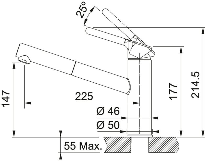 материал выдвижного шланга - нейлон, материал лейки - пластик, тип аэратора - ламинарный поток, длина шланга подачи воды - 45 см, тип фиксации - хвостовик