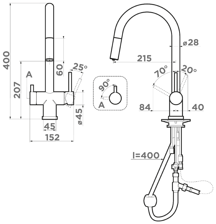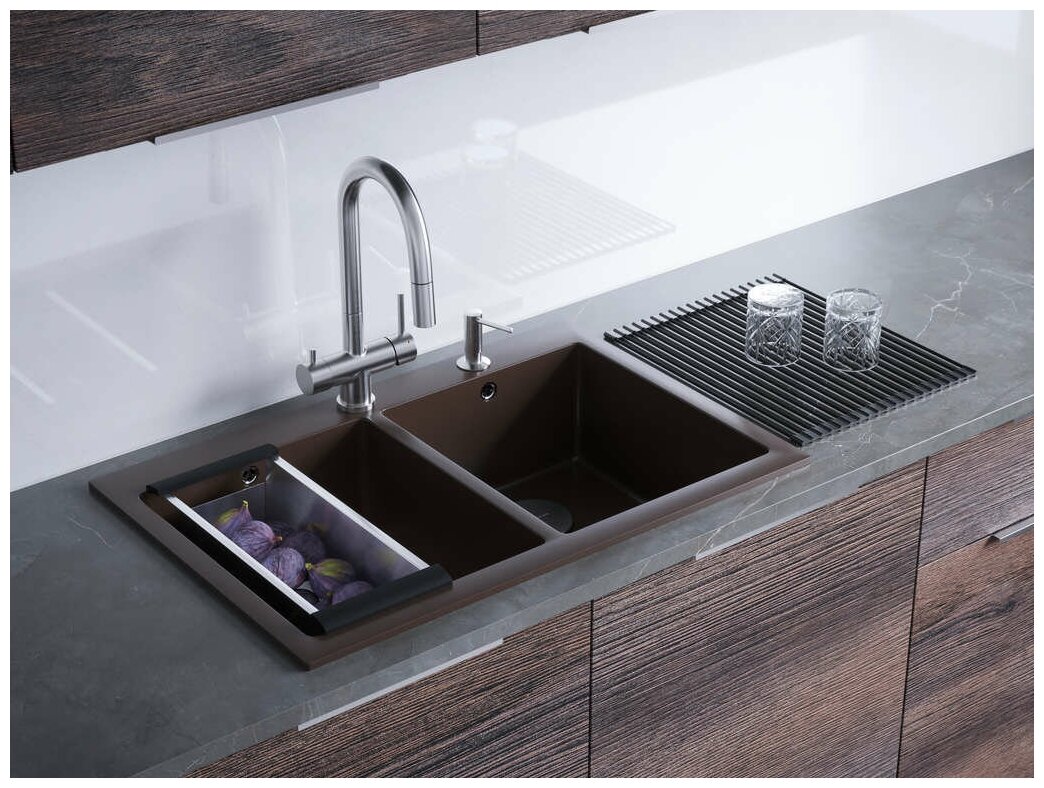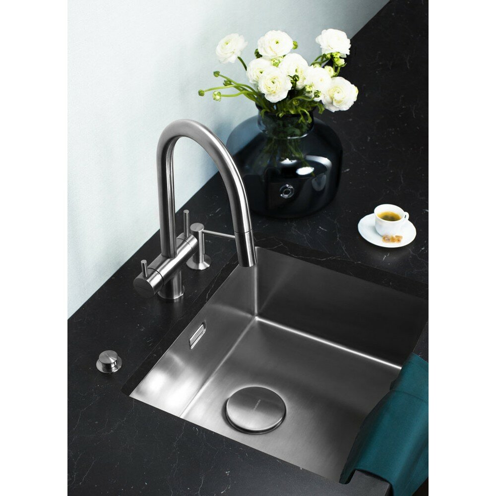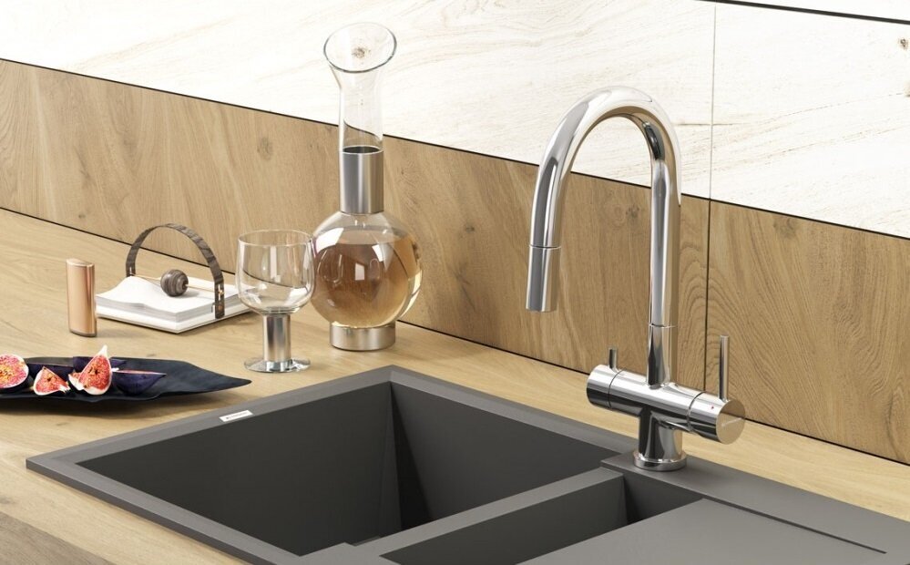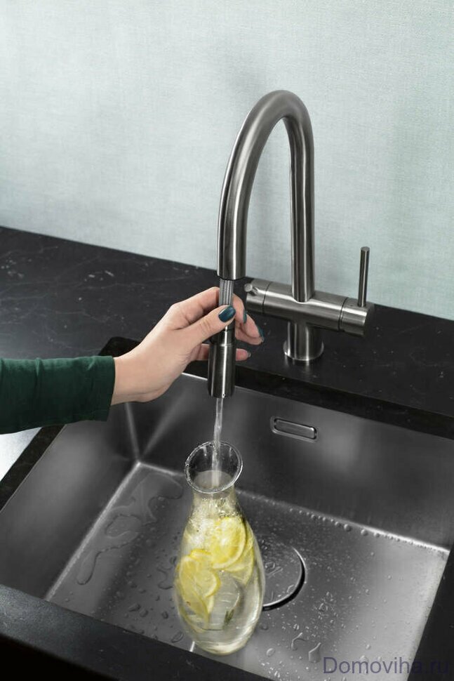- Первый смеситель в категории 3 в 1: функция подачи холодной/горячей воды, возможность подключения фильтра для очистки и наличие вытяжного шланга;