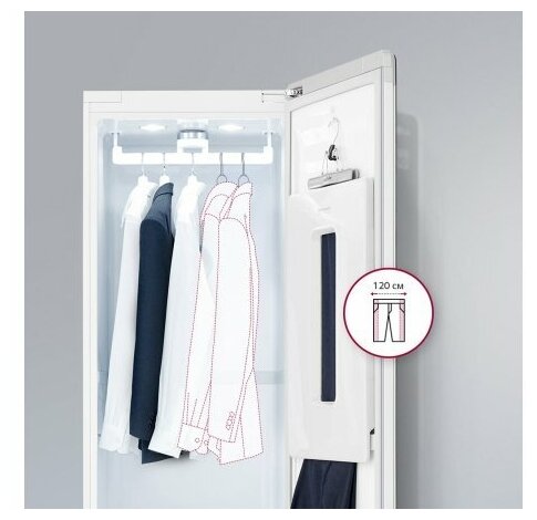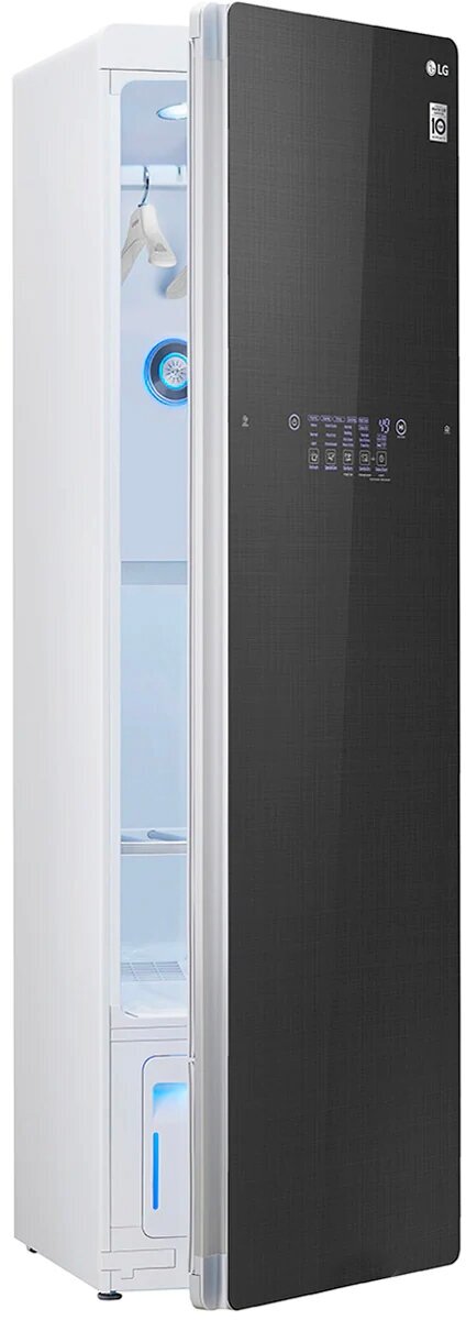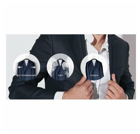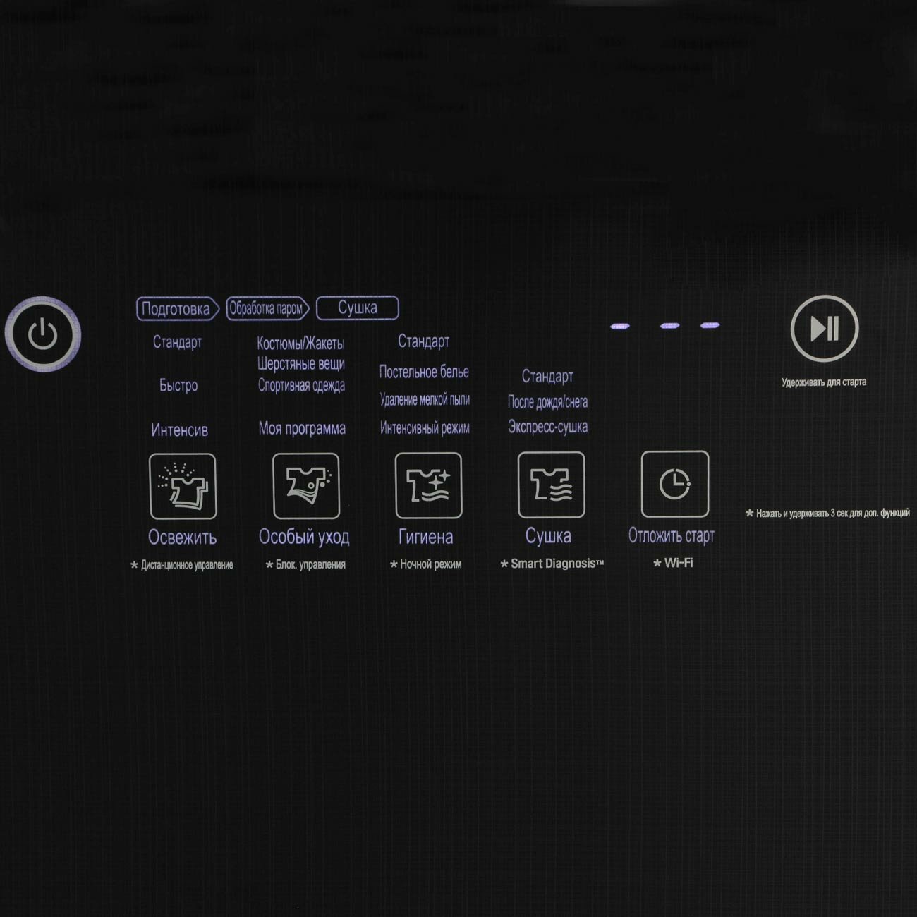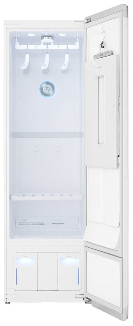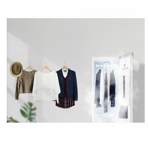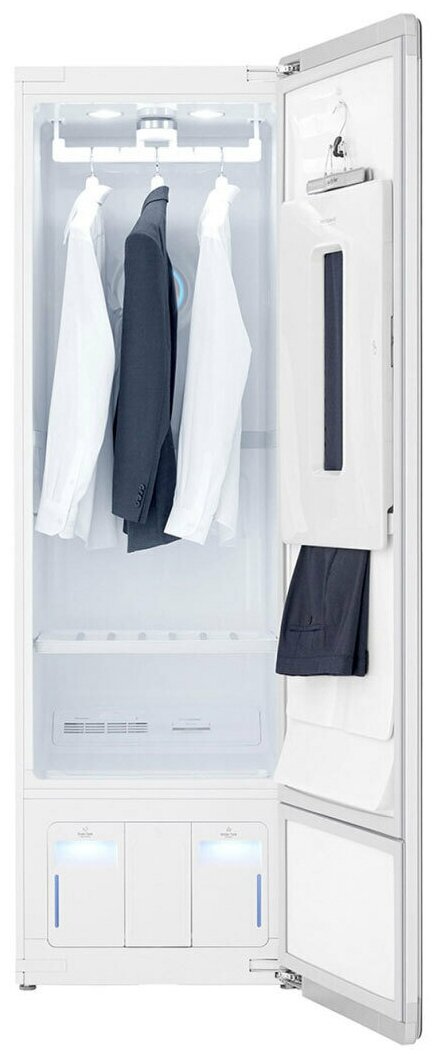 Количество программ - 4; Встроенный теплообменник; Сенсорная панель; Сбор конденсата в резервуар; Индикация времени до конца программы; Ворсовый фильтр; Индикация режима работы; Мобильная диагностика; Управление со смартфона; Воздухоотвод; Отвод конденсата в дренаж; Дополнительно в комплекте: вешалка для рубашек - 3 шт., пресс для брюк - 1 шт., лоток, вешалка для брюк - 1 шт