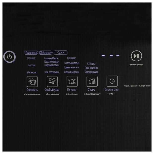 ворсовый фильтр, защита от детей, индикация времени до конца программы, индикация режима работы, мобильная диагностика, управление со смартфона