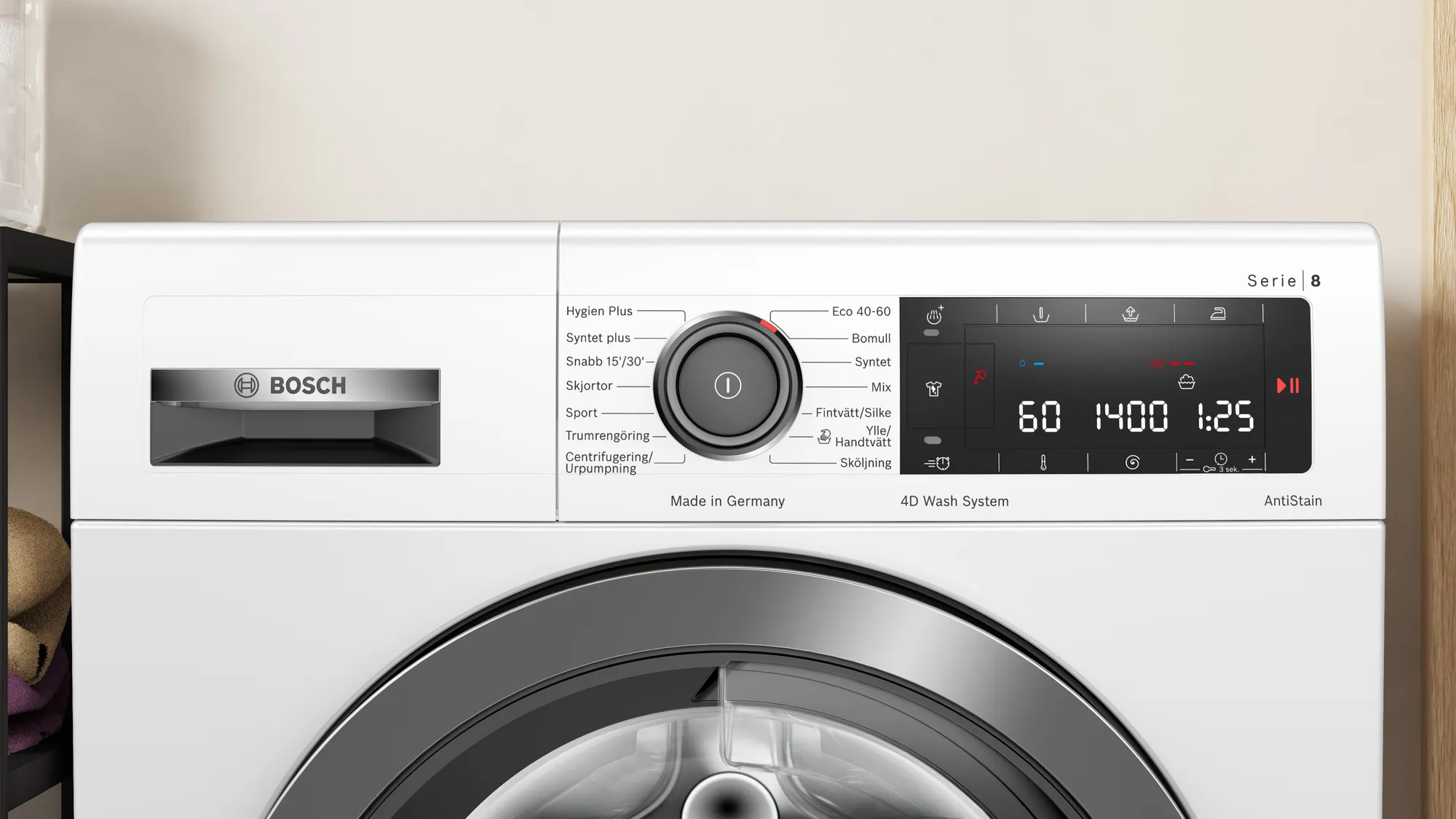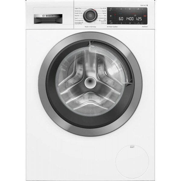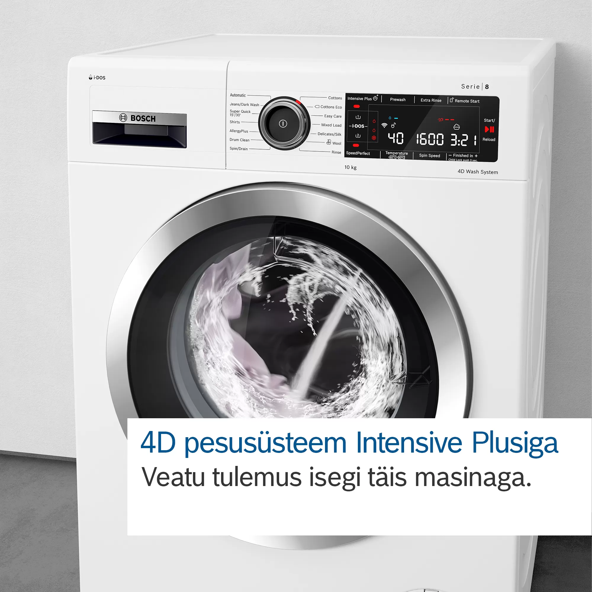 система управления водой ActiveWater Система управления водой ActiveWater Система управления водой ActiveWater встиральных машинах Bosch применяется для оптимизации объема заливаемой воды, электроэнергии ипродолжительности программы стирки путем точного определения количества белья, загруженного вбарабан. Информация овесе белья, атакже отипе ткани, передается всистему управления отвысокоточных многопозиционных датчиков-сенсоров, которые контролируют поступление воды вбак. Вихчисле имеется прессостат— датчик уровня воды, который посылает сигнал наблок управления, как только давление воды достигает определенного значения. Поэтому сигналу залив воды прекращается. Всистеме используется также проточный датчик, установленный назаливном шланге. Пообъему залитой воды рассчитывается нетолько вес загруженного белья, ноитип ткани, так как разные материалы способны по-разному впитывать воду. Для лучшего смачивания белья применяется запатентованный механизм впрыскивания. Таким образом, количество воды никогда небудет превышать норму: сокращение потребления может быть довольно значительным идостигать 12-15%. Добавление воды— например, для дополнительного полоскания— также производится автоматически. технология Antistain Технология Antistain Технология AntiStain— автоматическая система удаления пятен, реализованная встиральных машинах Bosch сфронтальной загрузкой. Как известно, разные виды пятен требуют разного подхода для ихполного исчезновения. Благодаря системе Antistain машина способна распознавать до16видов пятен иавтоматически настраивать для ихудаления основные параметры работы— такие, как температура, время замачивания, скорость вращения барабана. Для выведения загрязнений при этом ненужны дорогостоящие пятновыводители или другие дополнительные средства, атакже нетребуется отдельного предварительного замачивания белья. Вчисле загрязнений, скоторыми справляется эта технология— жировые пятна, следы крови, краски, травы, молока идетского питания, масла ишоколада, пятна отчая икофе, следы косметики. Неимеет значения, недавнее это пятно или застарелое. Отсутствие дополнительной химической обработки белья— большое преимущество при стирке детской одежды идля защиты оталлергии. Активировать AntiStain можно нажатием кнопки напанели управления после выбора основной программы. Машина сама подсказывает, совместимали данная опция спрограммой, выделяя кнопку подсветкой. 4D Wash System 4D Wash System Технология 4DWash используется встиральных машинах производства Bosch новейшей серии 8. Эта технология разработана для лучшего отстирывания белья при полной загрузке барабана, атакже для удаления особенно стойких исильных загрязнений. Принцип еедействия заключается вускоренном вращении барабана всамом начале цикла— так называемой фазе Spin Wash. Скорость вращения может достигать 150 оборотов вминуту, при этом белье равномерно распределяется постенкам барабана, так что вцентре образуется свободное место, своеобразный туннель. Наповерхность прижатого кстенкам белья дополнительно подается напрямую сильная струя воды срастворенным вней заранее моющим средством. Происходит активное смачивание белья без пропущенных участков, азагрязнения успешно удаляются под напором струи. Дальнейшие этапы стирки производятся обычно, всоответствии свыбранной программой. 