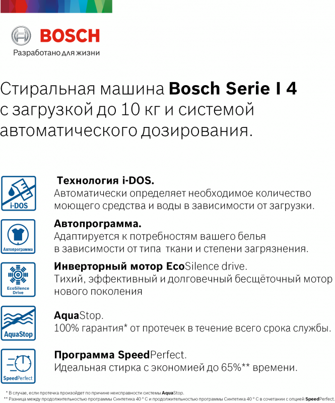 автоматическая дозировка моющего средства, выбор скорости отжима, выбор температуры стирки, контроль баланса, контроль за уровнем пены, отложенный старт, очистка барабана, сигнал окончания стирки