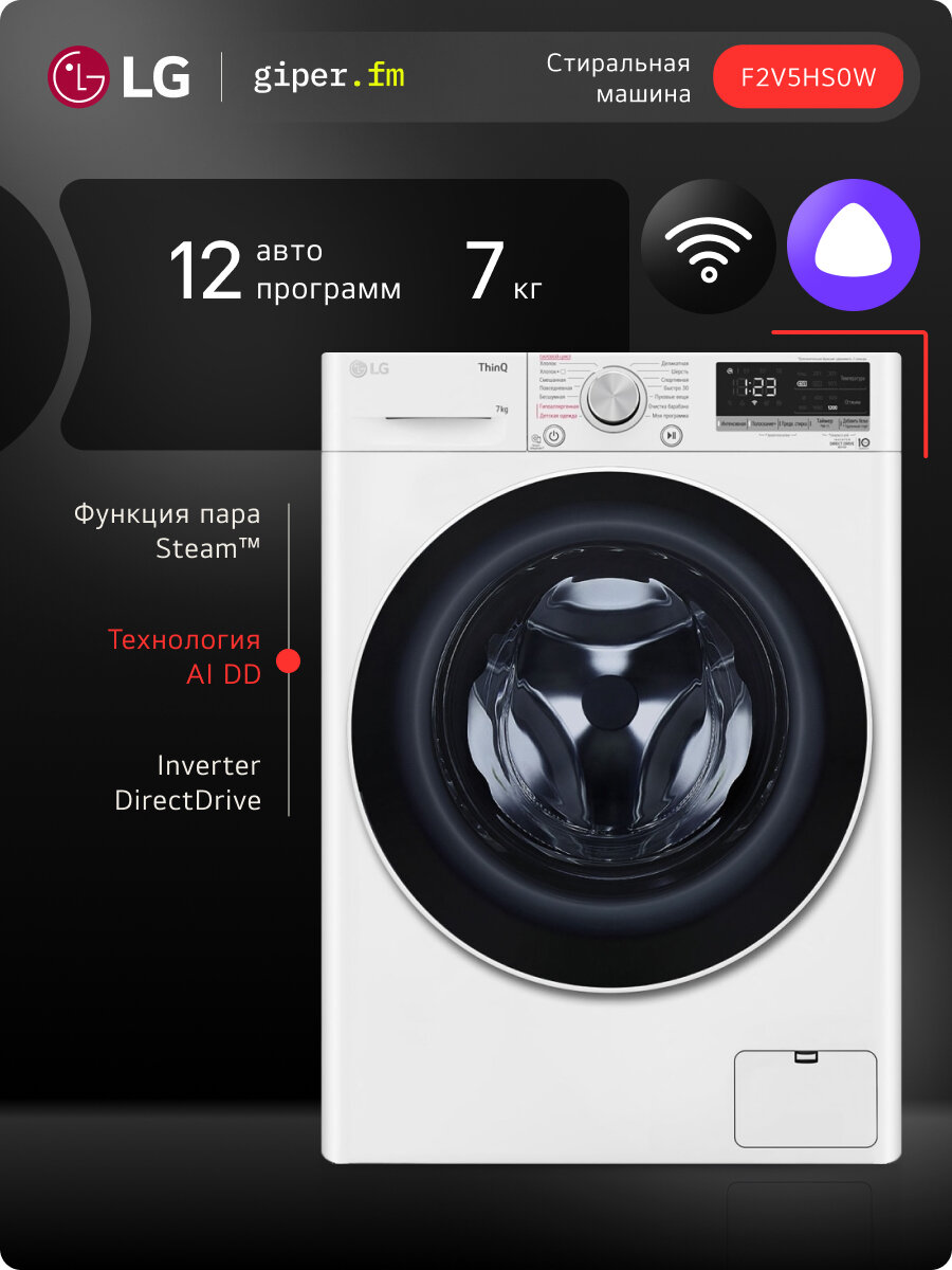 возможность управления через приложение SmartThinQ; технология LG Steam™; функция очистки барабана; Wi-Fi
