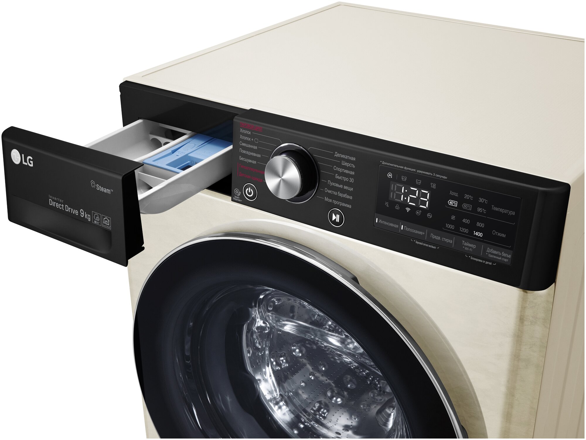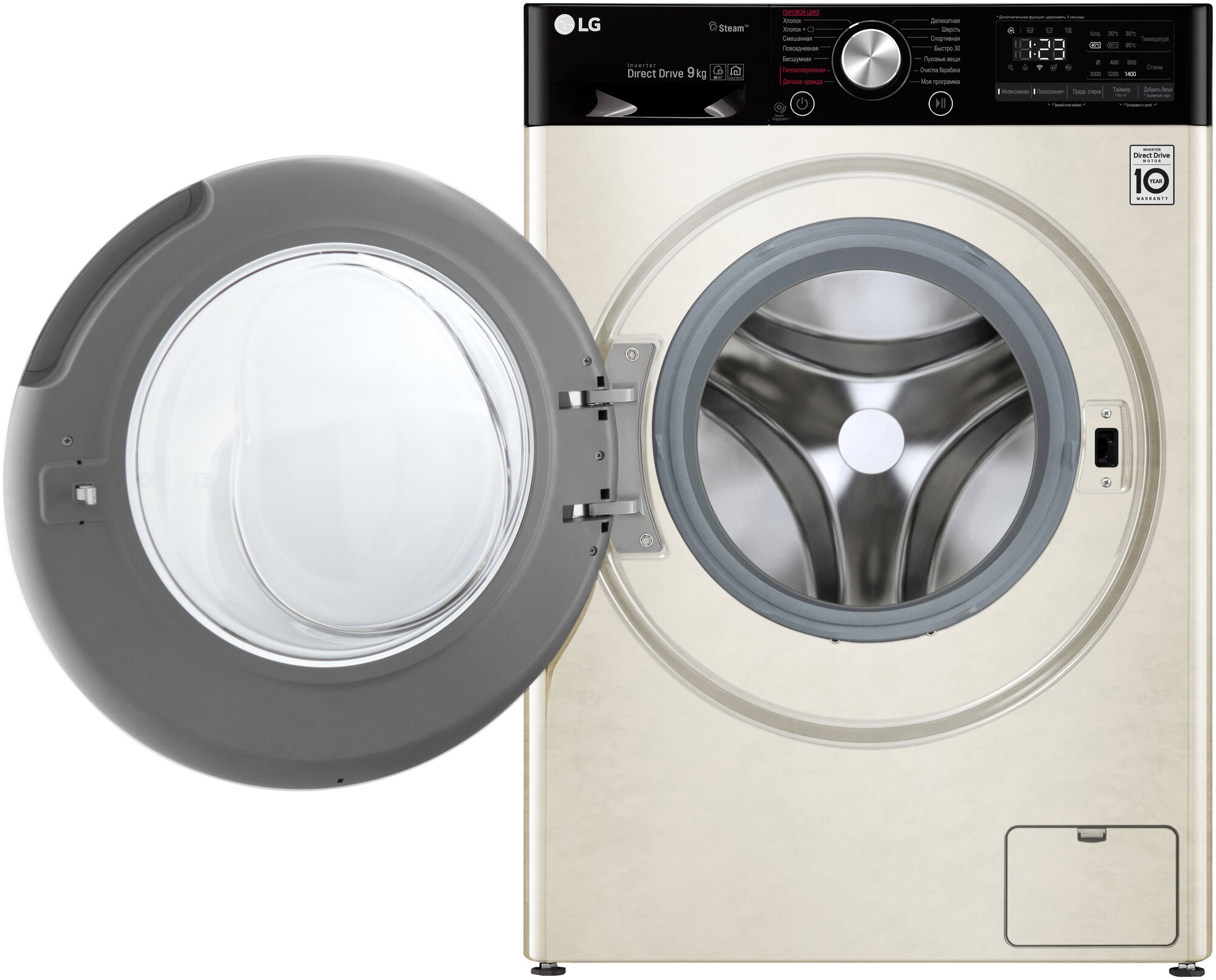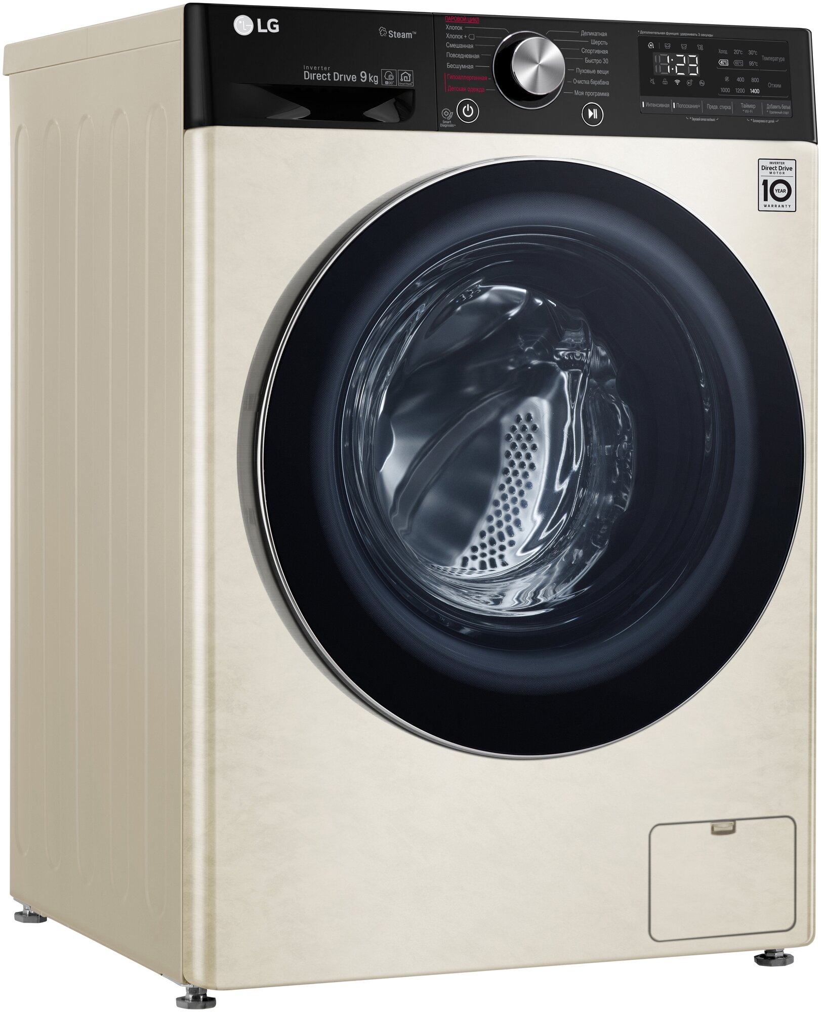 энергопотребление 1.35 кВт/ч; возможность управления через приложение SmartThinQ; программа очистки барабана; "моя программа"; функция пара Steam; Wi-Fi