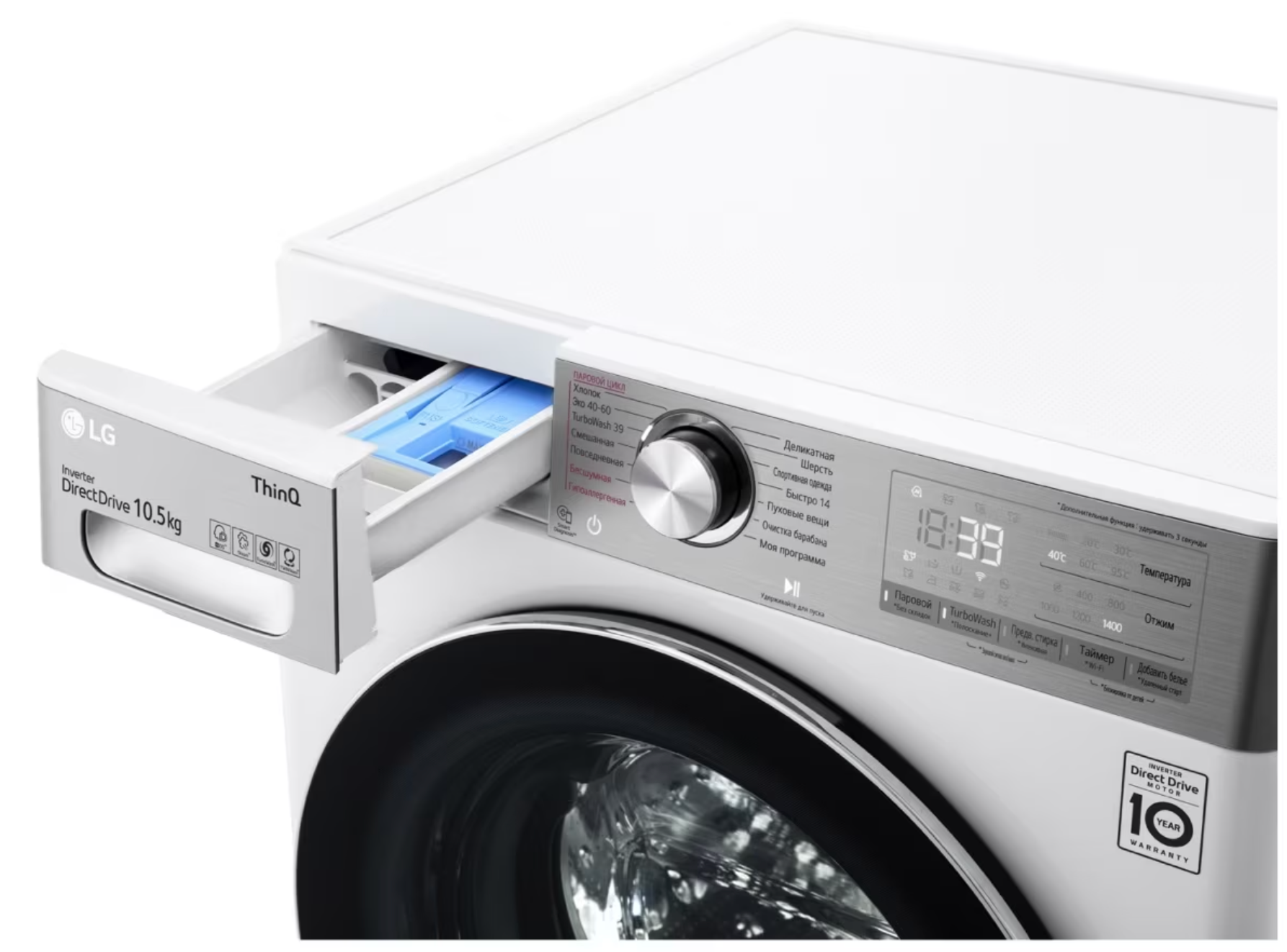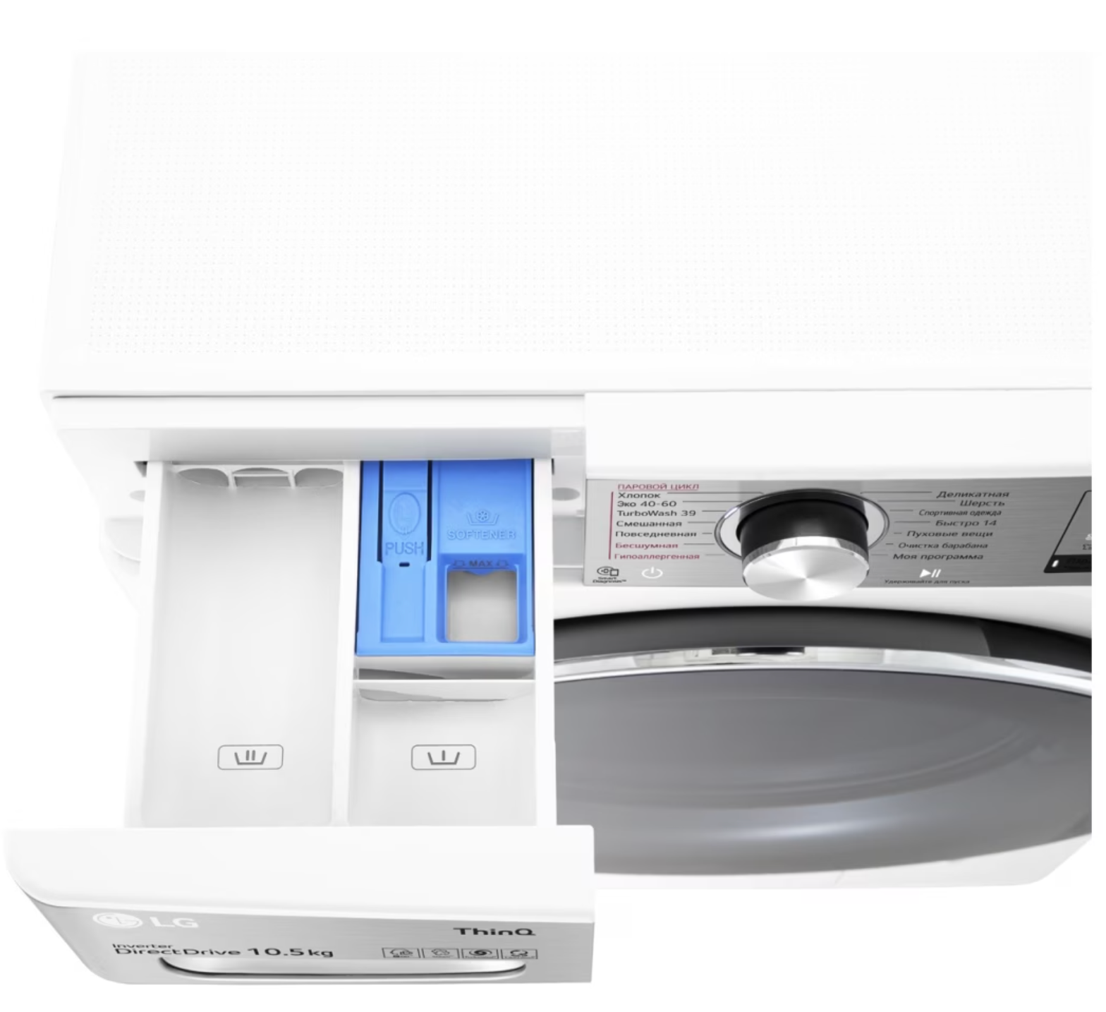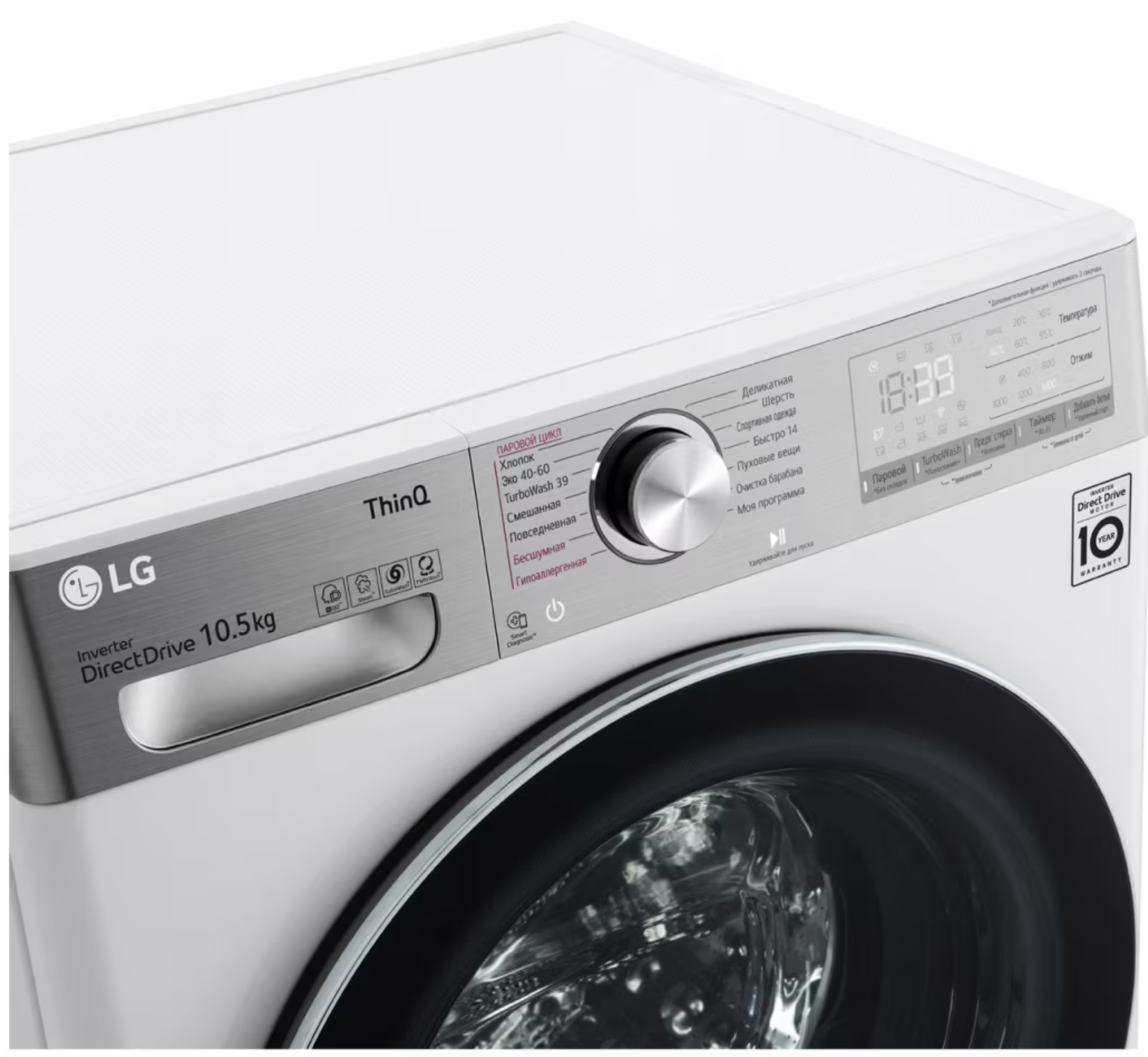 интеллектуальная система определения типа ткани AI DD, функция быстрой стирки TurboWash 360, технология LG Steam+: удаление складок, защита от аллергенов, функция "Добавить белье", мобильная диагностика Smart Diagnosis, предварительная стирка, интенсивная стирка, полоскание+, паровая стирка, добавить белье, турбо стирка