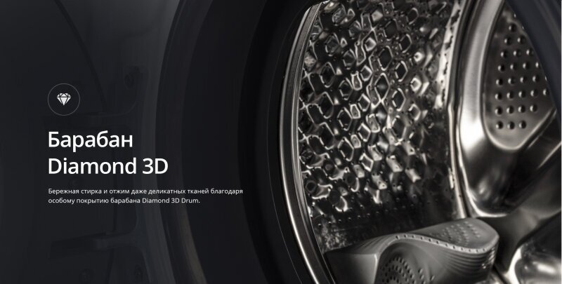 покрытие барабана Diamond 3D Drum, Brushless DC electric motor (бесколлекторный электродвигатель постоянного тока); материал барабана - нержавеющая сталь