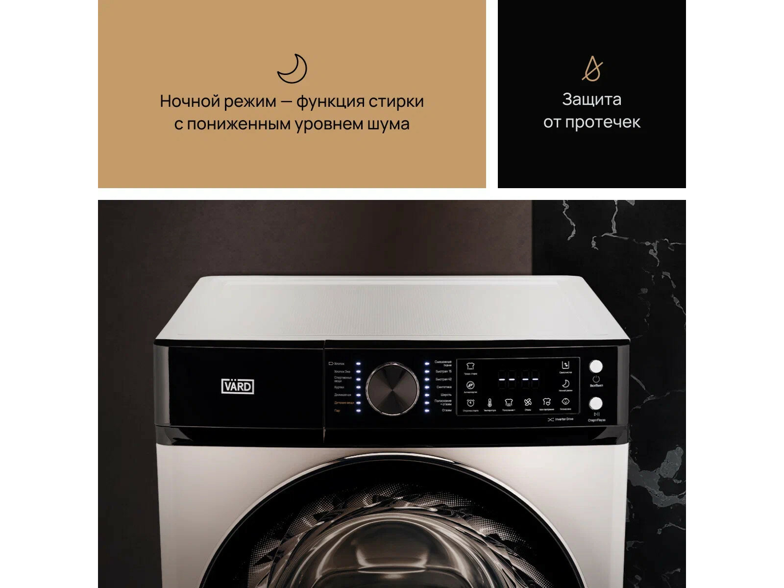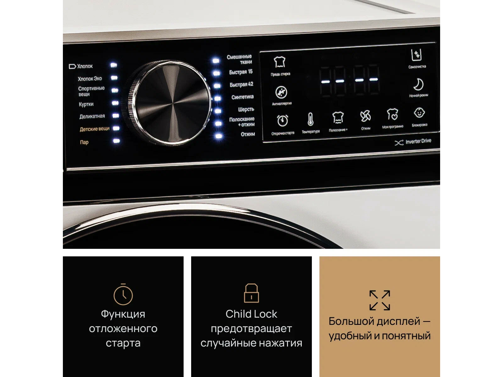 Изменение времени программ; Индикация ошибок; Контроль пенообразования; Ночной режим; Сотовый барабан;