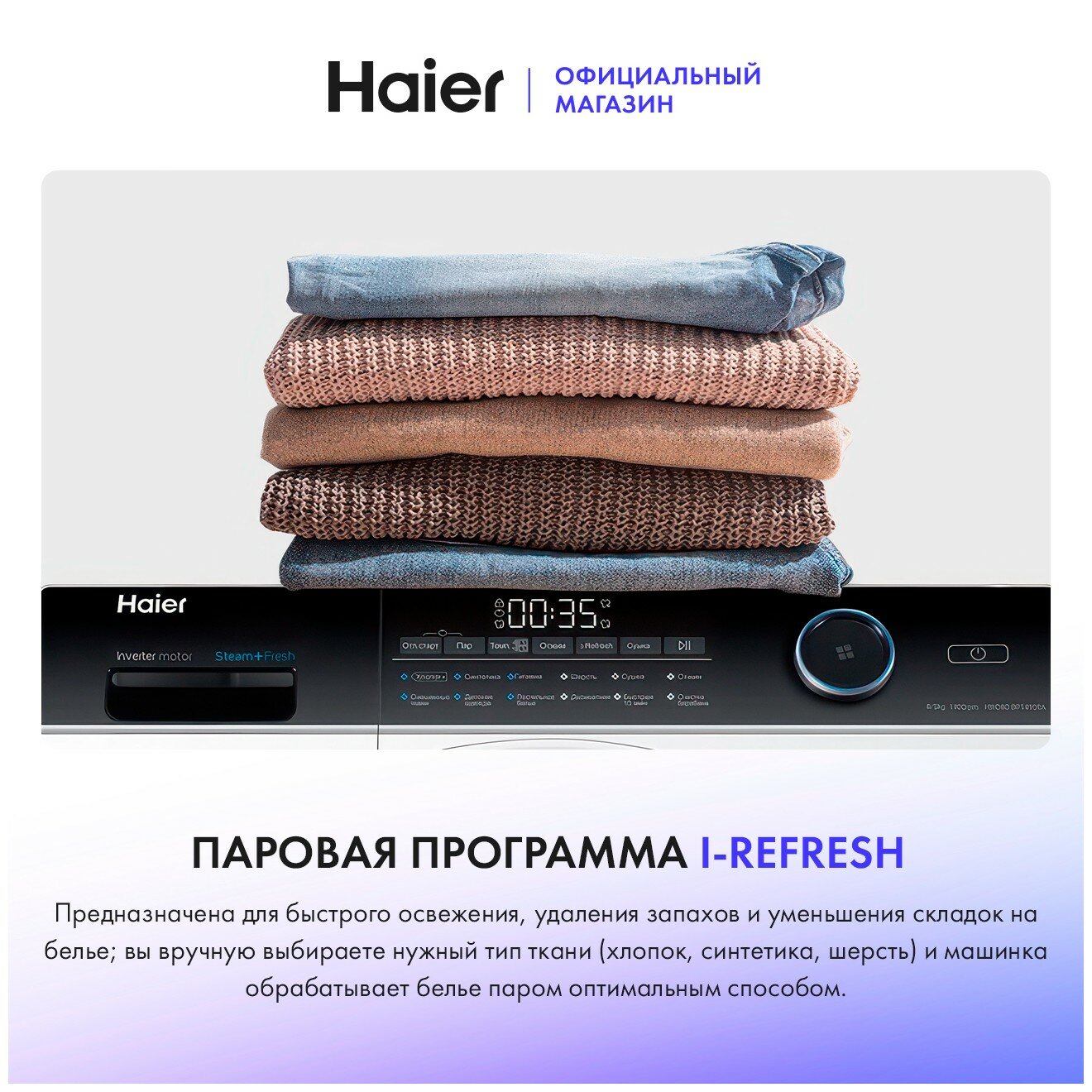 энергопотребление за цикл - 0.65 кВтч, за цикл с сушкой - 6.3 кВтч; i-Refresh - паровой цикл