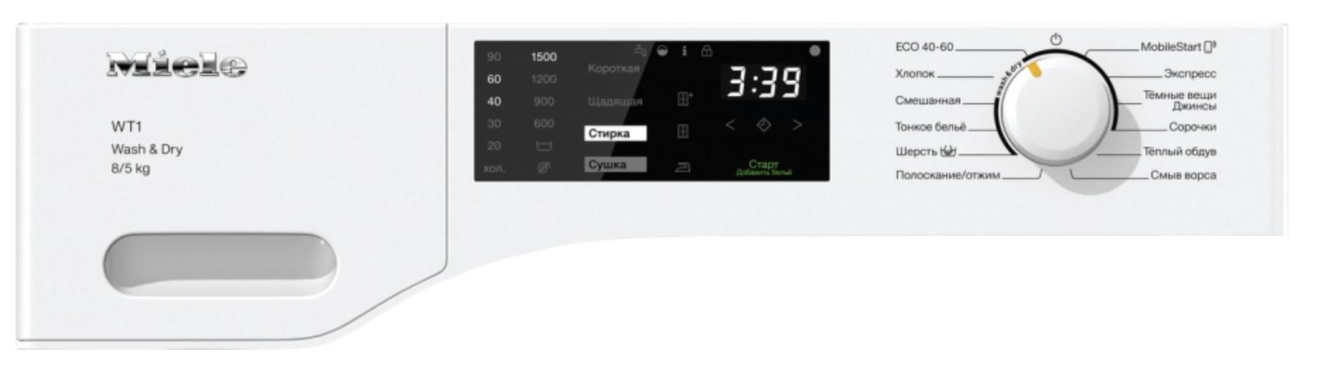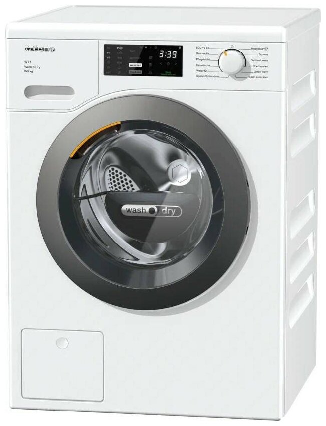 От Миле WTD163 WCS отличается только цветом дверцы. Управление производится при помощи поворотного переключателя и сенсорного дисплея DirectSensor. Технология PerfectCare гарантирует бережный и эффективный уход за бельём. Система Miele@home позволяет управлять прибором удаленно.