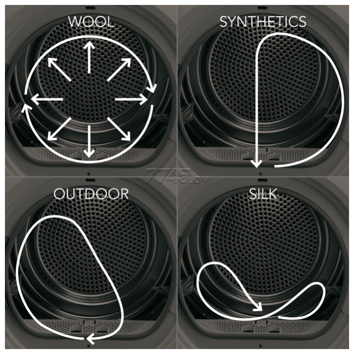 контроль влажности, отложенный старт, предотвращение сминания, реверсивное вращение барабана, сбор конденсата